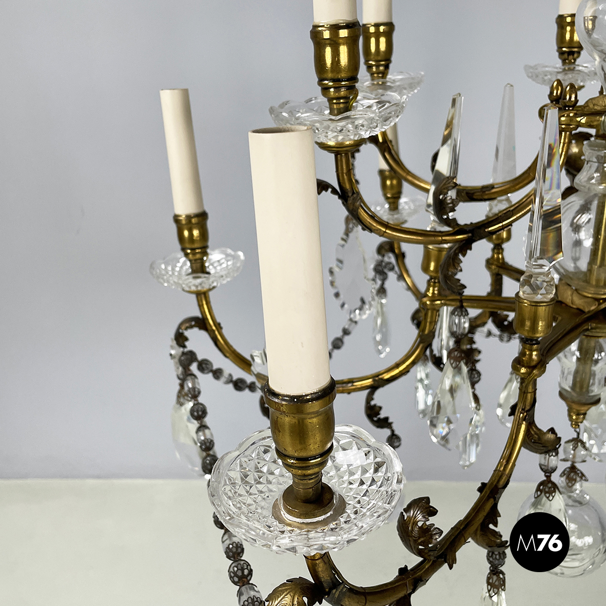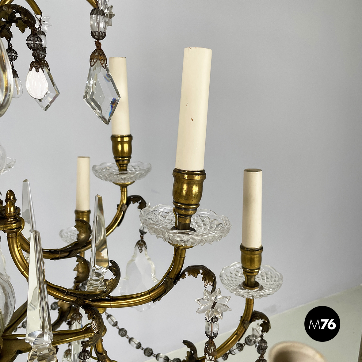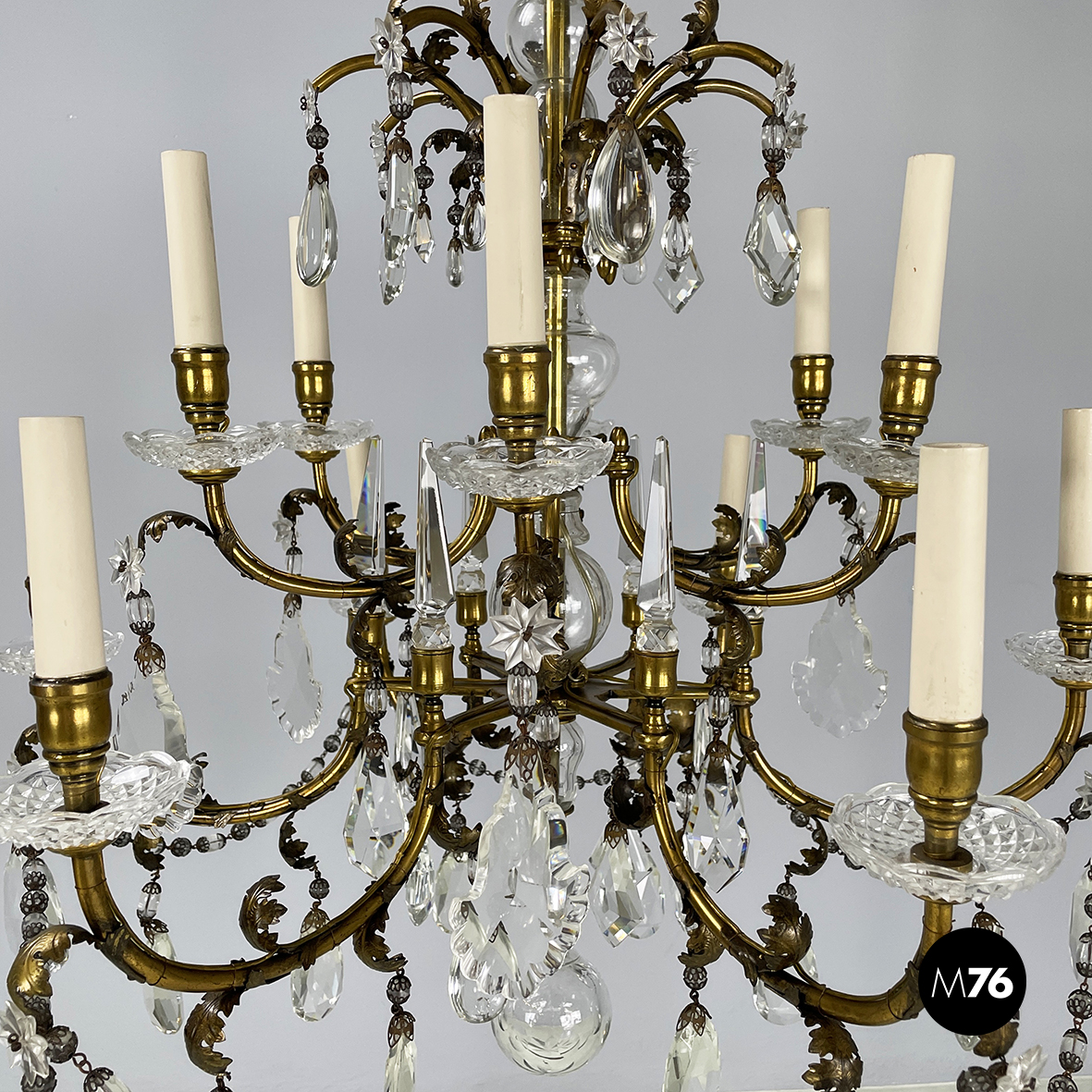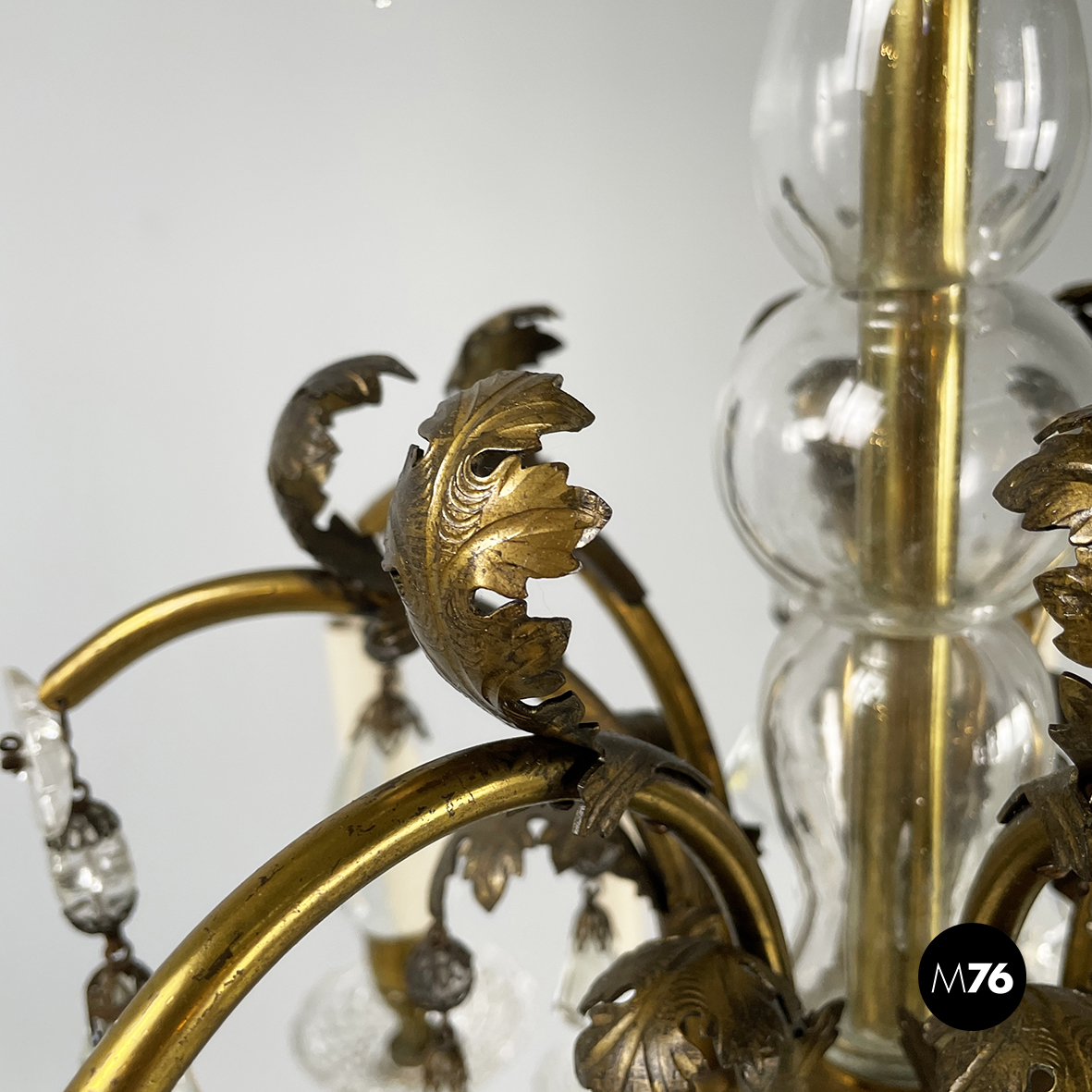 Lampadario a gocce a base tonda. La struttura in ottone è composta un tubolare di ottone centrale con dodici bracci curvi divisi su due piani di altezze differenti e bracci più corti con decorazione a foglie. Ognuno dei dodici bracci presenta un punto luce a forma di candela co. Su tutta la struttura si articolano gocce di vetro catenelle metalliche con perline di vetro tondeggianti e a forma di fiore e coppette decorative. L’attacco al soffitto è in ottone.