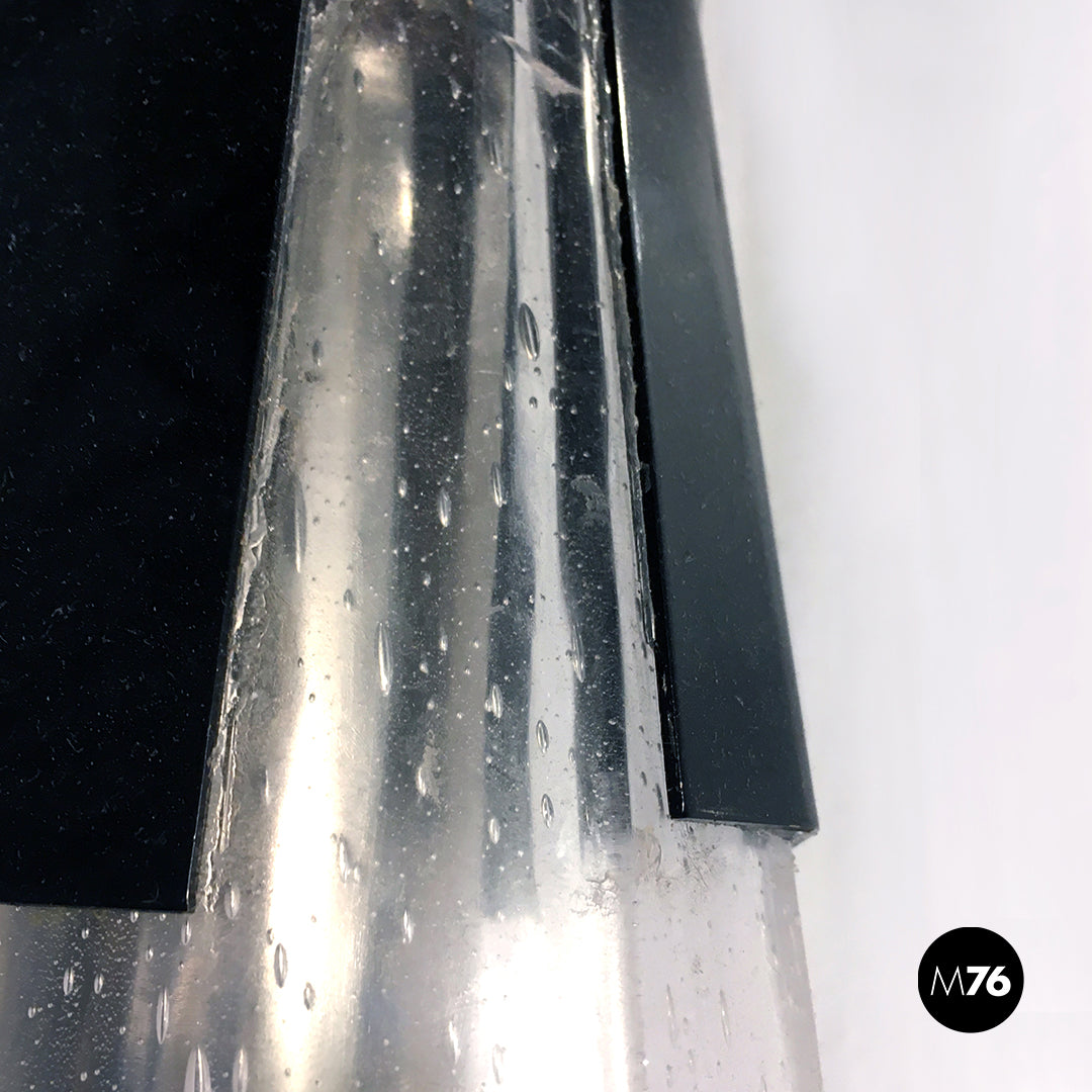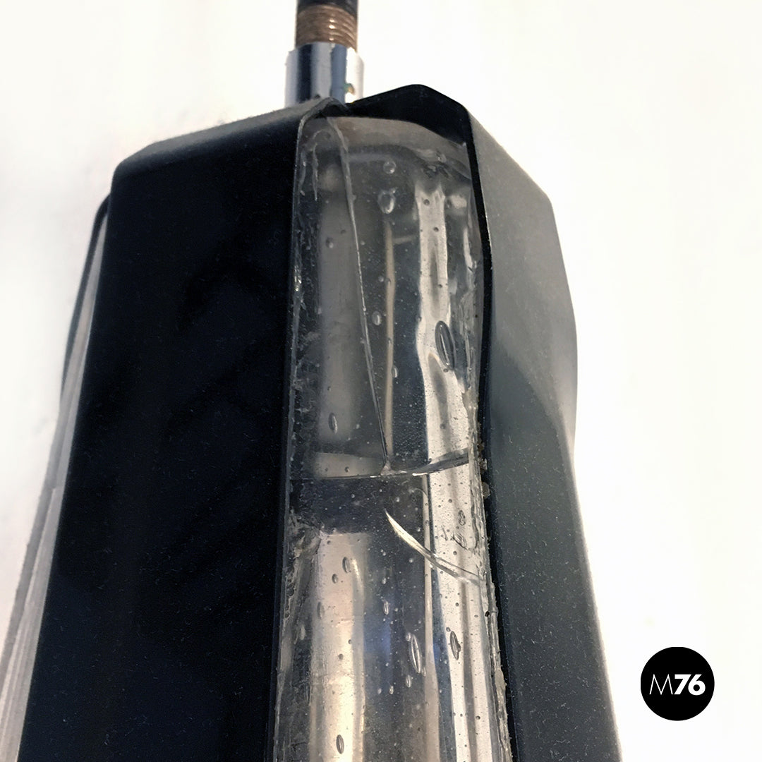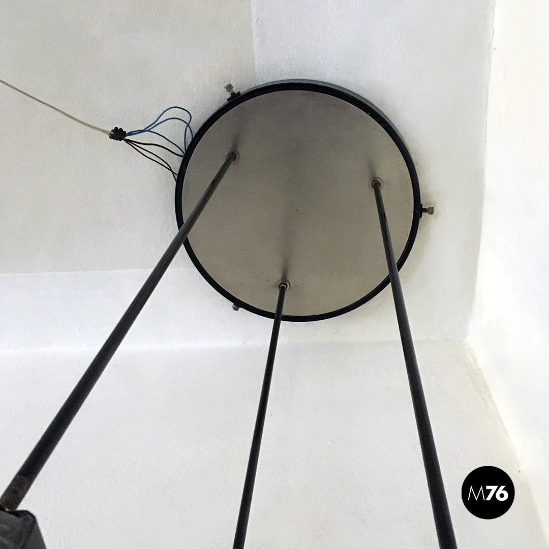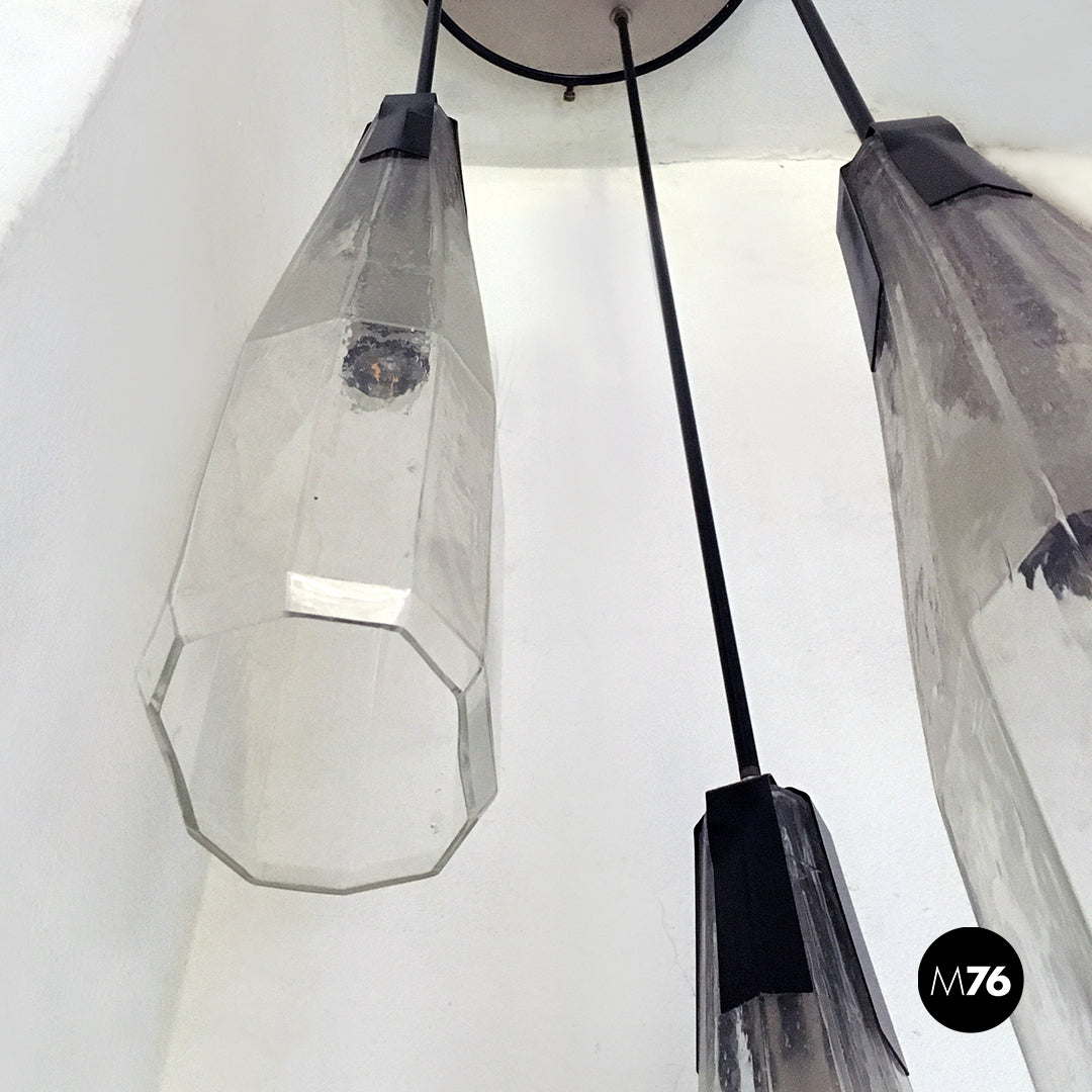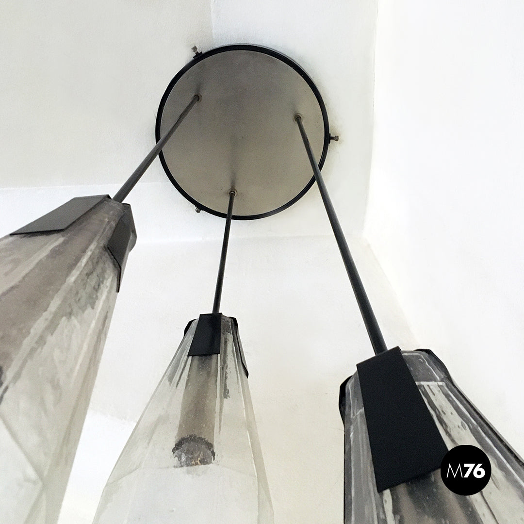Lampadario a tre luci con steli in tondino di metallo nero plafone tondo in acciaio satinato e vetri di Murano stampati a base decagonale.