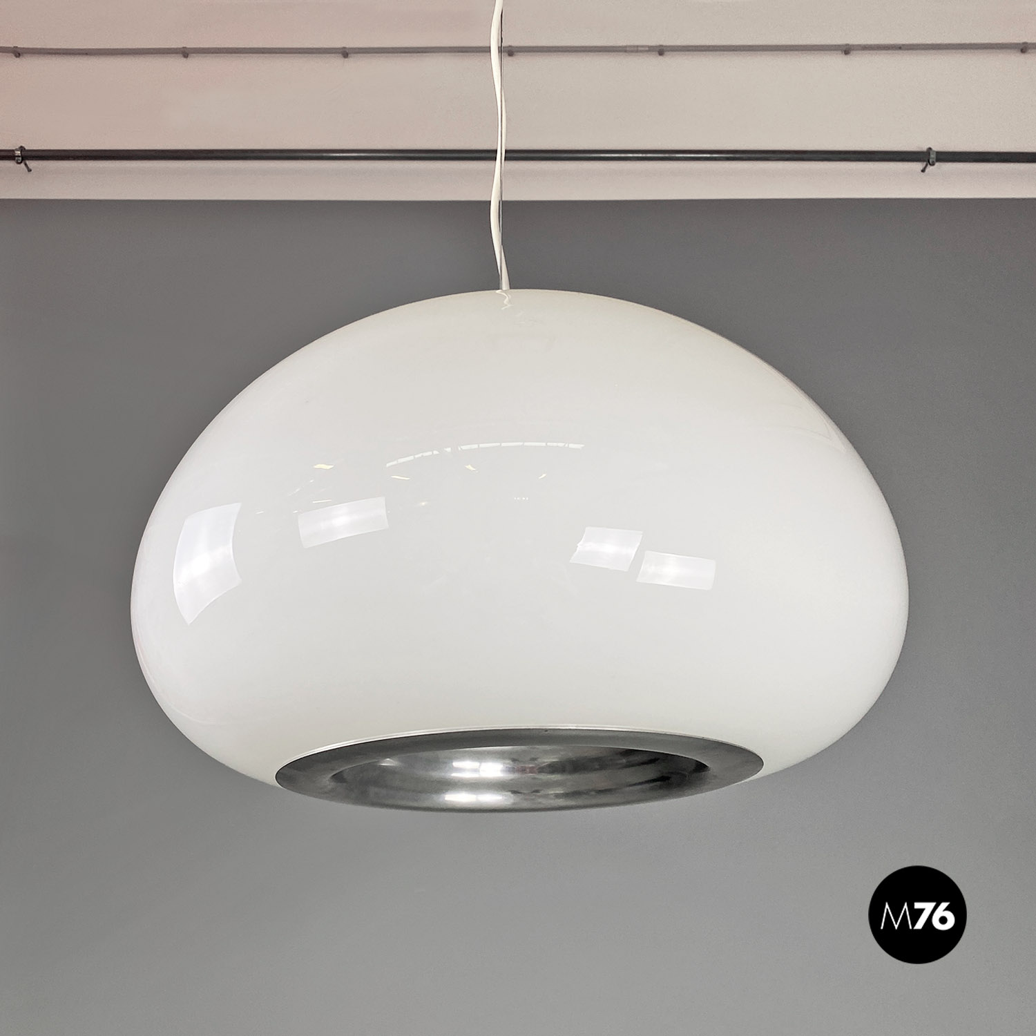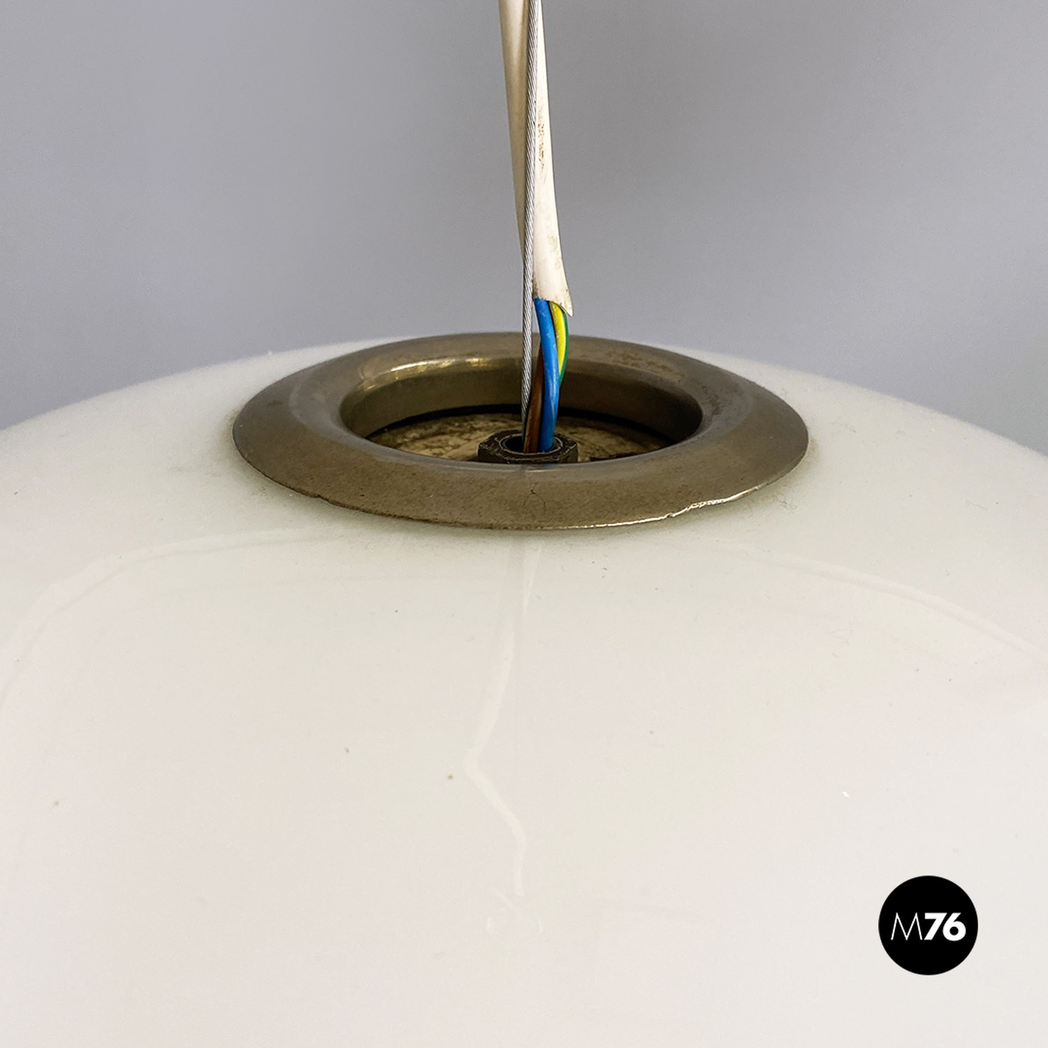 Lampadario modello Black and White con diffusore di forma tondeggiante in vetro opalino contenente due attacchi E27. La parte inferiore è in metallo ed è provvista di un altro attacco E27 centrale ed esterno.