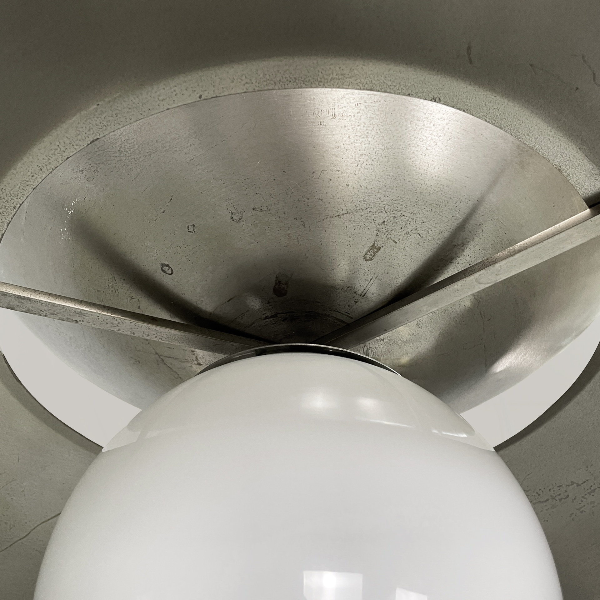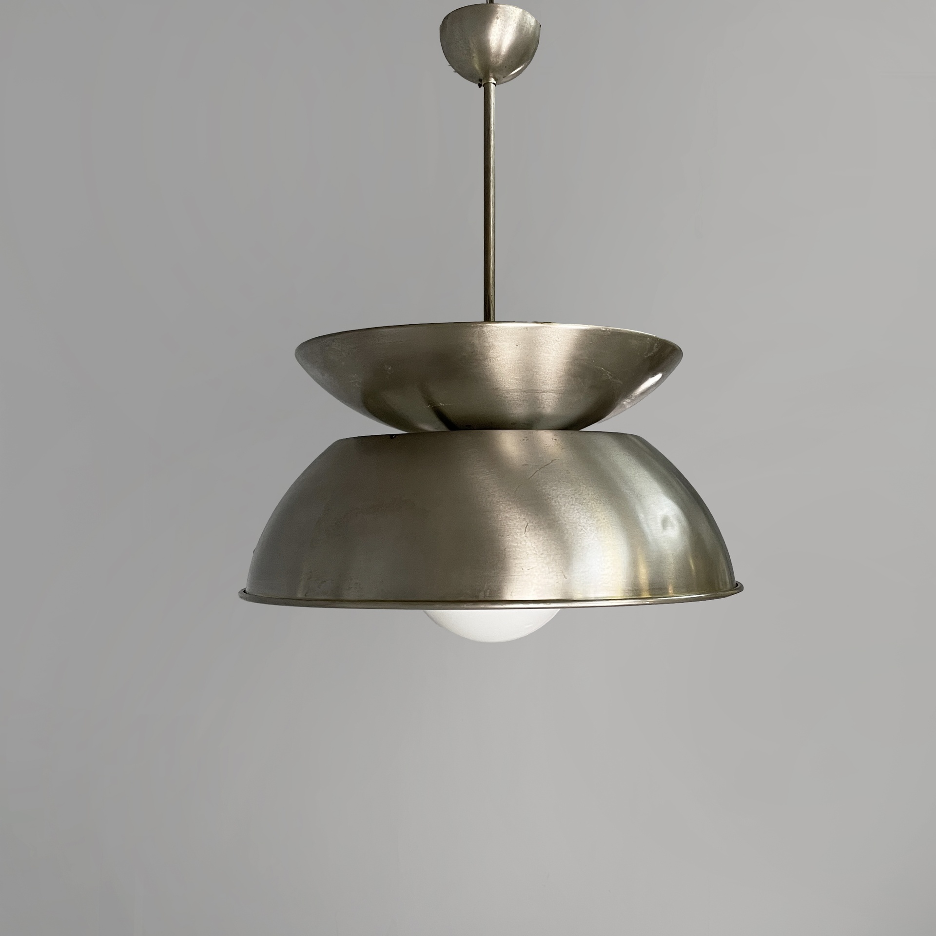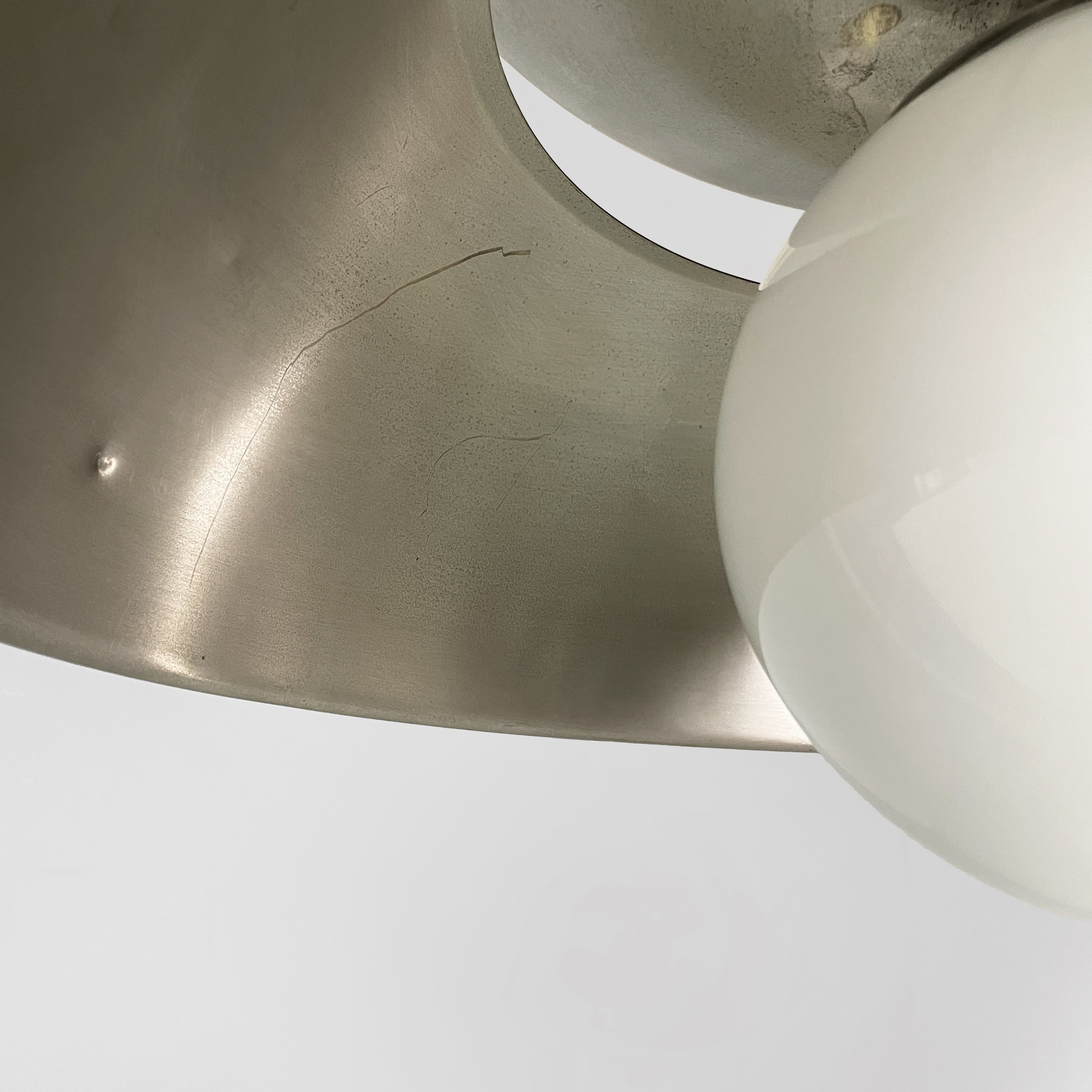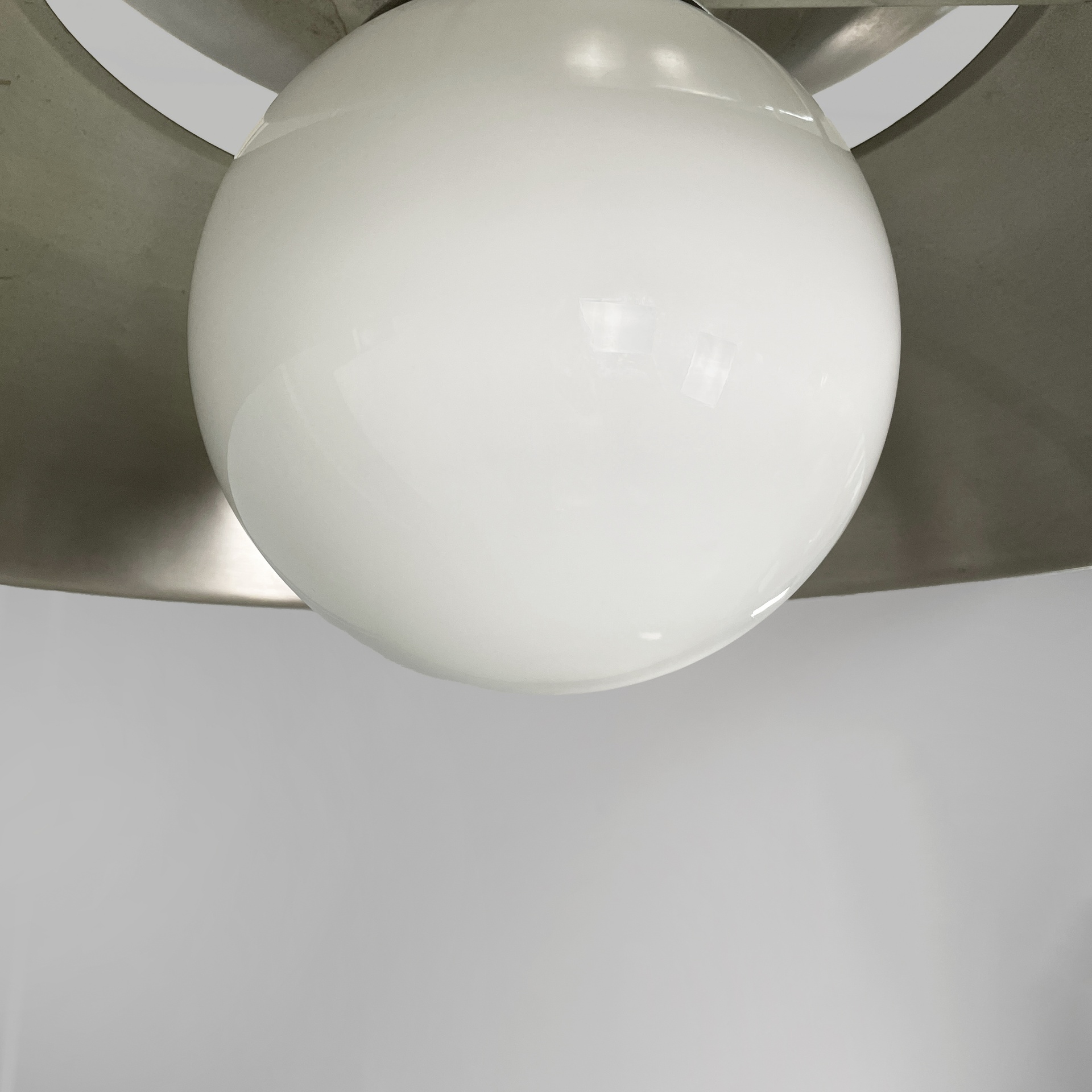 Lampadario modello Cetra con diffusore sferico in vetro opalino. La struttura è composta da due semisfere in metallo satinato. Nella semisfera superiore sono presenti tre lampadine. Stelo a sezione tonda e attacco a soffitto a base tonda in metallo satinato.