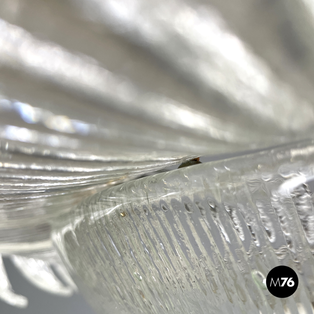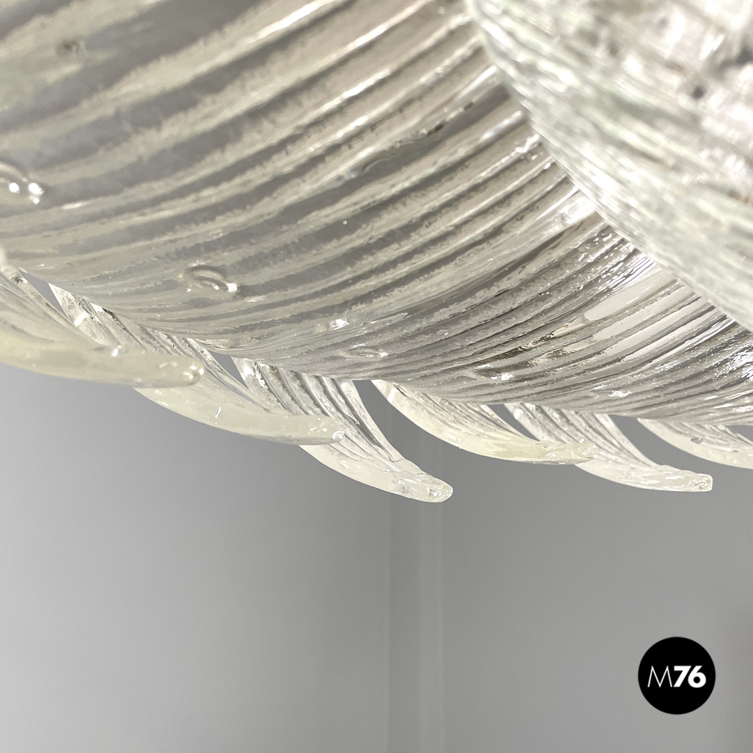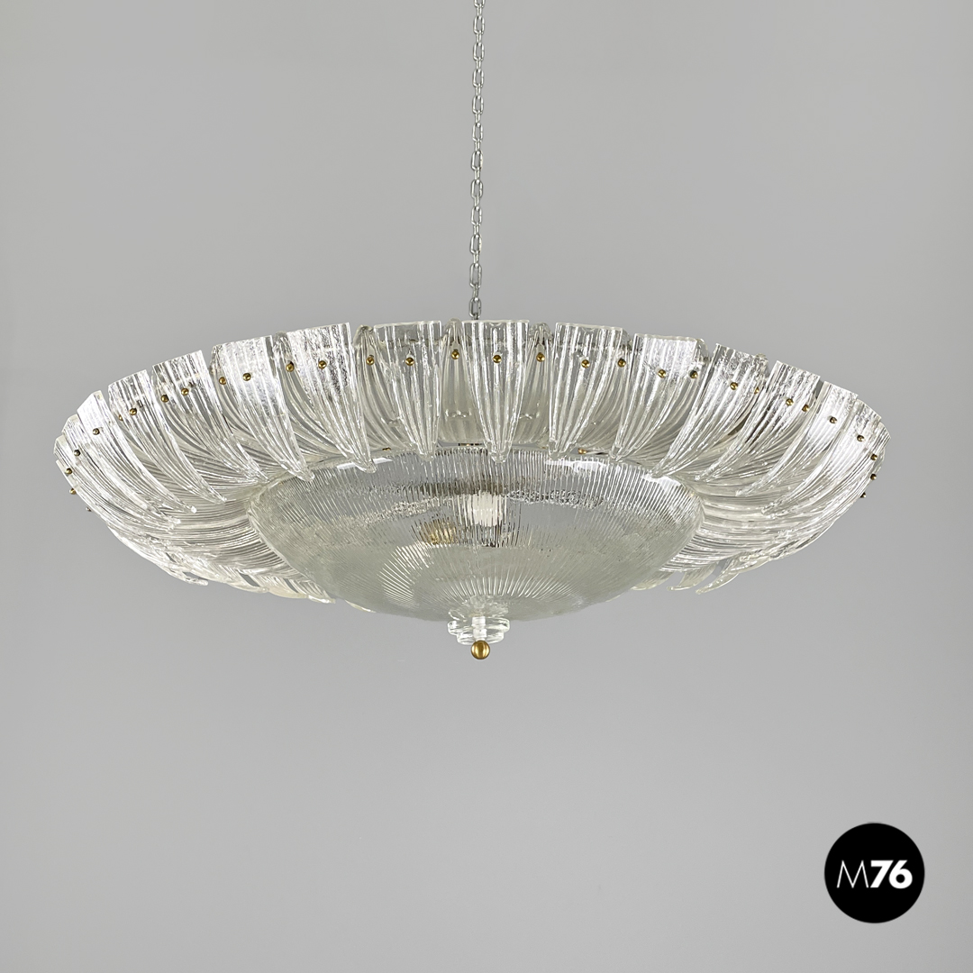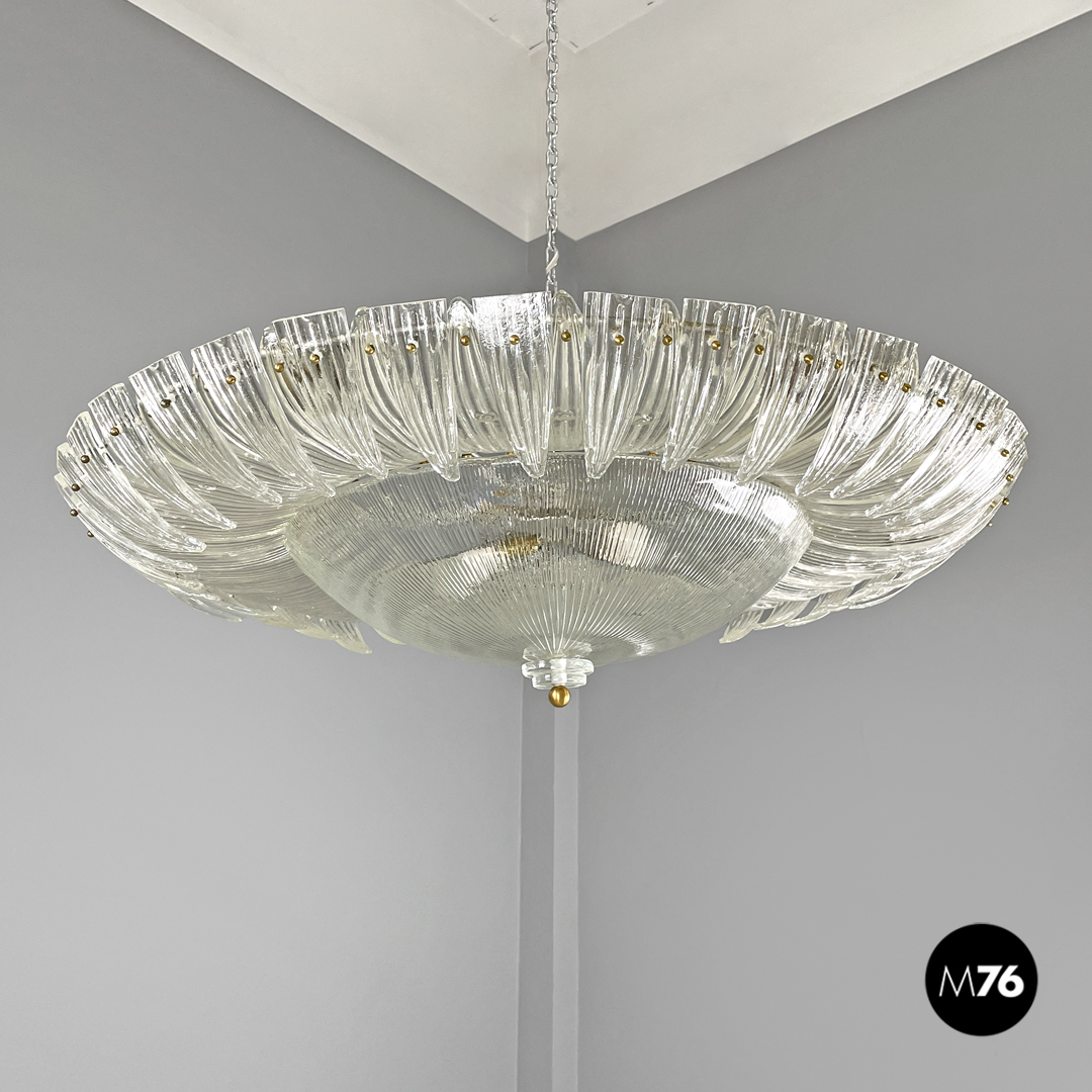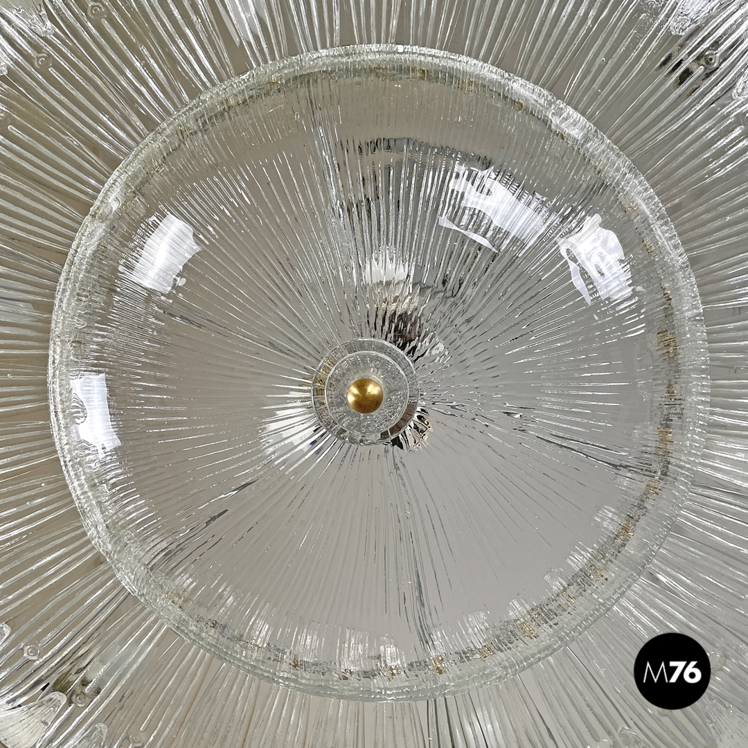 Lampadario tondo o plafoniera in vetro di Murano trasparente che ricorda la forma di un fiore. La fila esterna è composta da elementi dalla forma triangolare sagomata con incisioni verticali decorative che si sviluppano verso l’interno del lampadario. La fila più interna è composta dagli stessi “petali” ma dalla forma più allungata mentre al centro si trova una cupola rovesciata con le stesse decorazioni incise con due dischi di vetro trasparente ed una sfera in metallo dorato. La struttura portante è in metallo.
