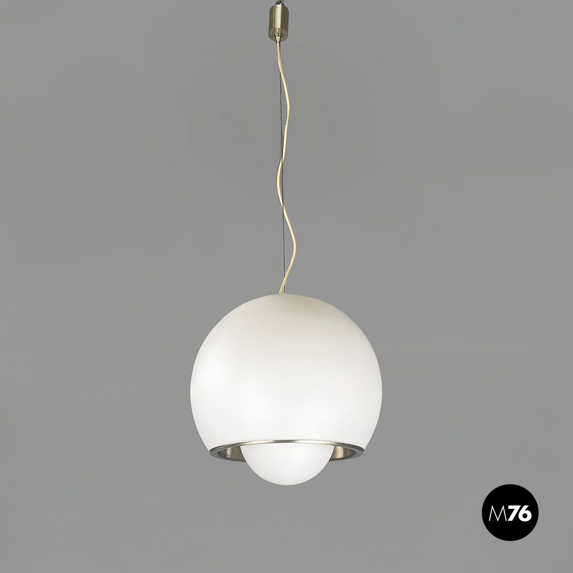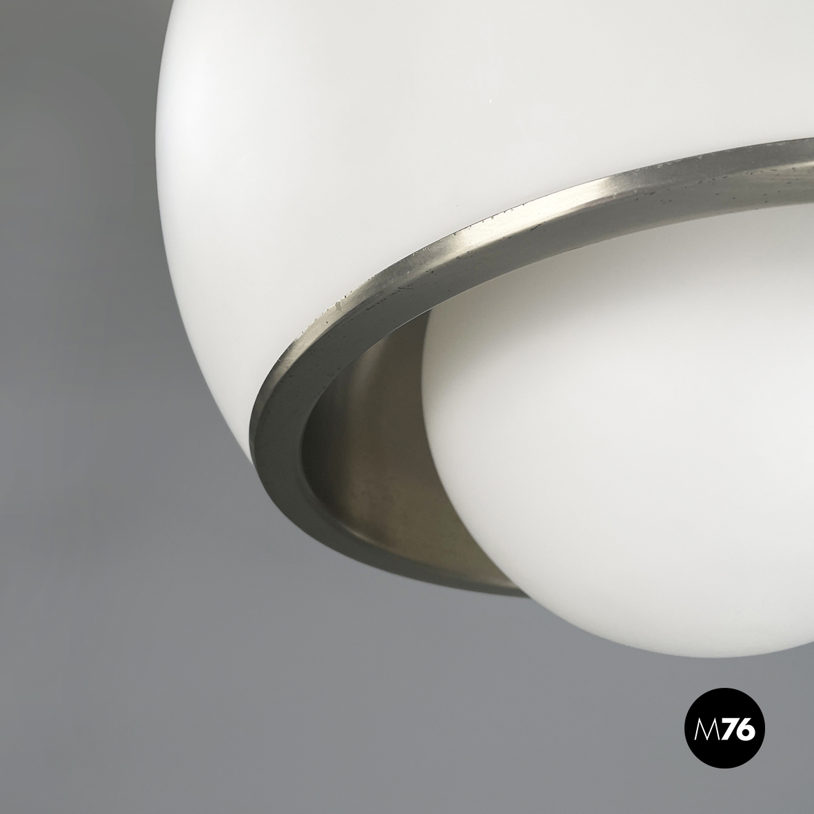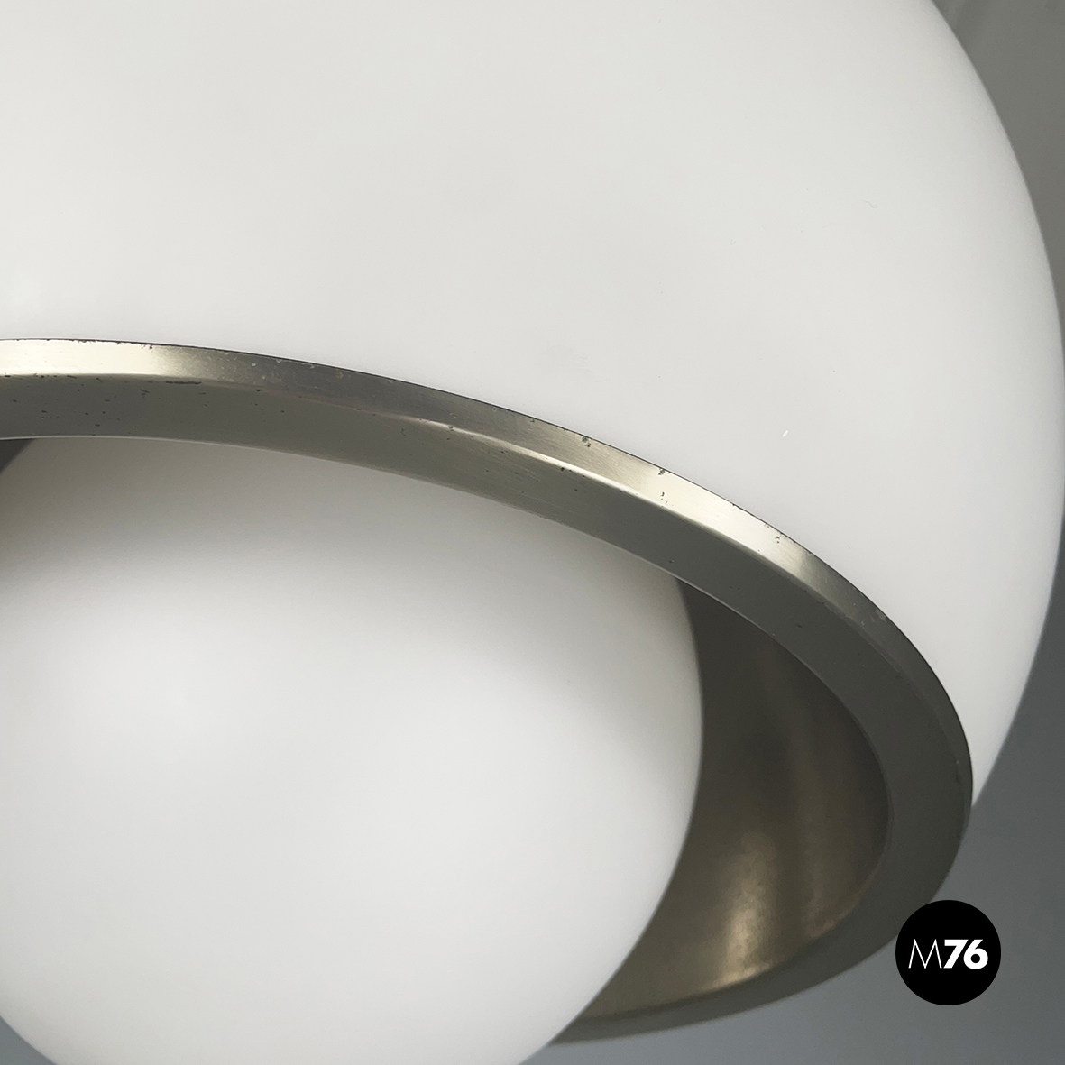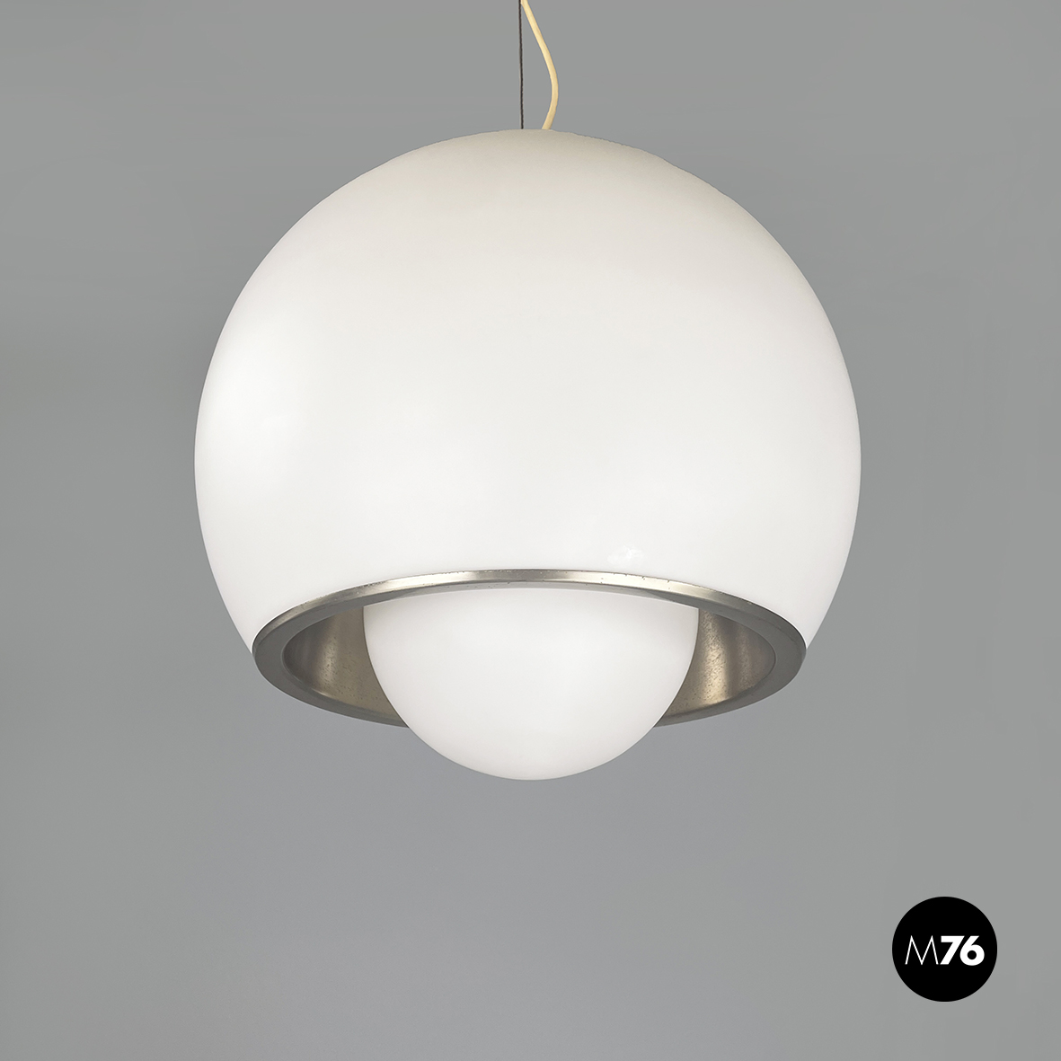 Lampadario in vetro opalino opaco e acciaio. Il diffusore a cupola presenta al centro una fascia in acciaio cromato e sotto una sfera in vetro opalino. All’interno del diffusore sono presenti sette lampadine E27. Attacco al soffitto cilindrico in acciaio.