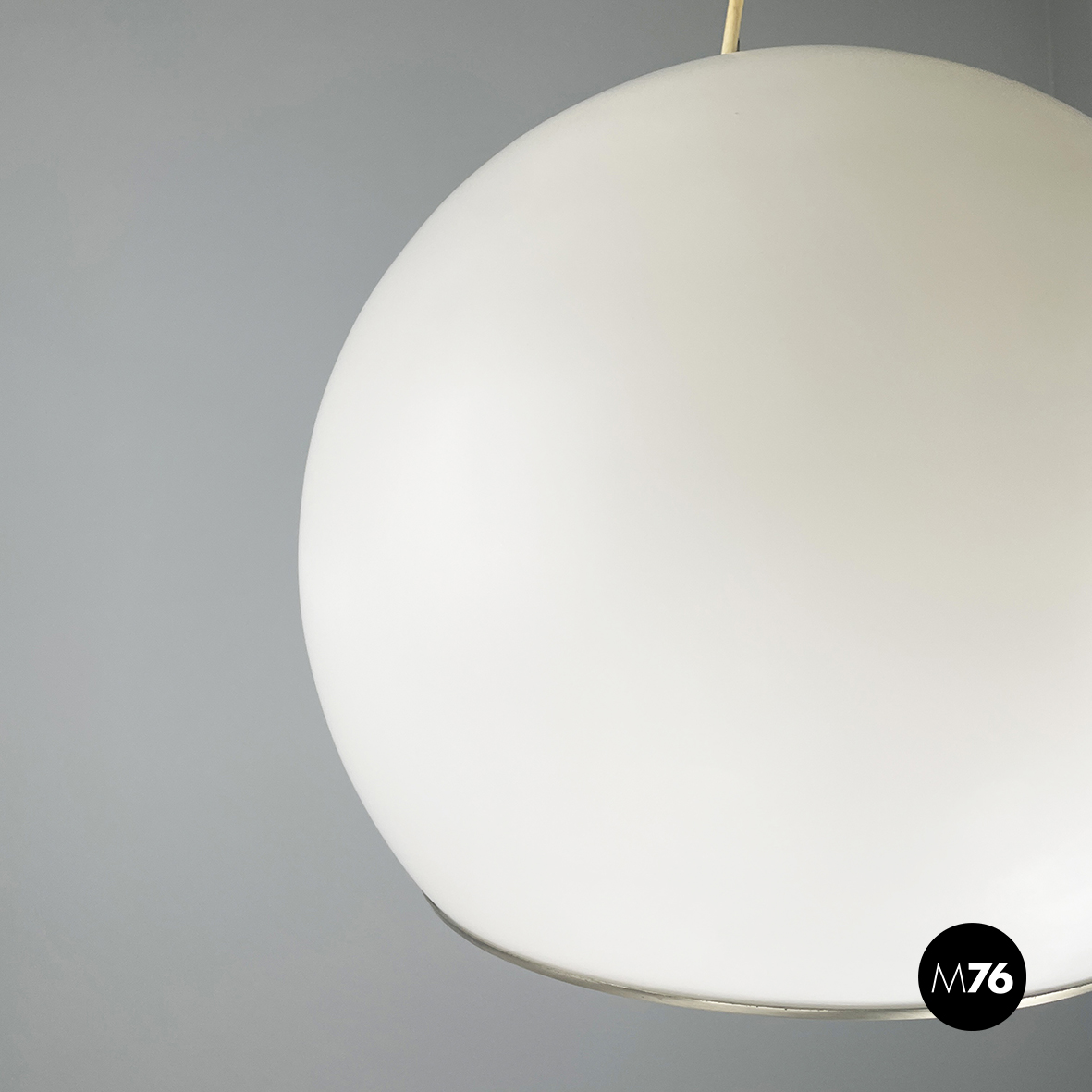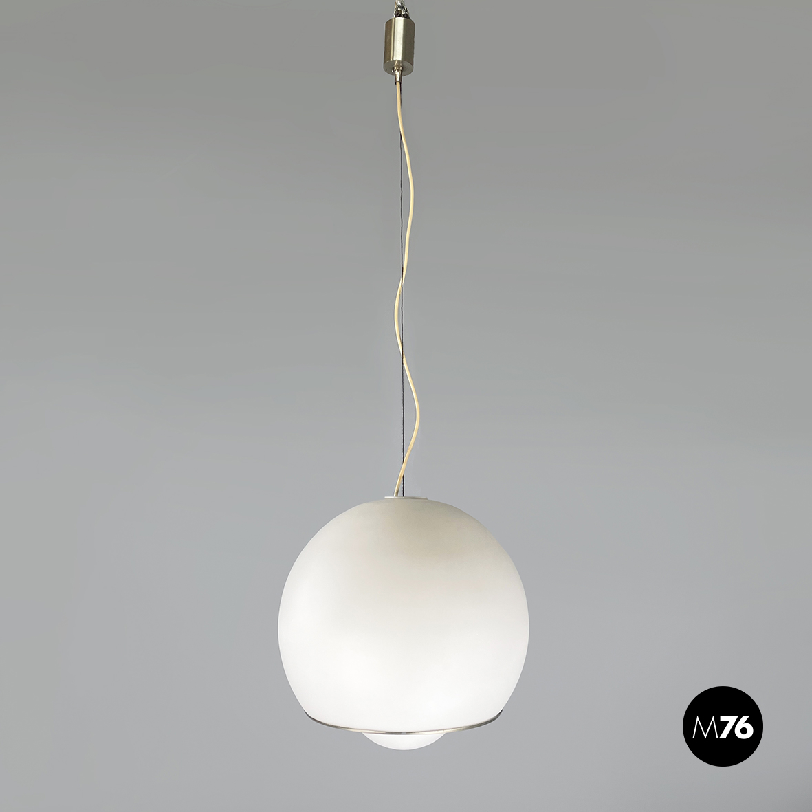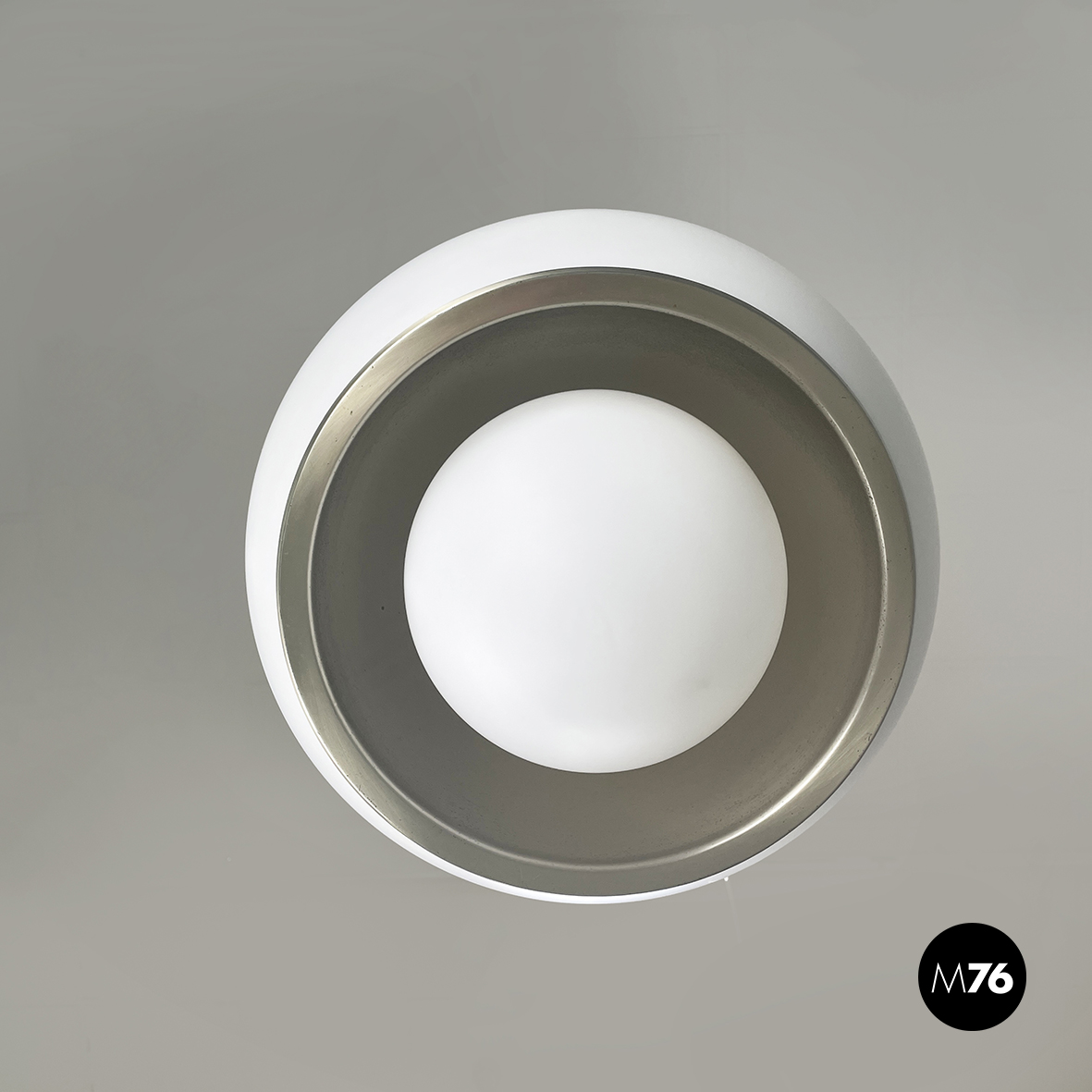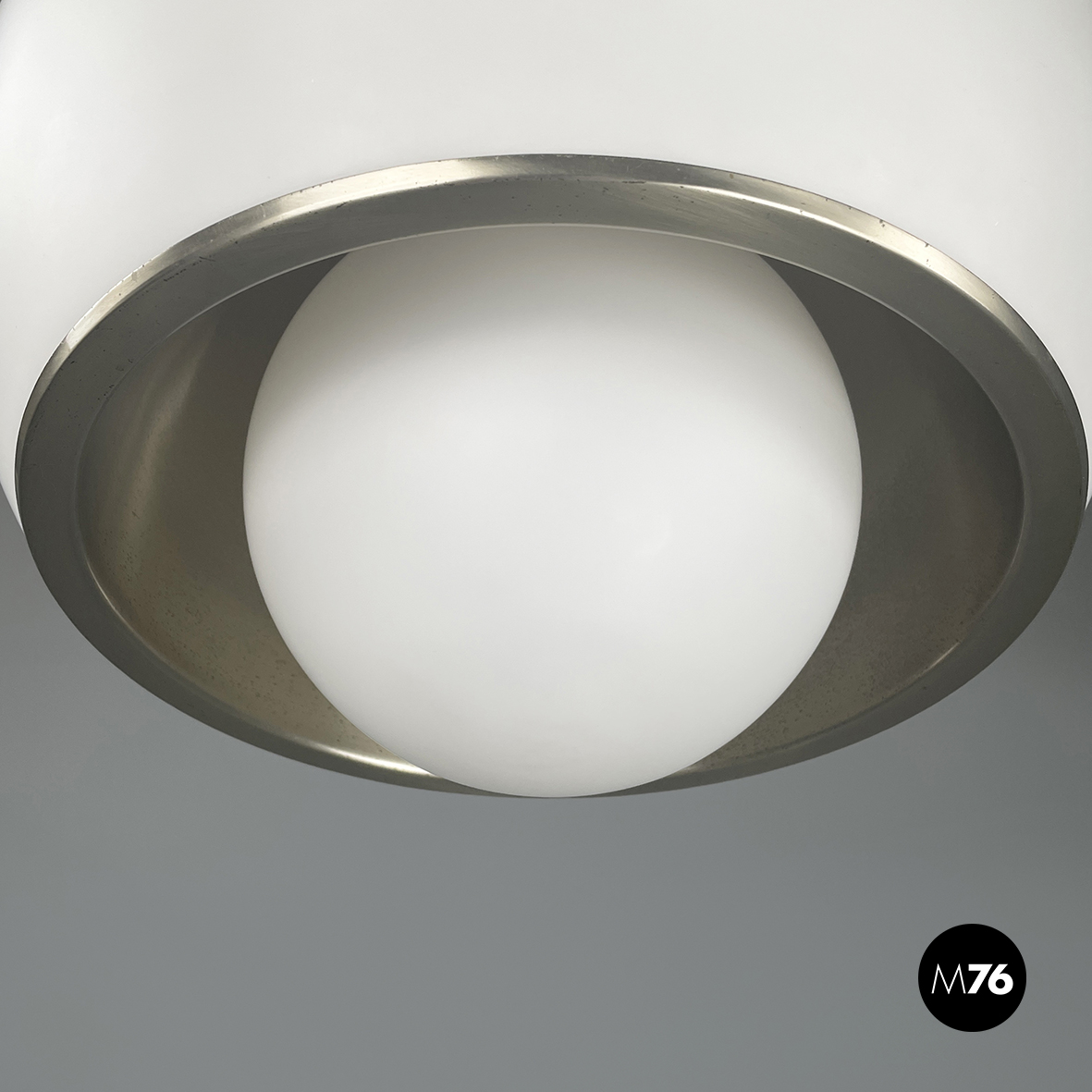 Lampadario in vetro opalino opaco e acciaio. Il diffusore a cupola presenta al centro una fascia in acciaio cromato e sotto una sfera in vetro opalino. All’interno del diffusore sono presenti sette lampadine E27. Attacco al soffitto cilindrico in acciaio.