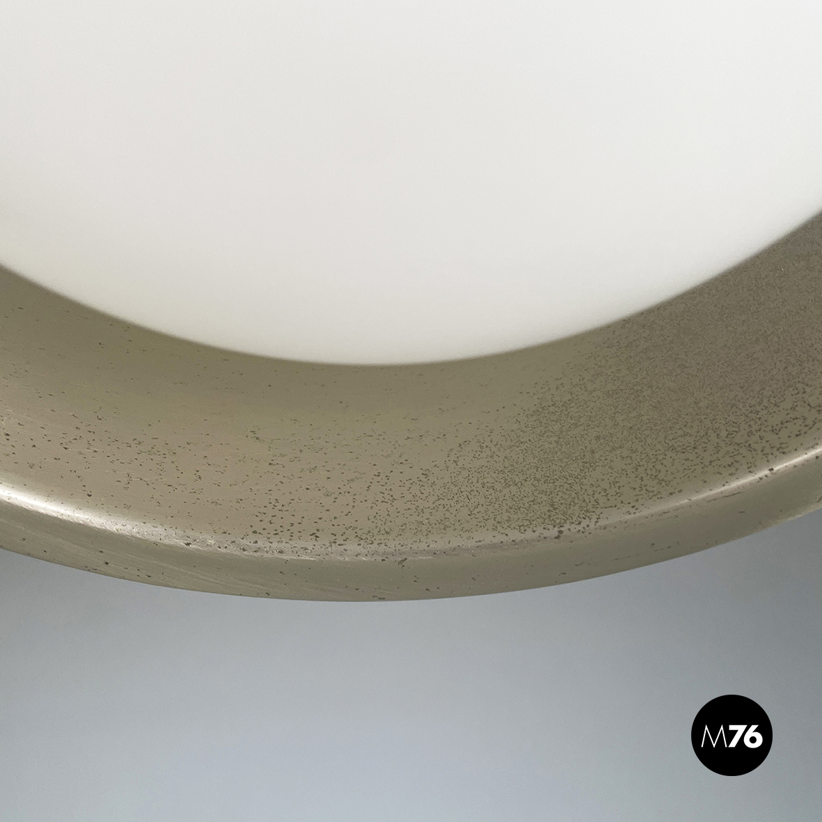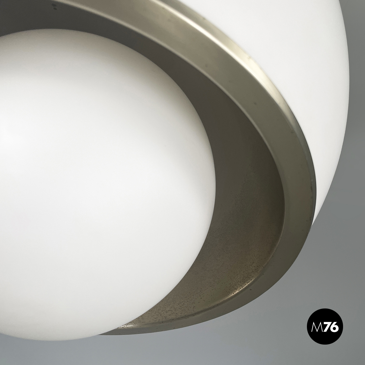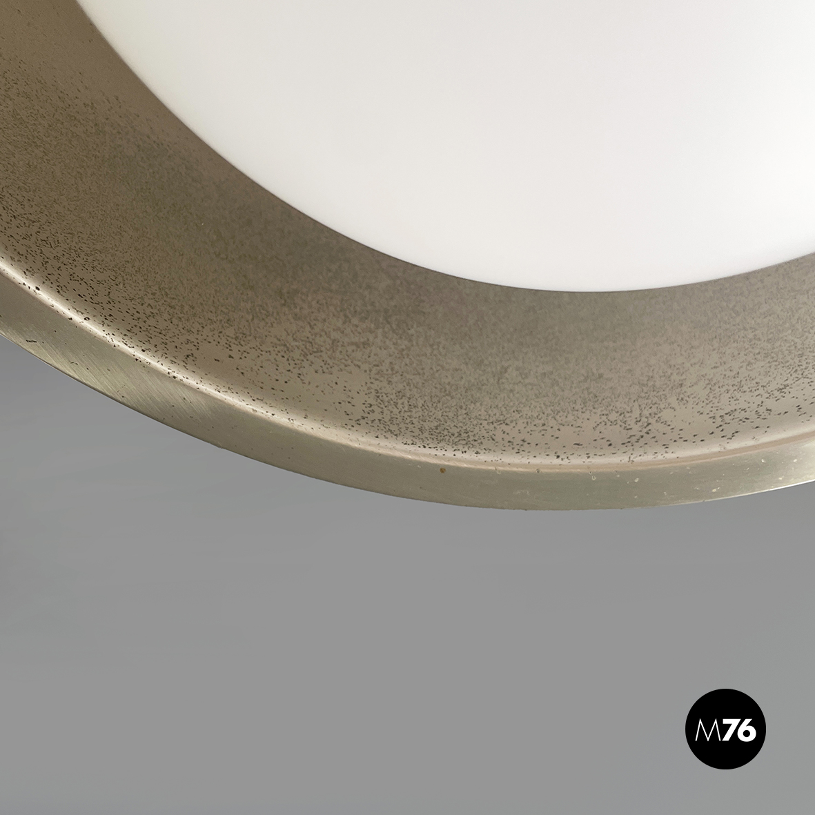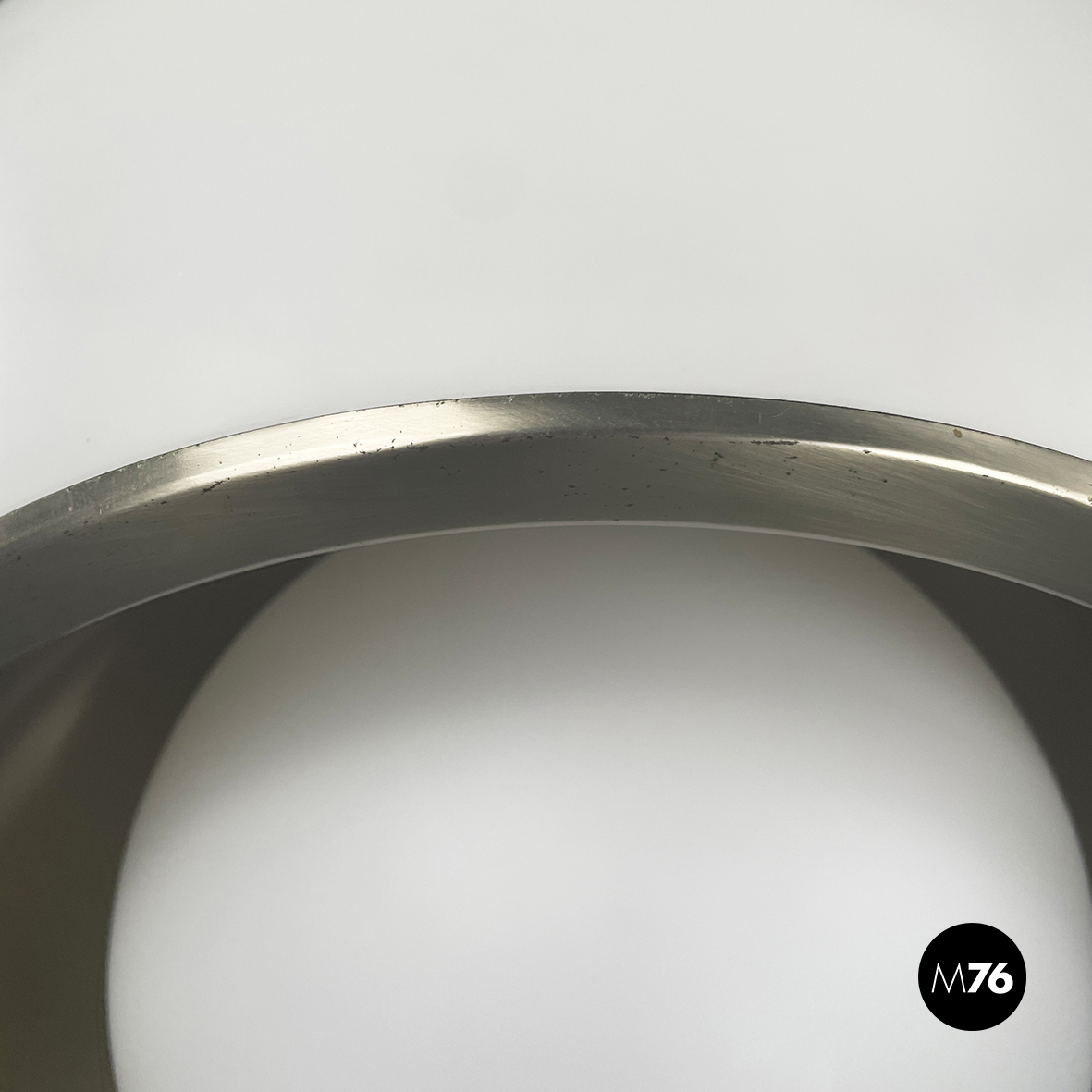 Lampadario in vetro opalino opaco e acciaio. Il diffusore a cupola presenta al centro una fascia in acciaio cromato e sotto una sfera in vetro opalino. All’interno del diffusore sono presenti sette lampadine E27. Attacco al soffitto cilindrico in acciaio.