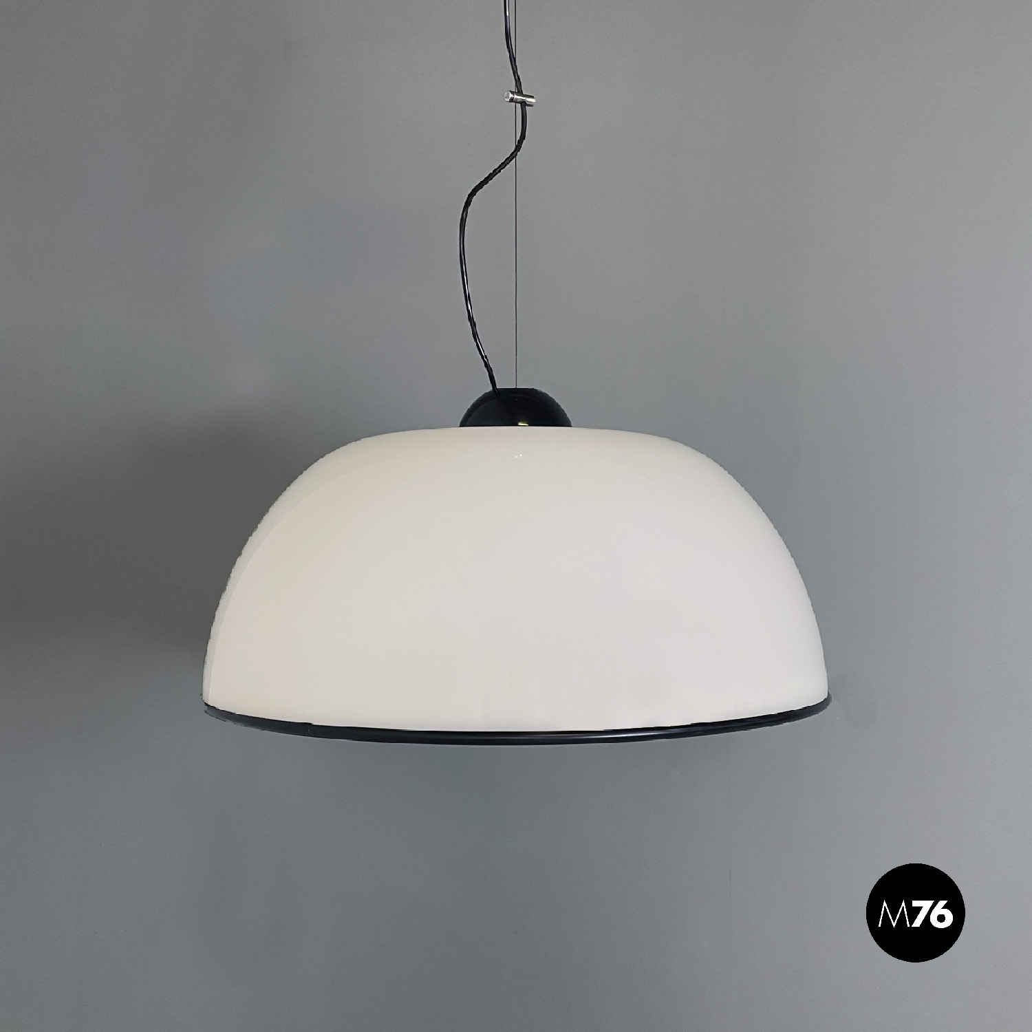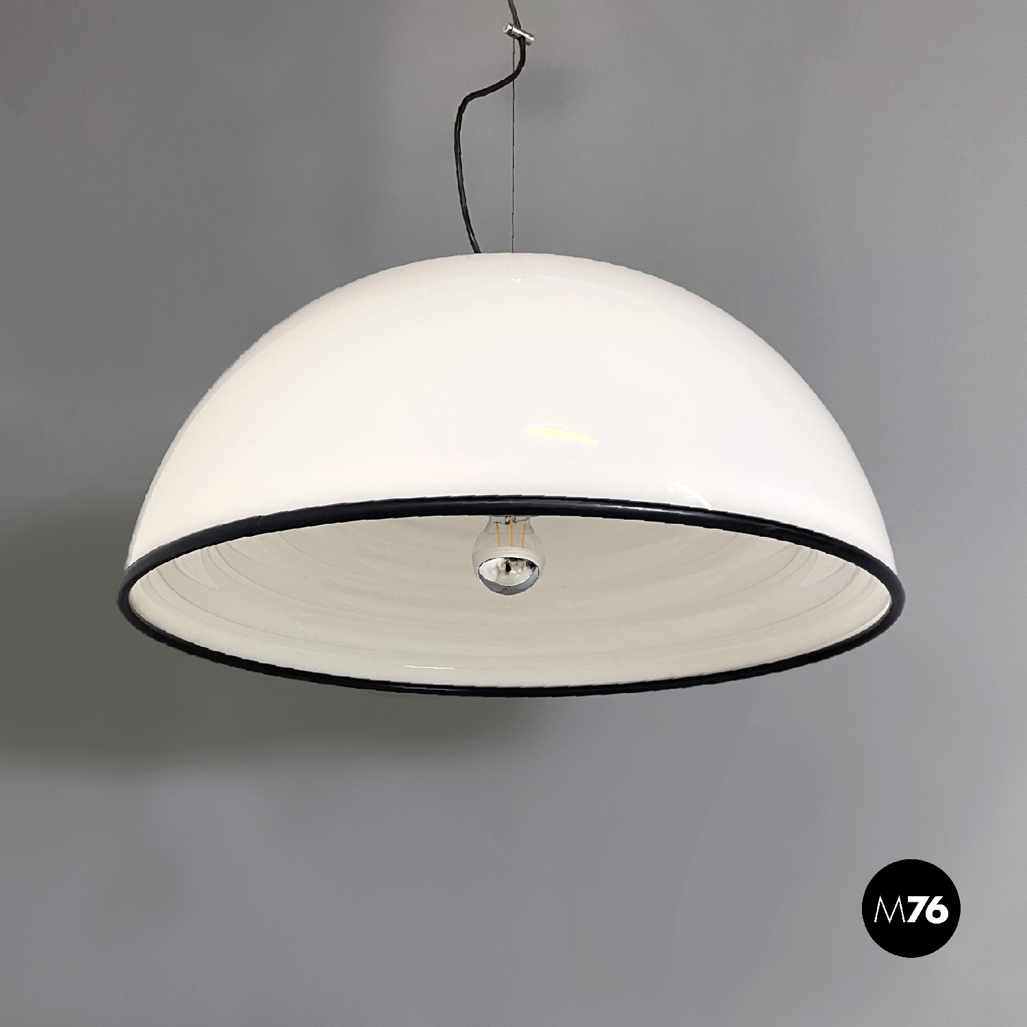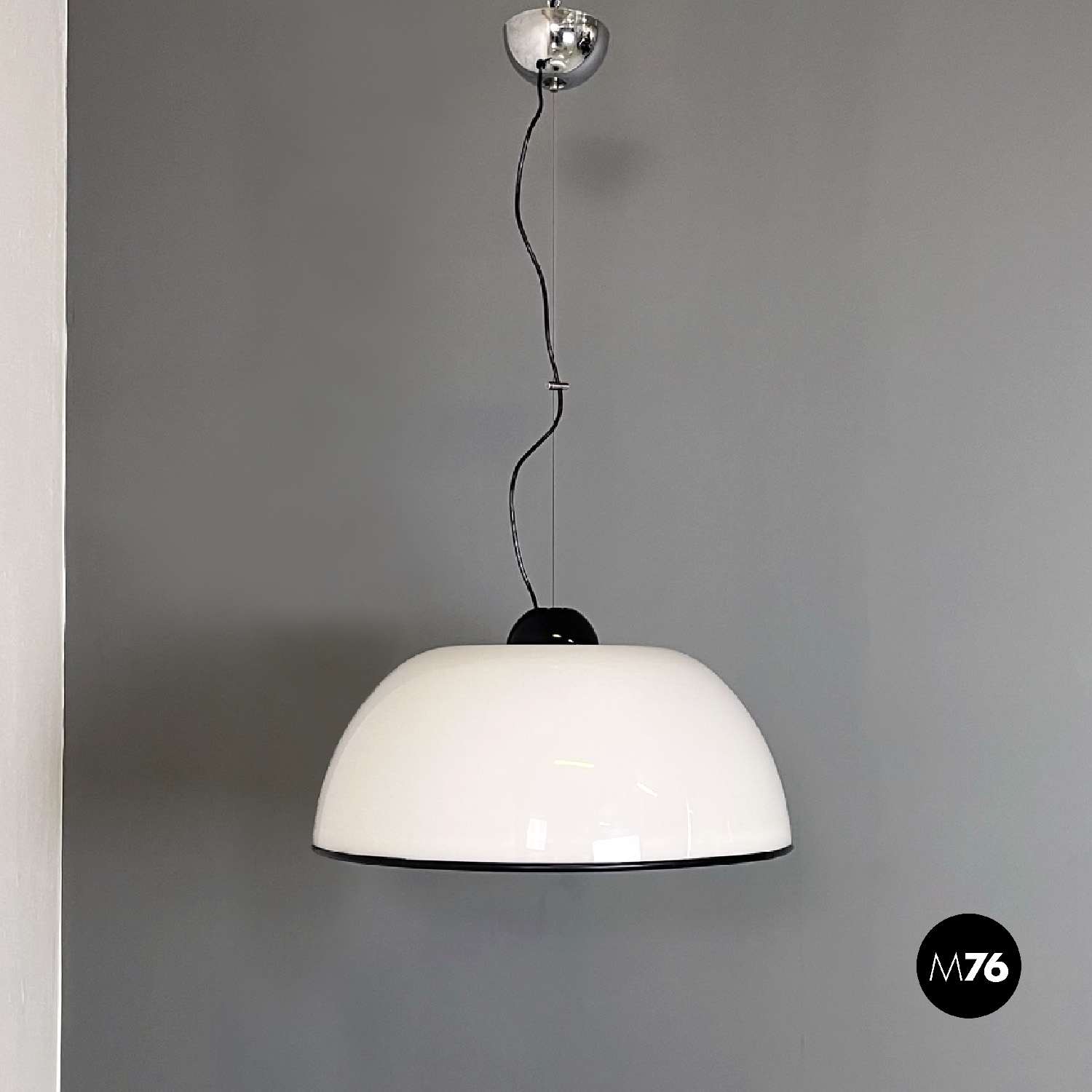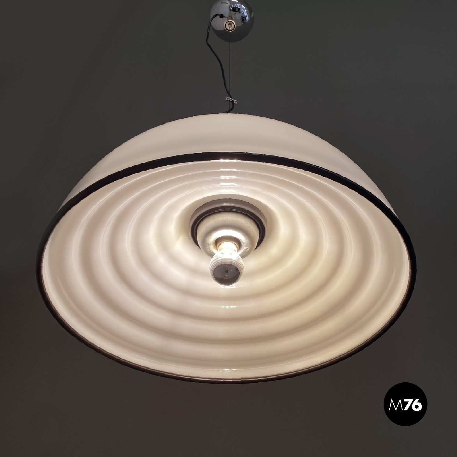 Lampadario con paralume a forma di cupola in plexiglass bianco con profilo in plastica nera. L’interno del paralume presenta una ondulatura del plexiglass. Nella parte superiore del paralume si trova un porta lampada in plexiglass nero a cui sono collegati un filo in metallo e il cavo in plastica nera sono uniti tramite un piccolo cilindro in metallo. L’attacco al soffitto è in plastica argentata.