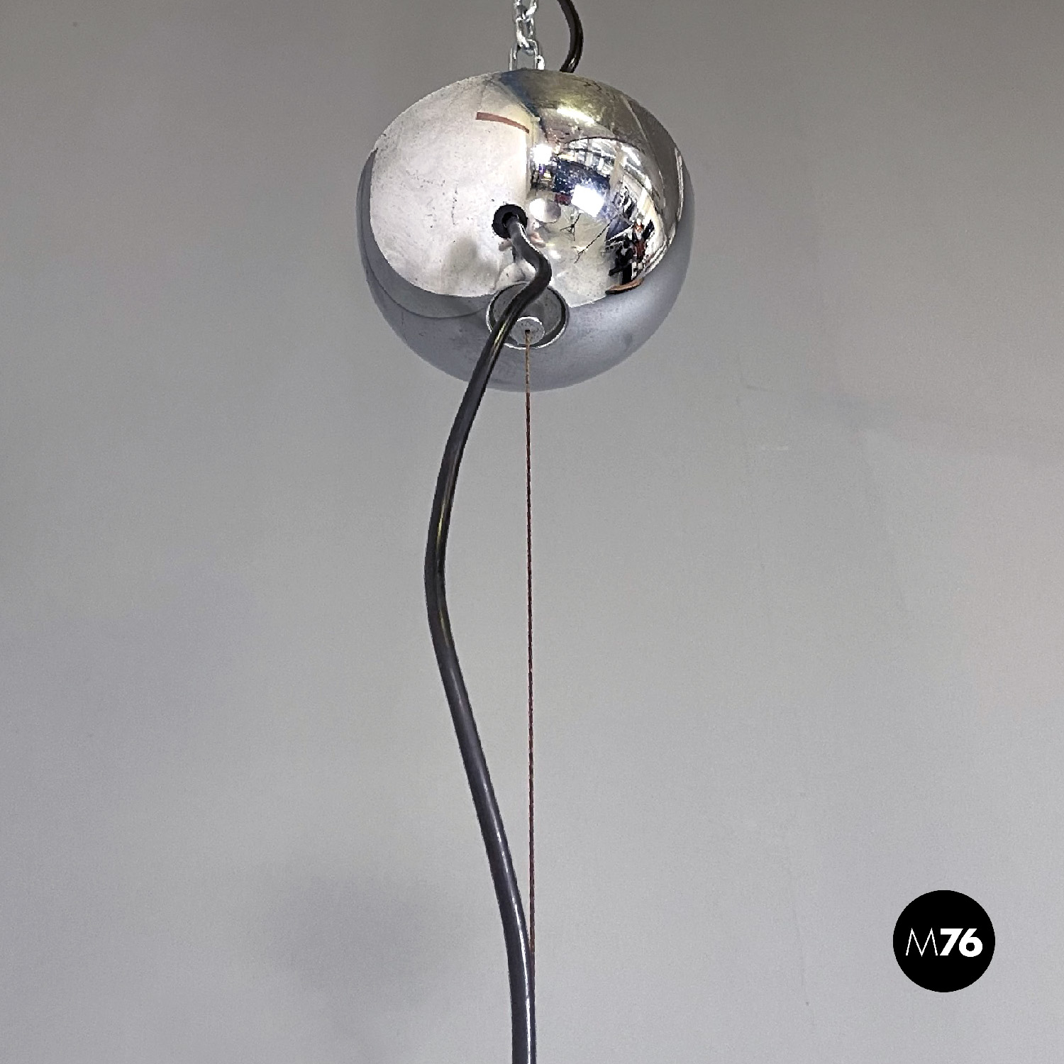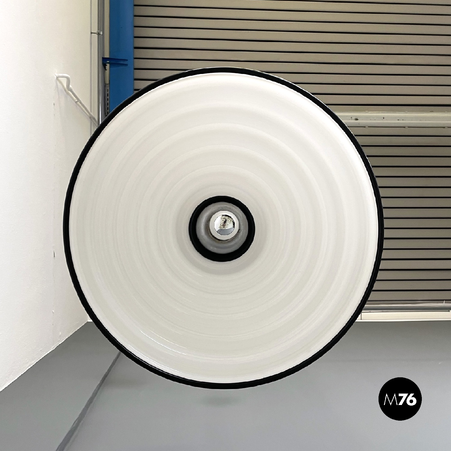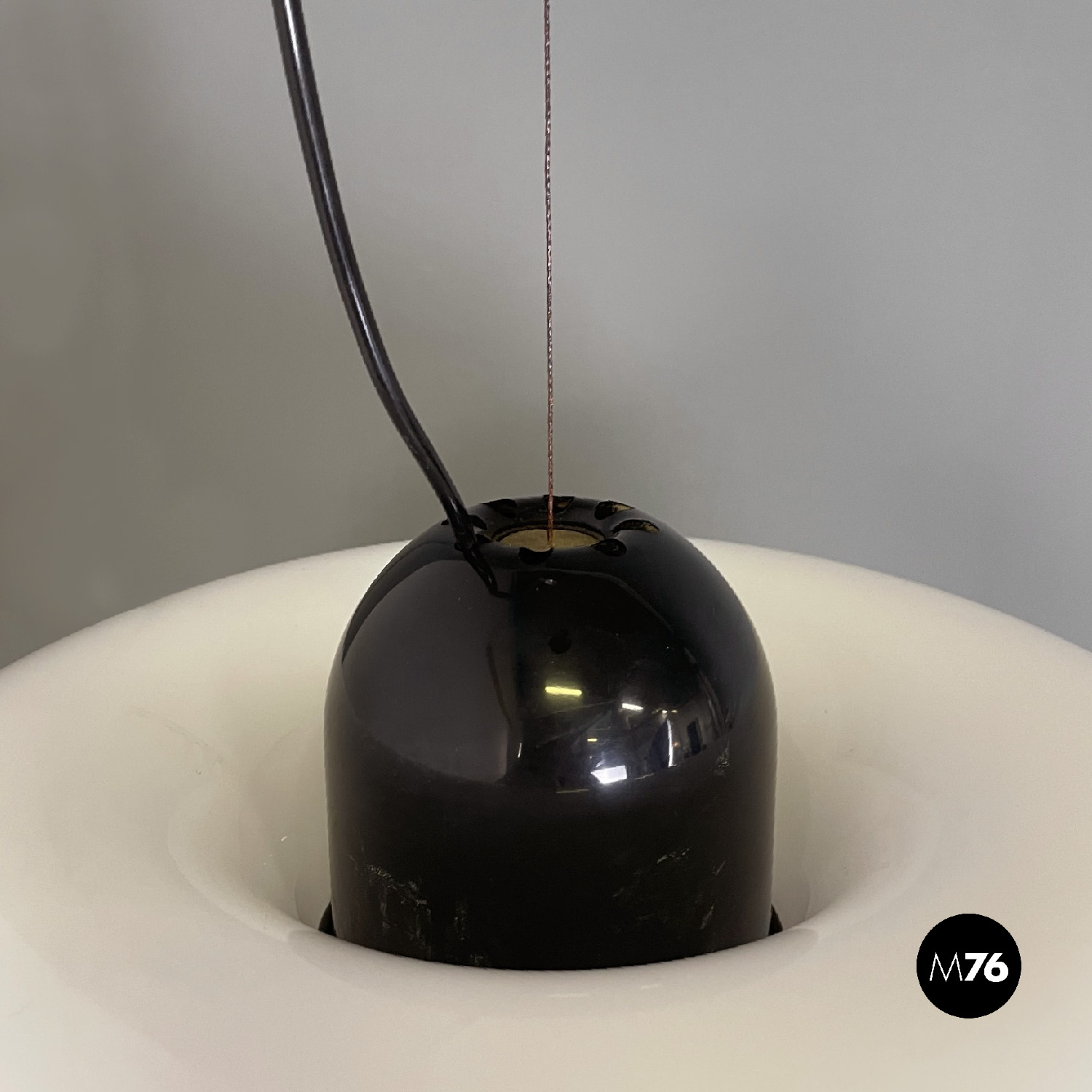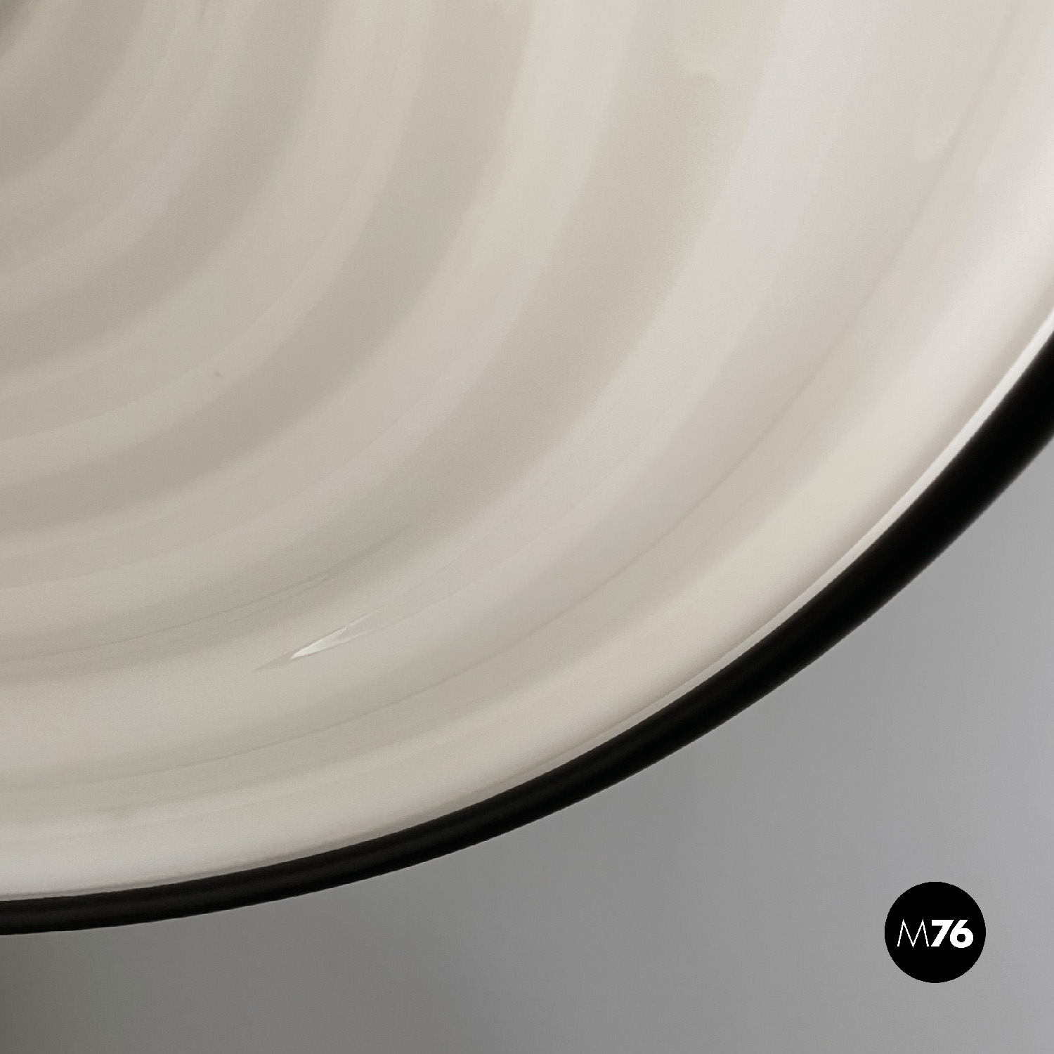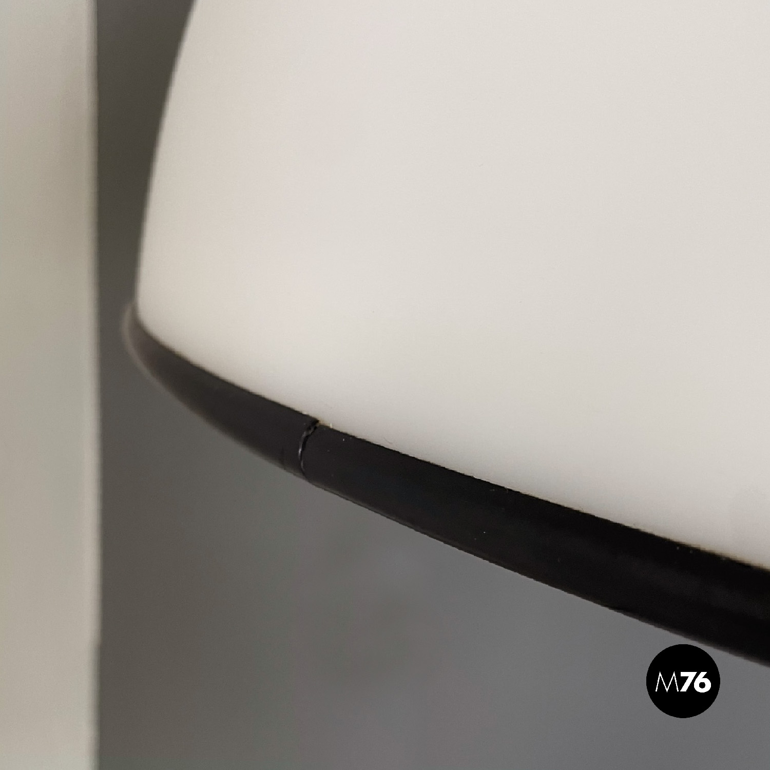 Lampadario con paralume a forma di cupola in plexiglass bianco con profilo in plastica nera. L’interno del paralume presenta una ondulatura del plexiglass. Nella parte superiore del paralume si trova un porta lampada in plexiglass nero a cui sono collegati un filo in metallo e il cavo in plastica nera sono uniti tramite un piccolo cilindro in metallo. L’attacco al soffitto è in plastica argentata.