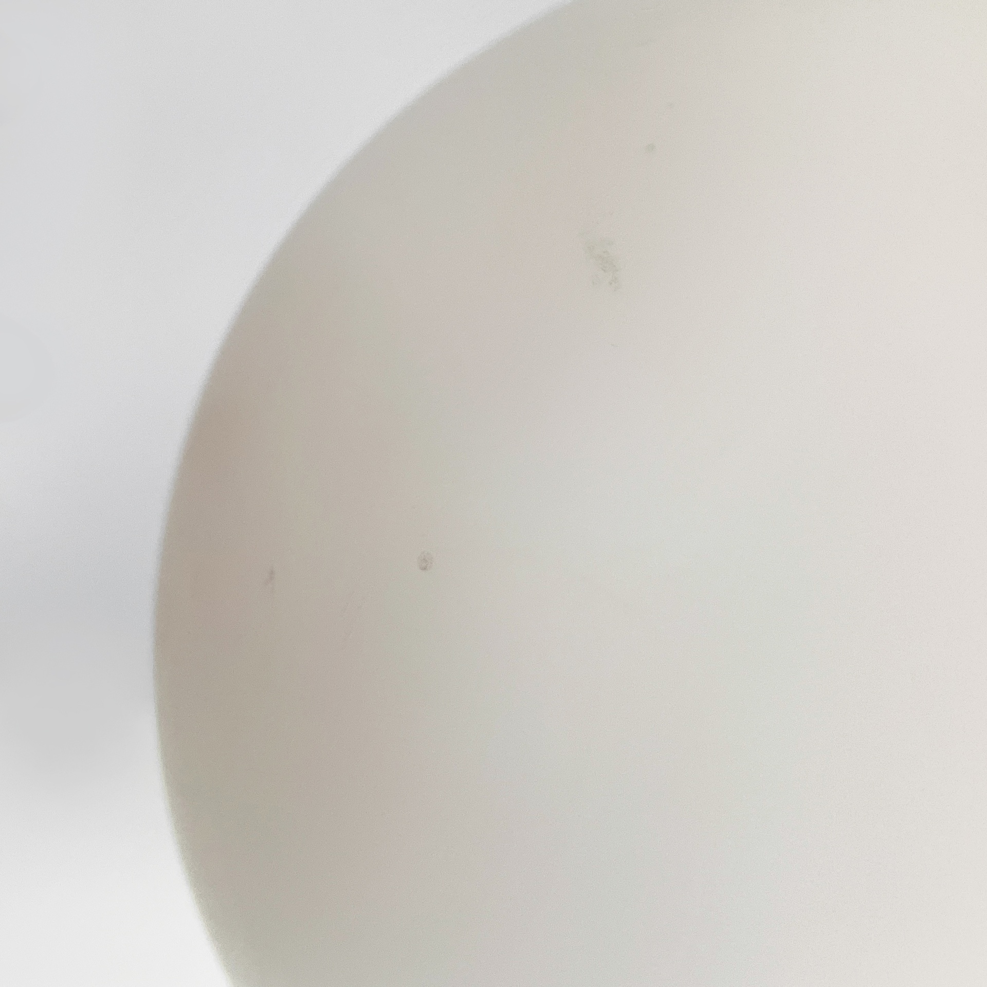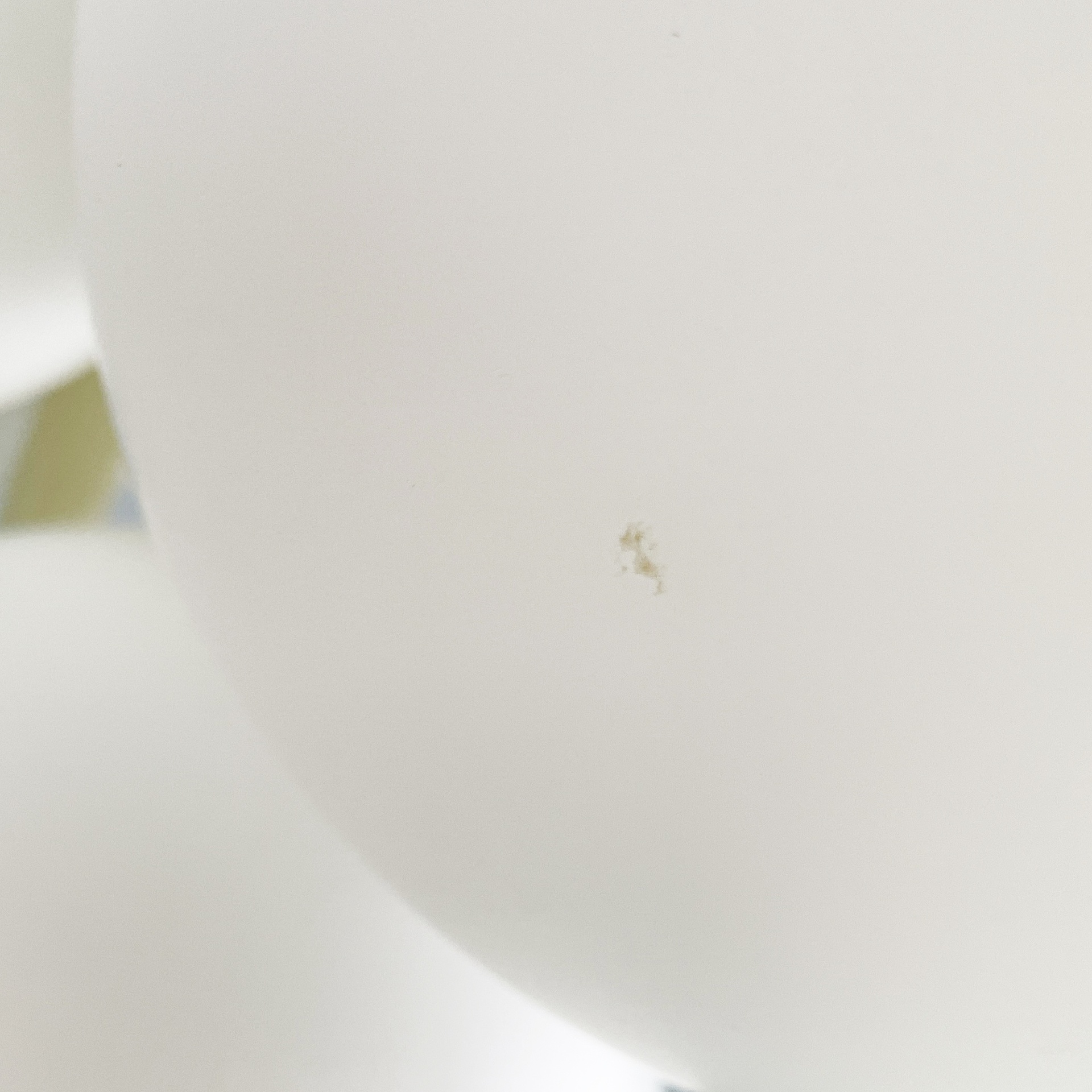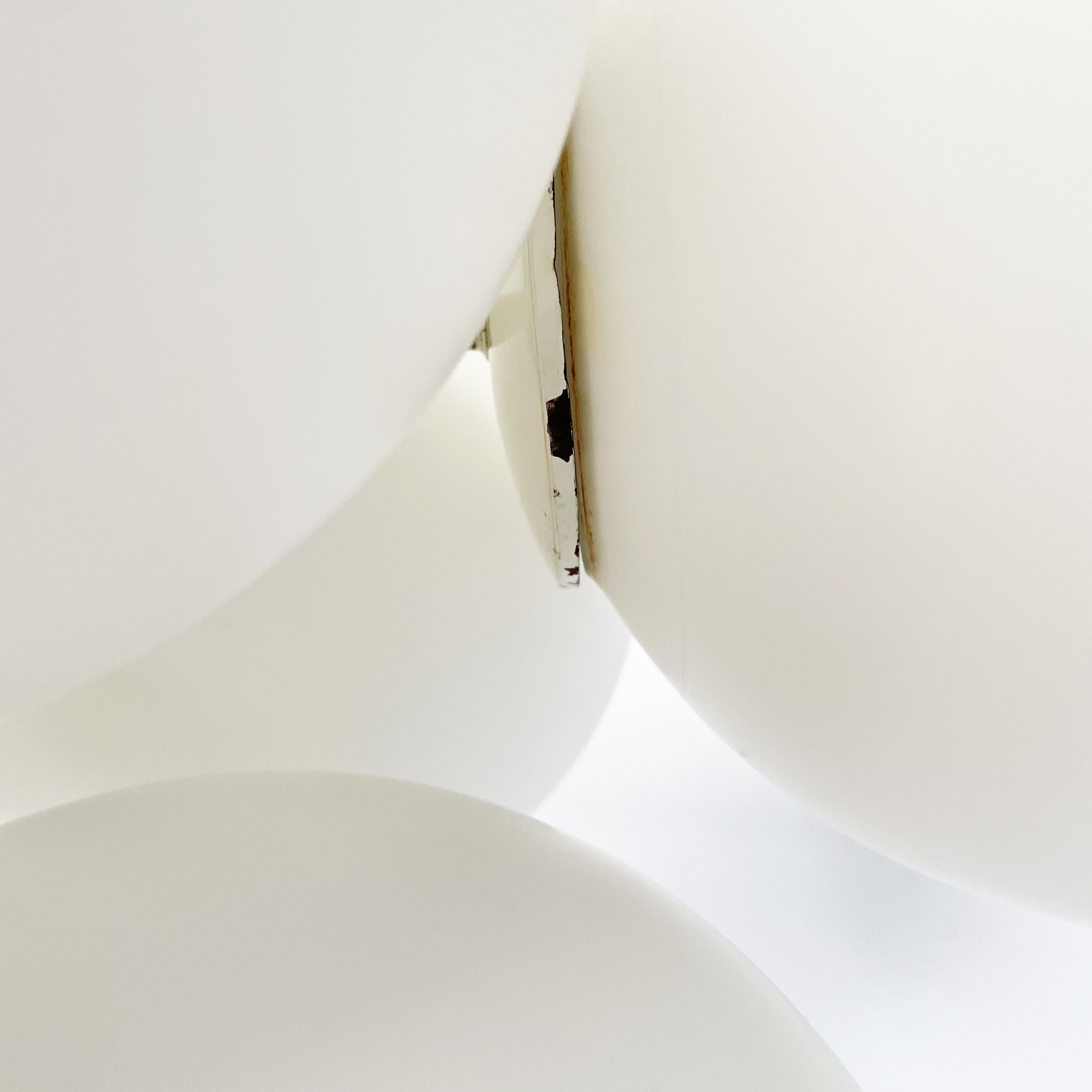 Lampadario a forma di piramide con dieci diffusori sferici in vetro opalino. La struttura centrale in tondino di metallo verniciato bianco presenta dieci attacchi di lampadina. Attacco a soffitto a base tonda in metallo verniciato bianco. Space Age.