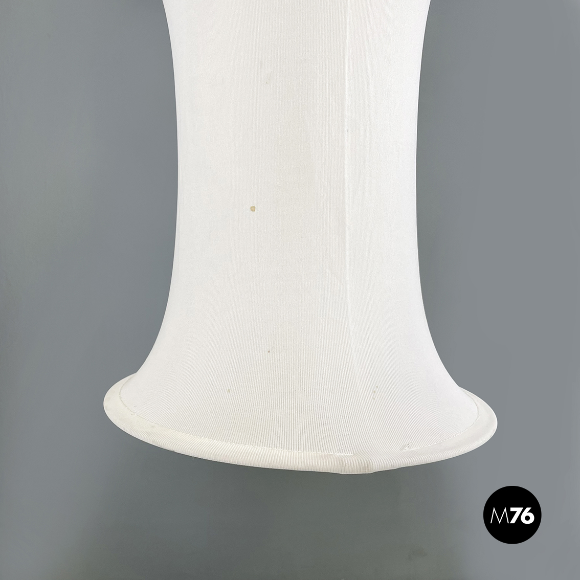 Lampadario modello Falkland composto da una serie di cerchi di diverse dimensioni in alluminio rivestiti in tessuto bianco elastico. Il riflettore di alluminio posto in cima regge il lampadario a sospensione.