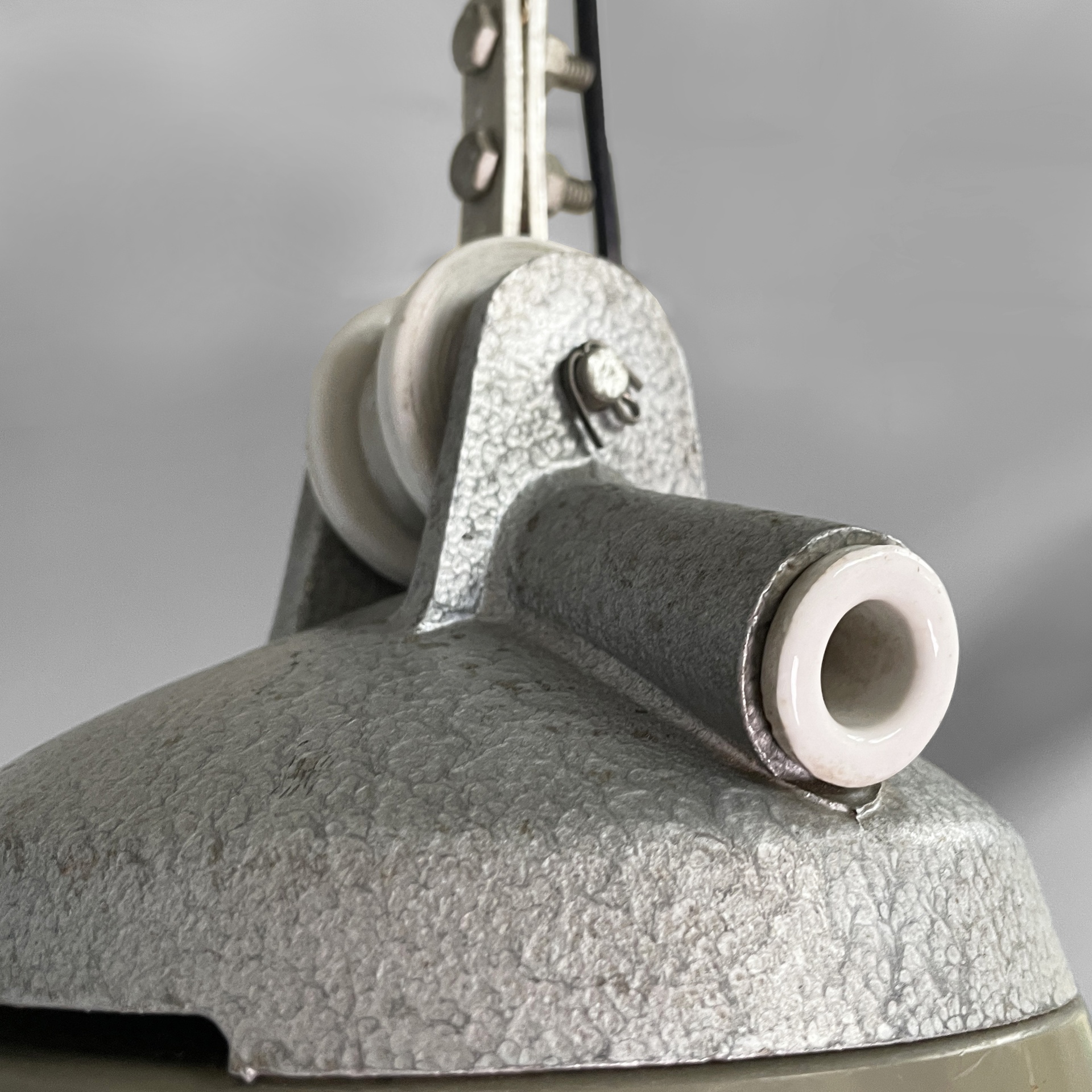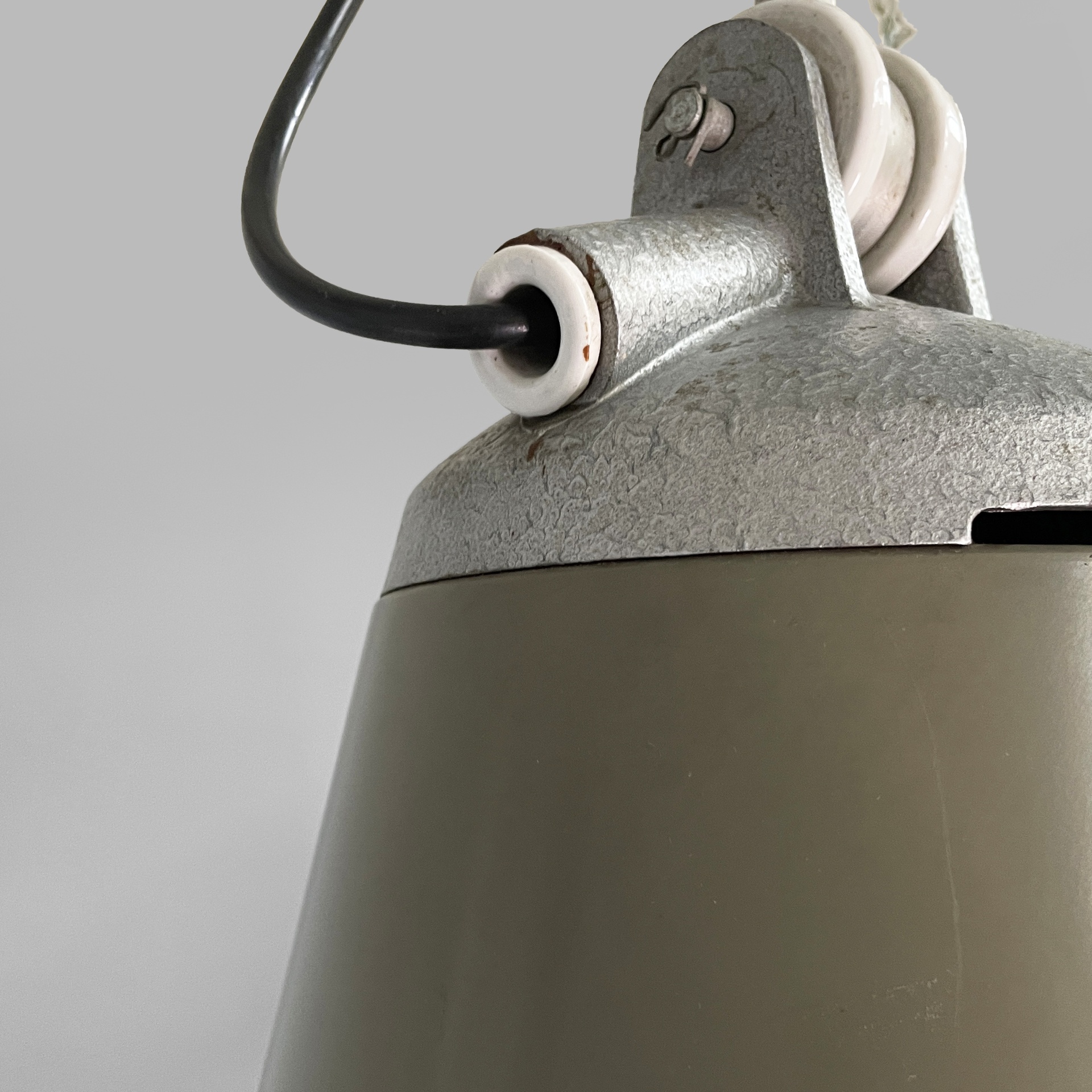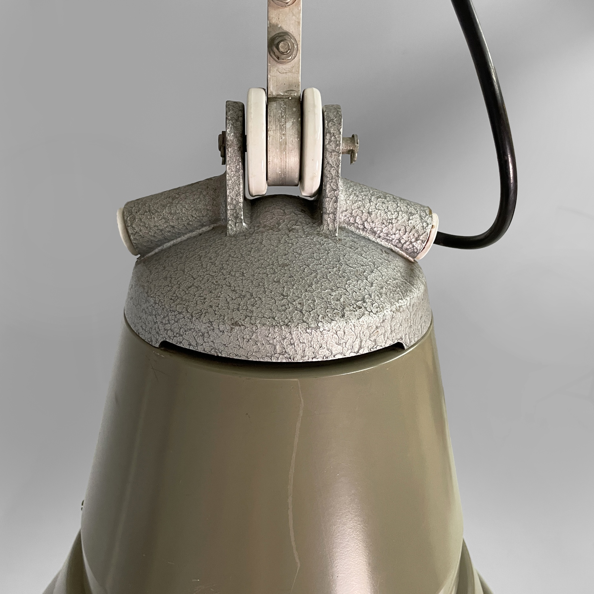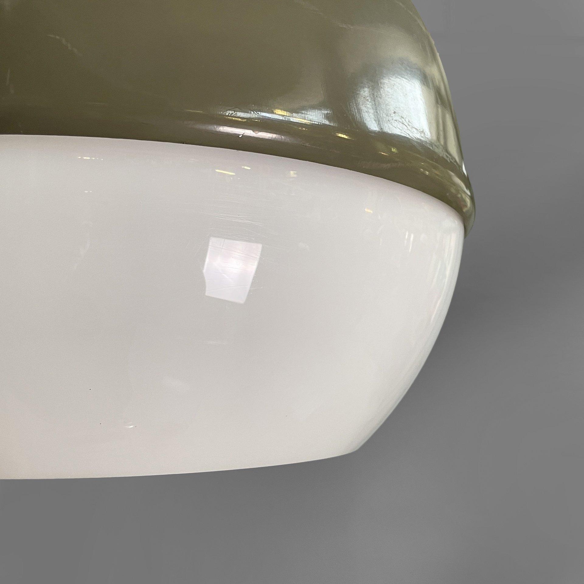 Lampadario modello Genova 4053 con diffusore tondeggiante in plexiglass bianco e metallo verniciato verde militare. La struttura a sezione tonda è anche essa in metallo verniciato verde militare. Attacco a soffitto cilindrico in metallo.