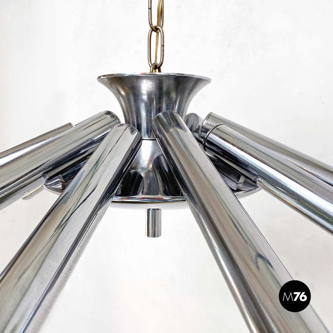 Lampadario in acciaio cromato a dodici luci nella parte terminale della struttura formata da dodici cilindri e stelo a catena originale dell’epoca.