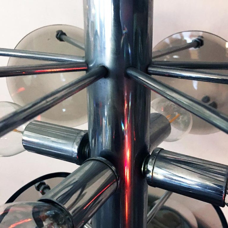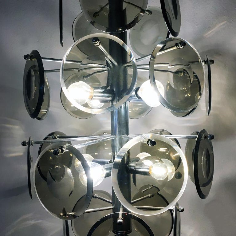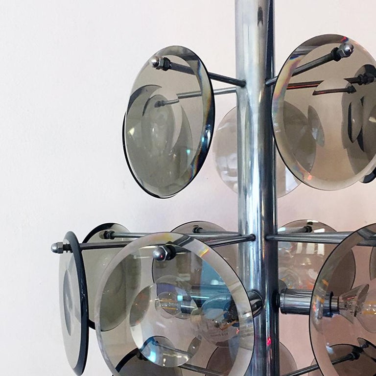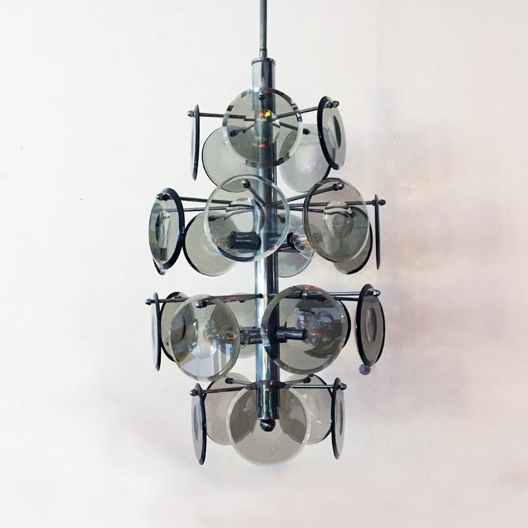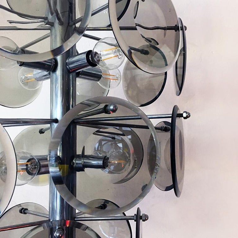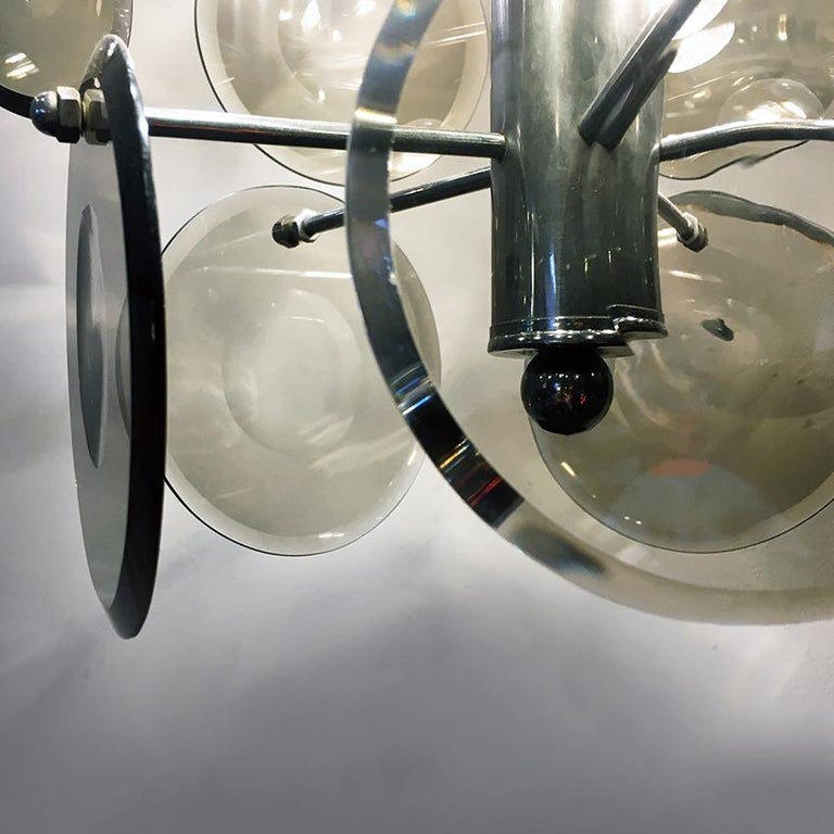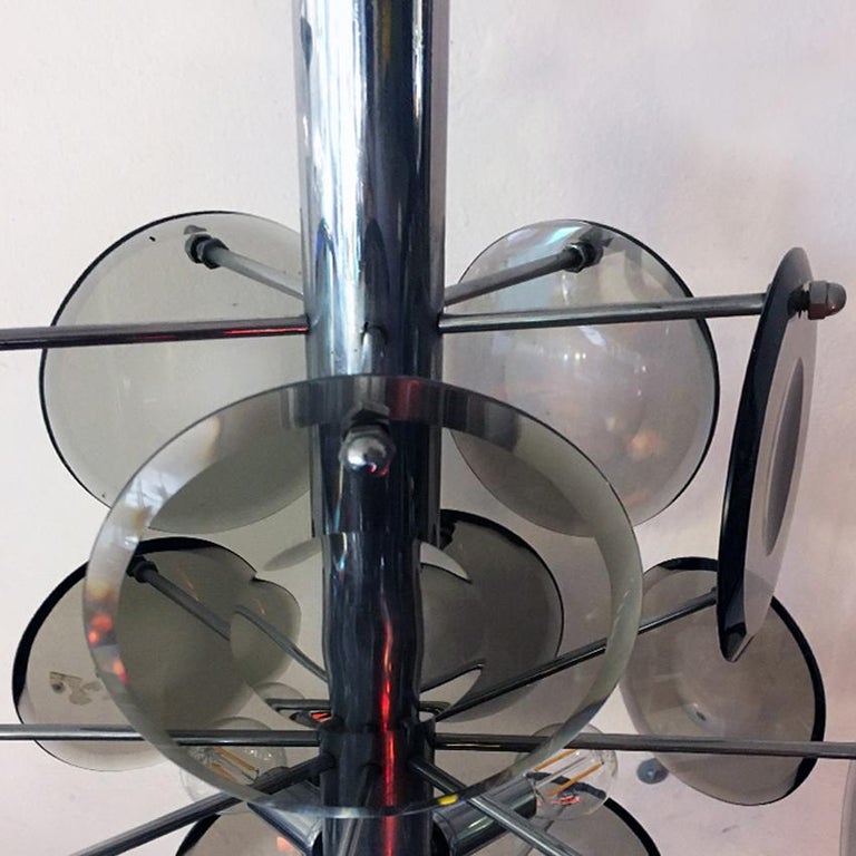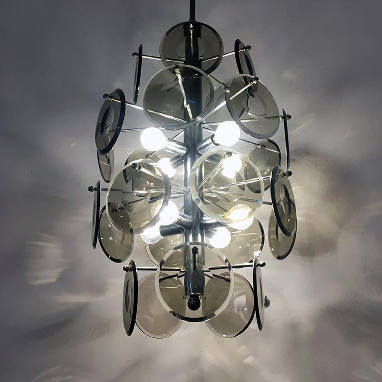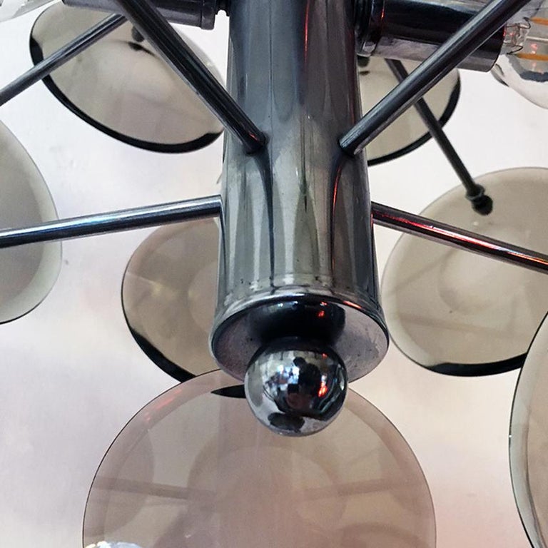 Lampadario a otto luci con struttura in acciaio cromato e pendenti a forma di disco in cristallo molato fumè.