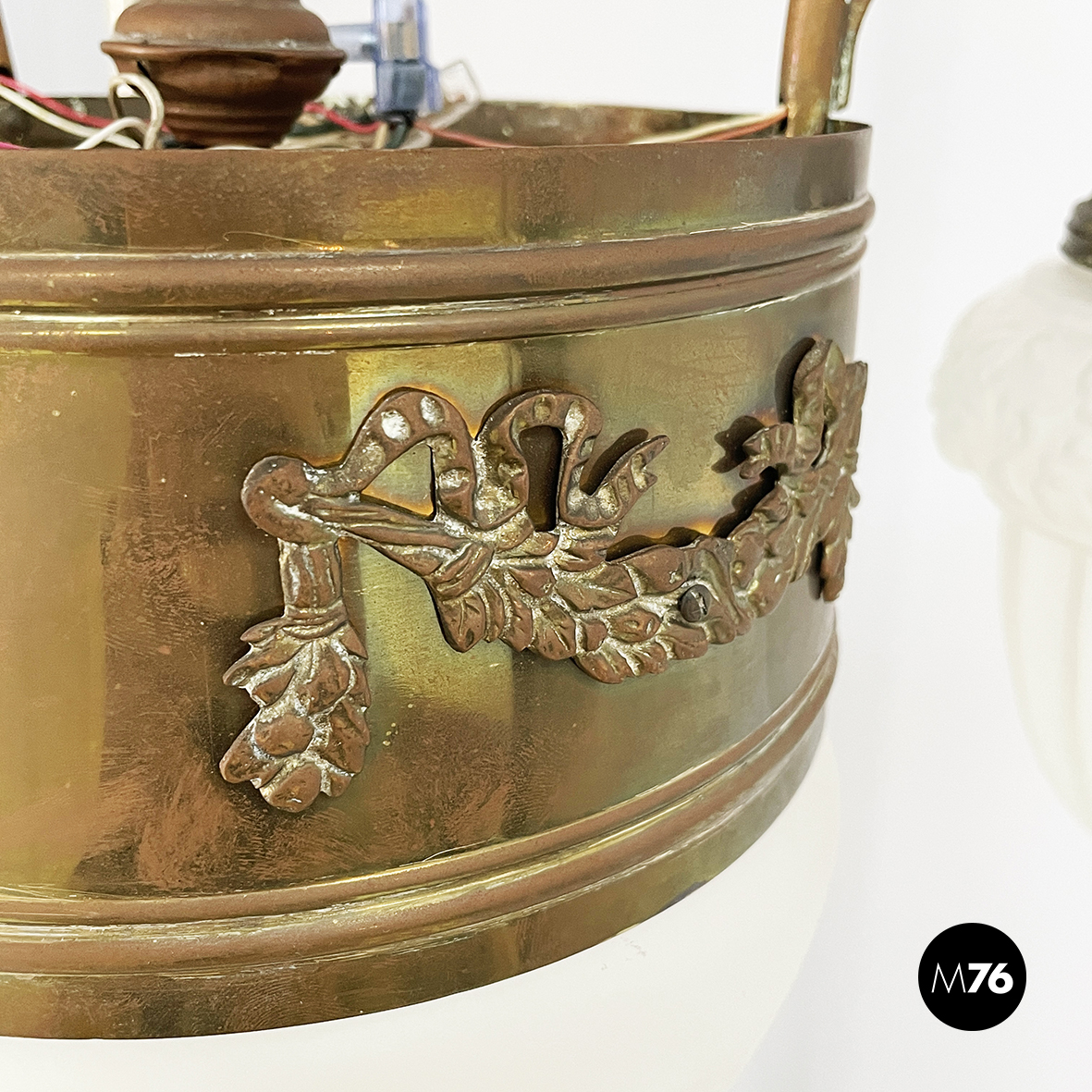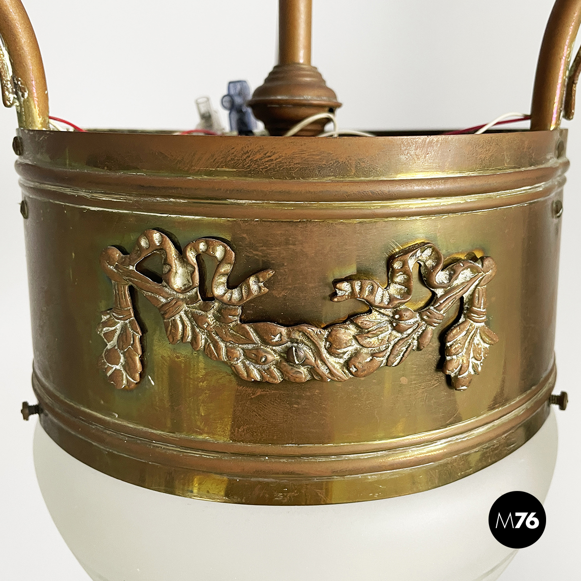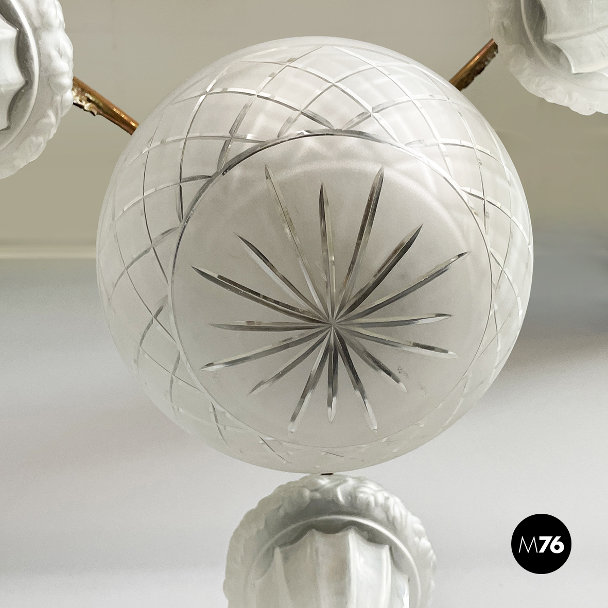 Lampadario con quattro diffusori in vetro satinato stampato. Il diffusore centrale a semisfera presenta delle decorazioni geometriche e una struttura in ottone con decorazioni floreali in rilievo. Introno a quello centrale sono presenti tre diffusori a base tonda e sagomati con decorazioni floreali in rilievo: questi sono sostenuti da tre bracci in tondino di ottone con decori floreali. La struttura è in tondino di ottone. Attacco al soffitto tondo in ottone. Proveniente dal periodo Liberty.