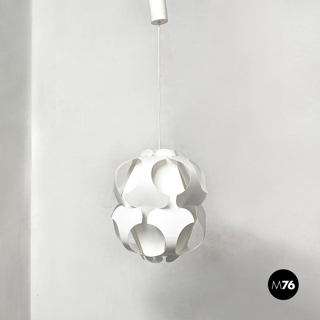 Lampadario modello Big Lily in plastica bianca di produzione danese. Paralume composto tramite un incastro concentrico di pezzi di plastica curvati disassemblati all’interno della scatola originale insieme al suo portalampada in plastica.