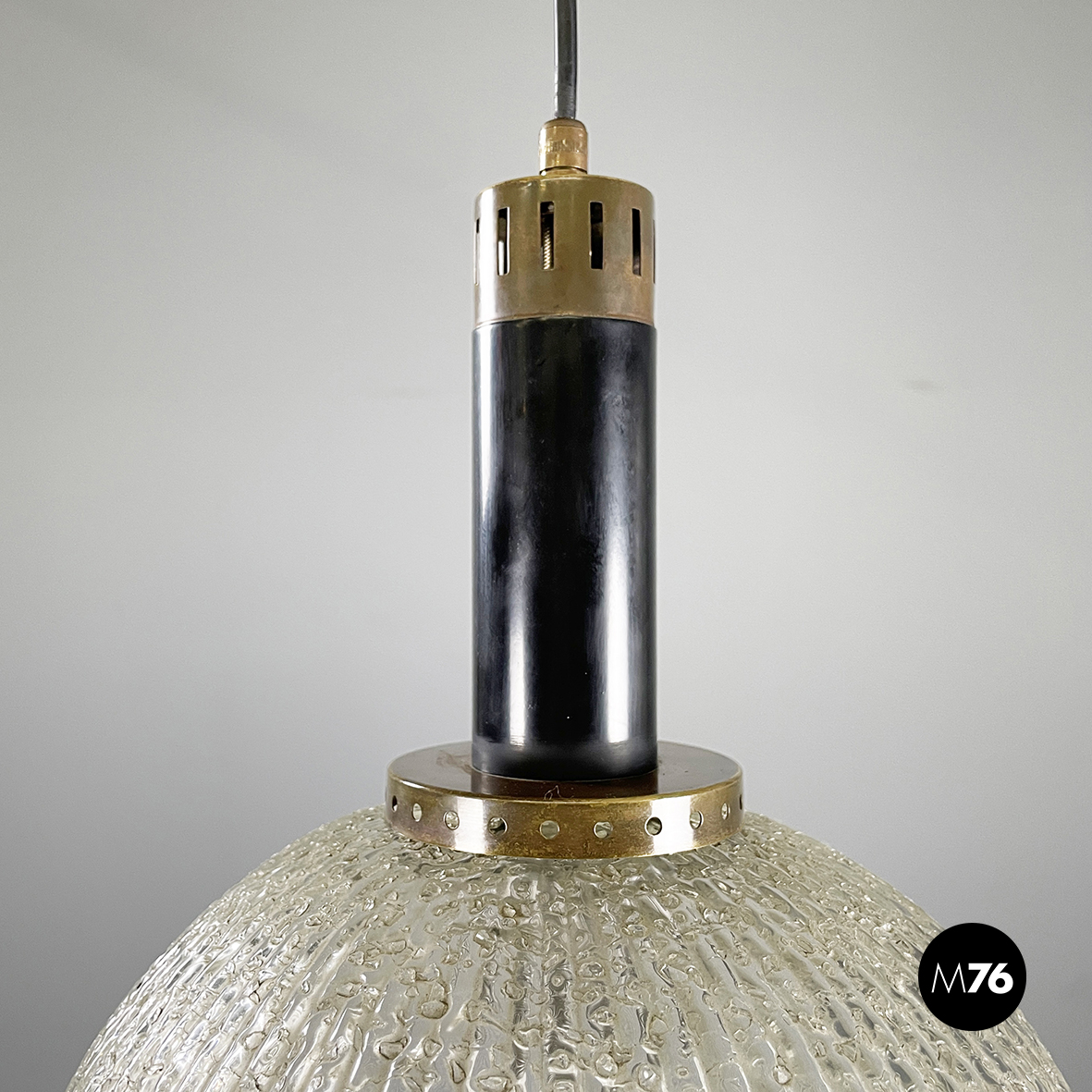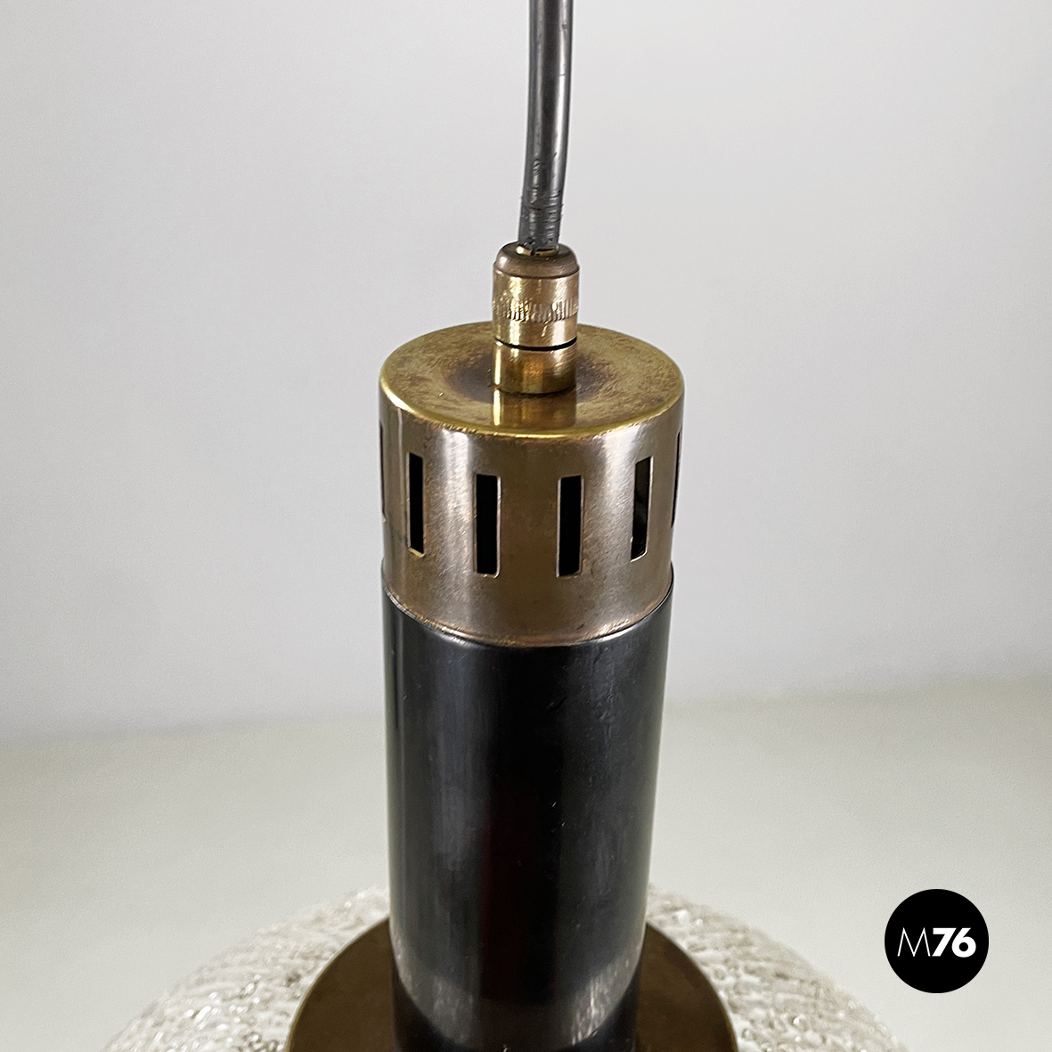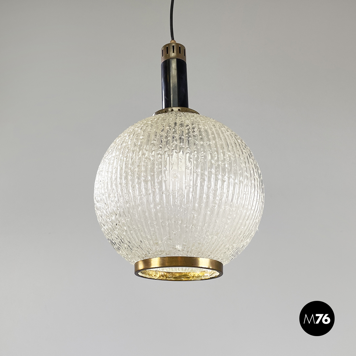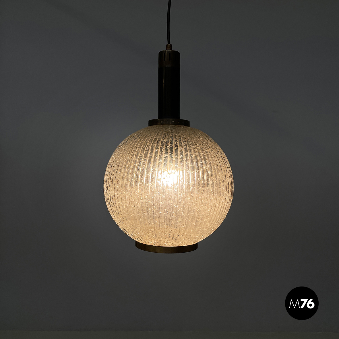 Lampadario con diffusore sferico in vetro stampato con scanalature decorative il quale presenta sotto un foro con bordo in ottone. La struttura cilindrica è in metallo verniciato nero e ottone. Attacco al soffitto cilindrico nero.