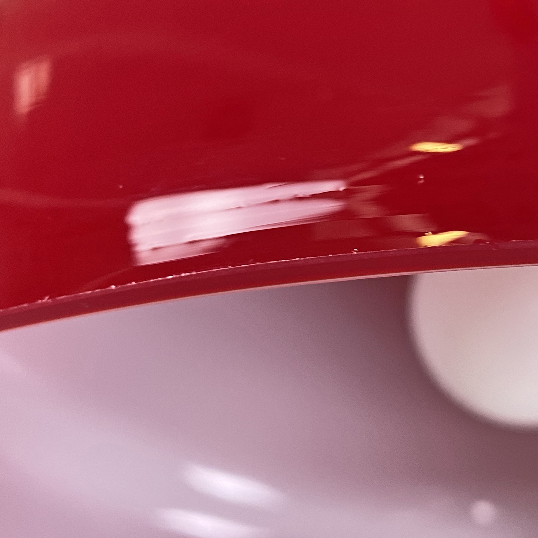 Lampada a sospensione con paralume interamente in doppio vetro incamiciato di colore rosso fuori e bianco dentro.