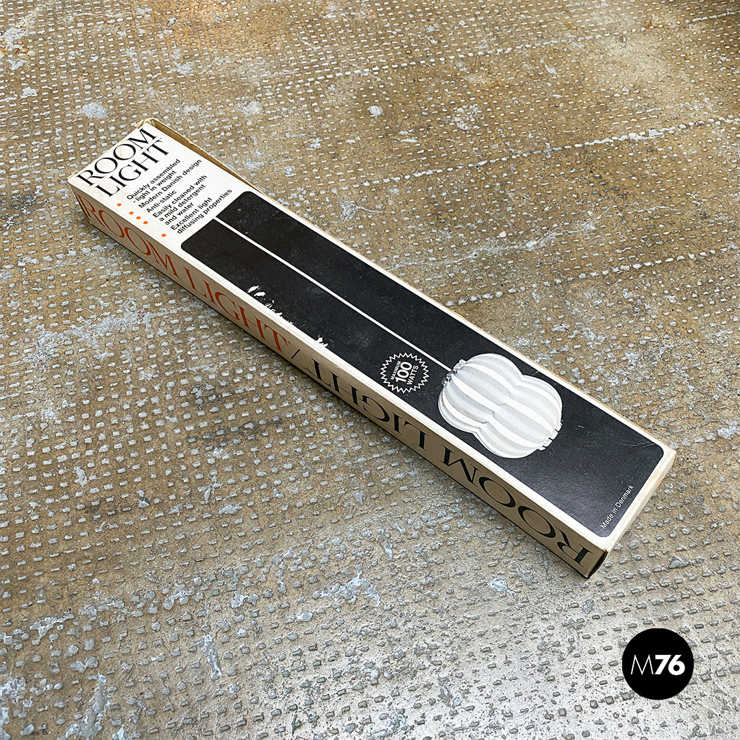 Lampadario modello Room Light in plastica arancione. Paralume composto tramite un incastro concentrico di pezzi di plastica curvati disassemblati all’interno della scatola originale insieme al suo portalampada in plastica.