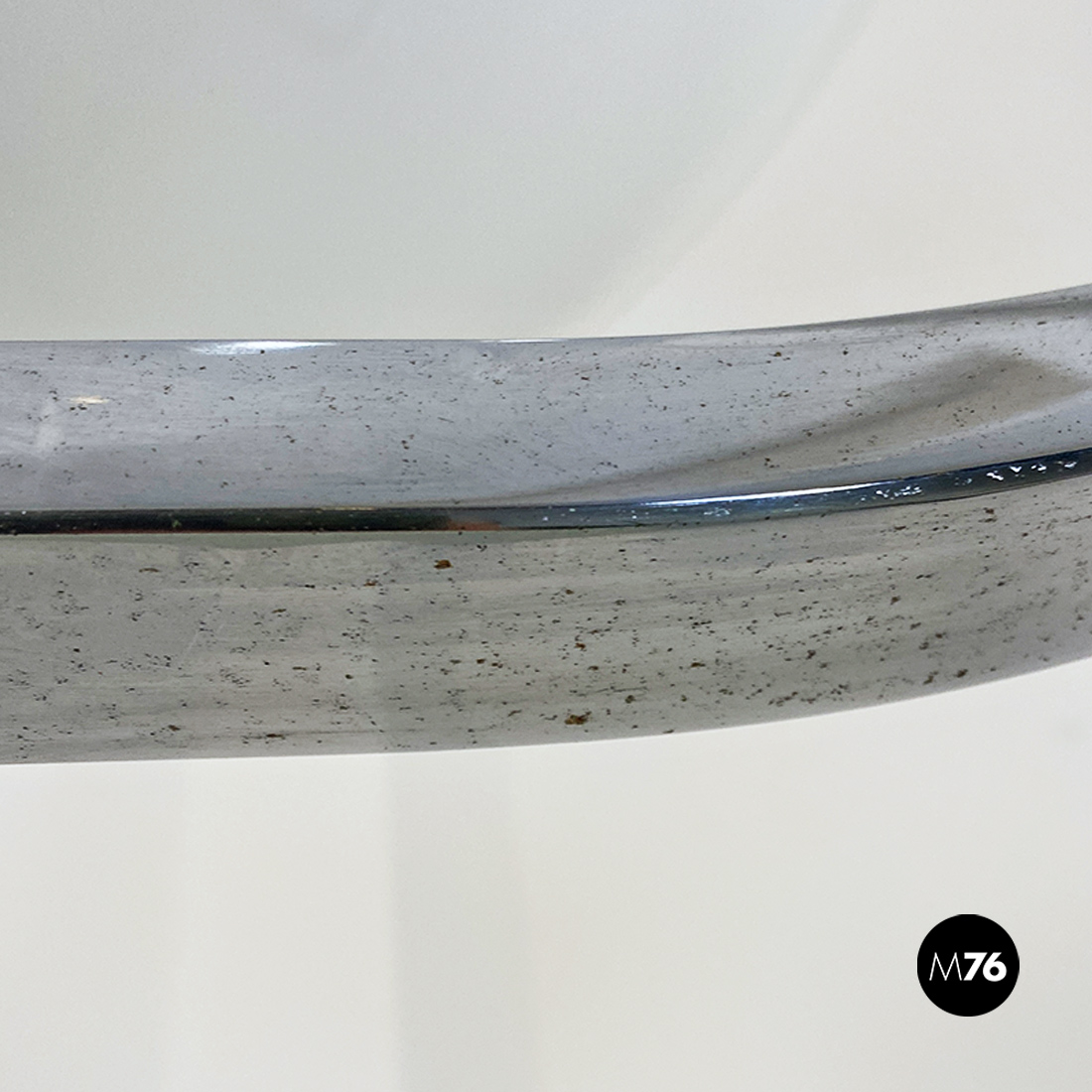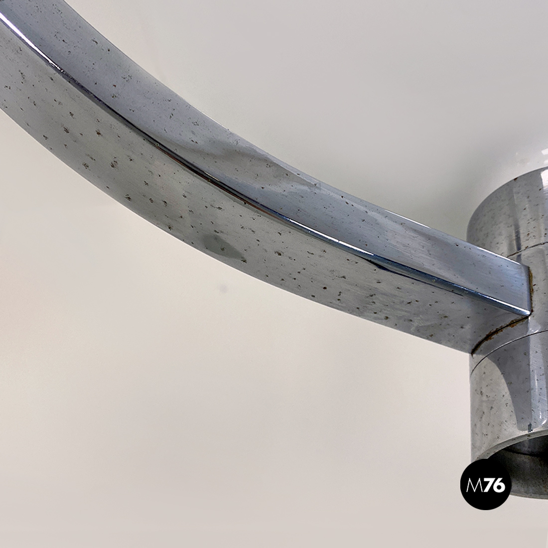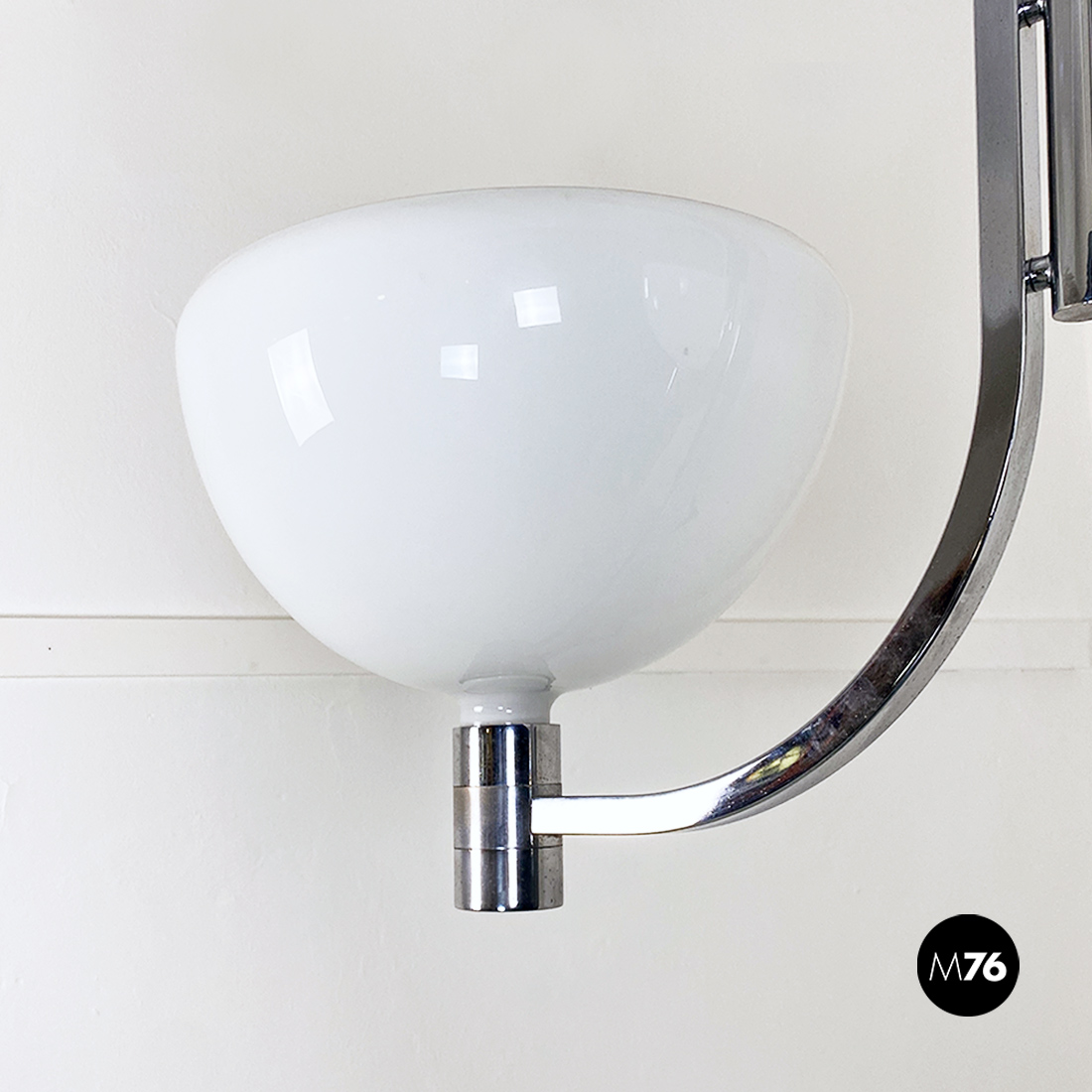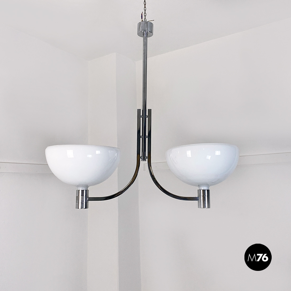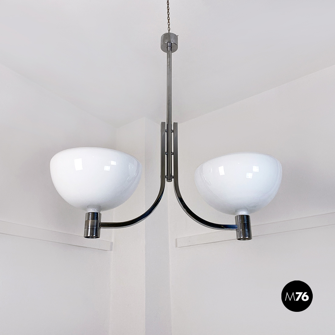 Lampadario modello AM/AS con struttura curva in acciaio cromato che sostiene due paralumi semisferici in vetro opaline lucido. Come in tutte le lampade di questa serie presenta paralumi intercambiabili e con doppio attacco sia sulla parte alta che bassa del braccio curvo.
