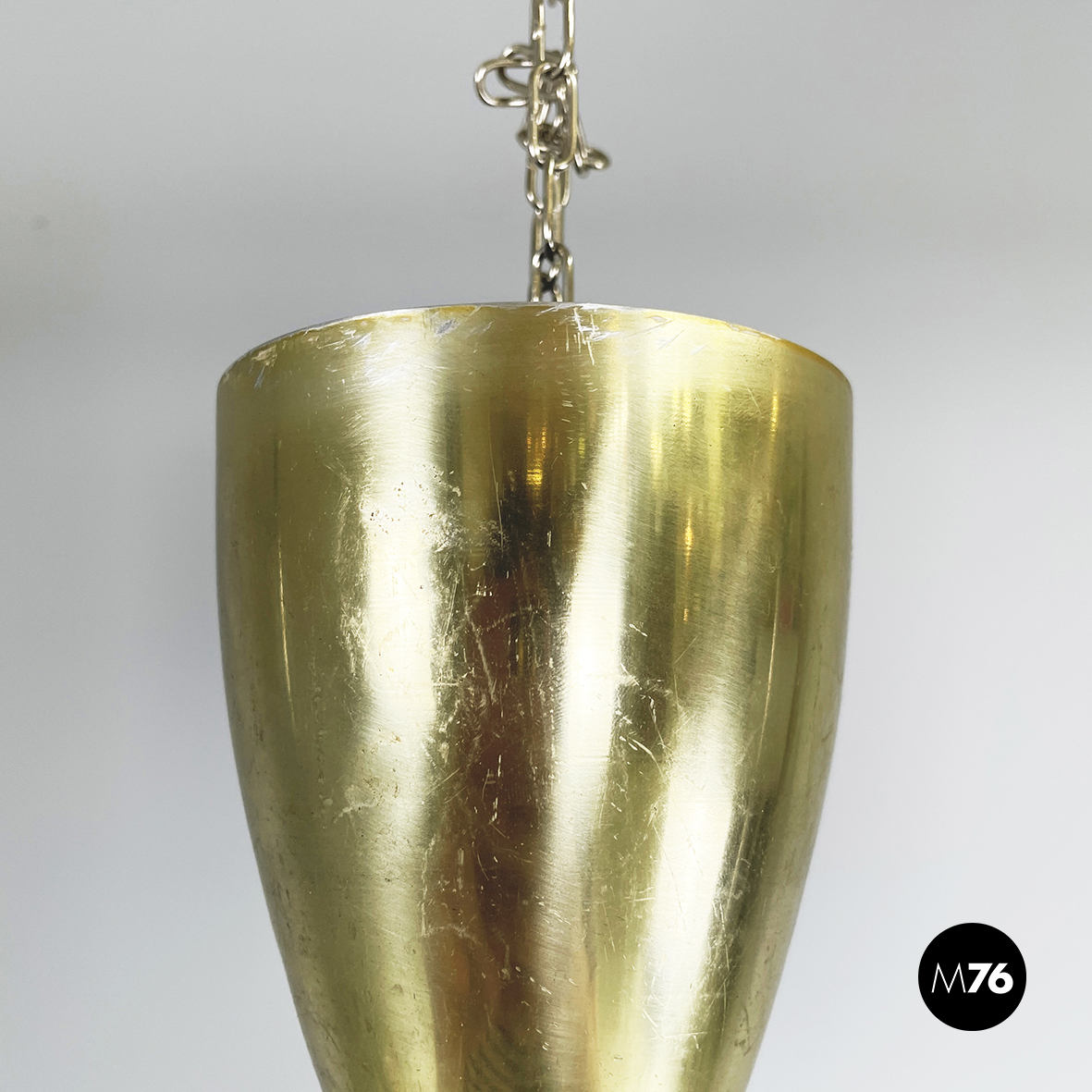 Lampadario da soffitto modello Splugen Brau tondeggiante. Il paralume tornito è a forma di cupola in metallo con finitura dorata. Il cavo è a molla in plastica nera e grazie ad un meccanismo sali scendi brevettato nascosto nel rosone è modificabile semplicemente tirando leggermente il paralume e fermandosi all’altezza desiderata.