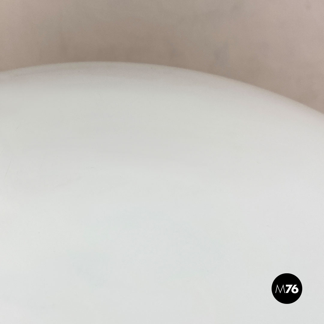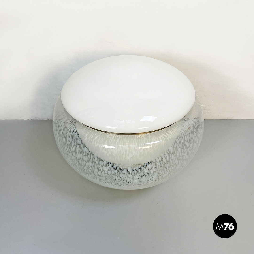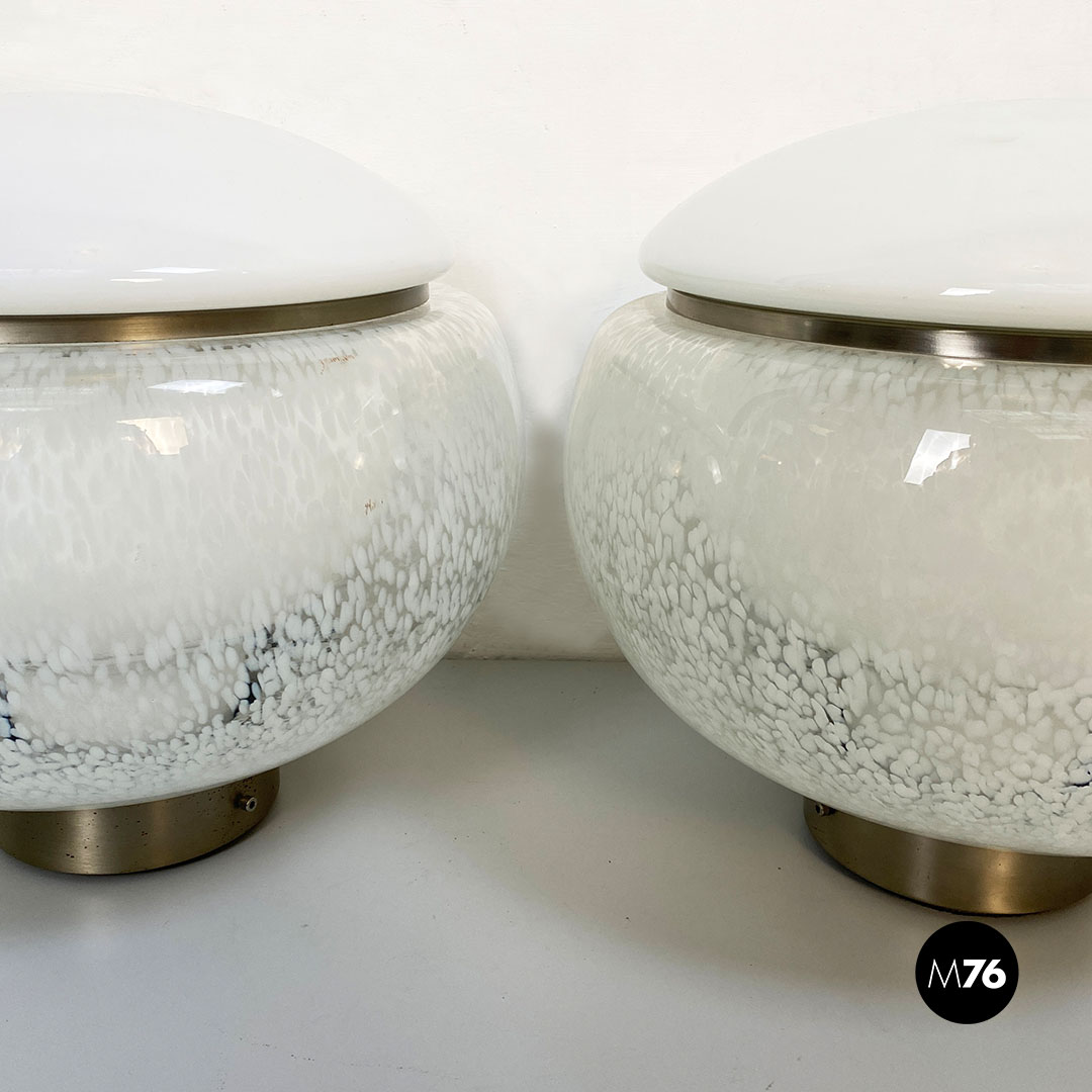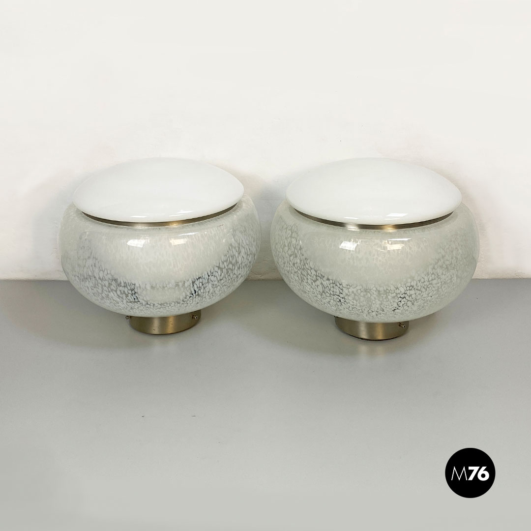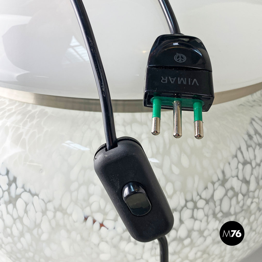 Coppia di lampade in vetro di Murano con diffusore in vetro opaline con parte alta in vetro bianco che va a chiudere la parte sferica del diffusore interamente ricoperto da una decorazione a macchie bianche. Con base d’appoggio e dettaglio nella parte alta in acciaio satinato.