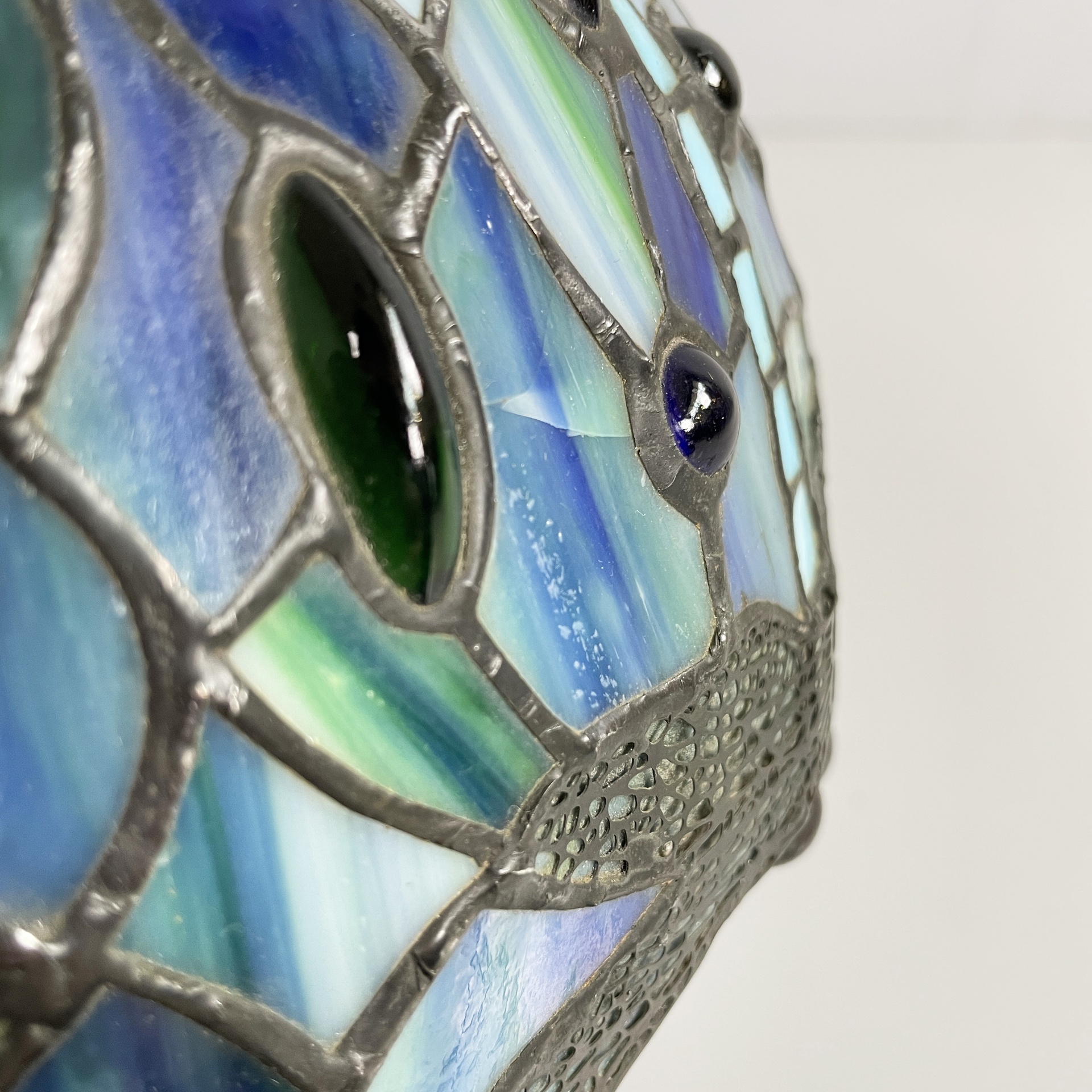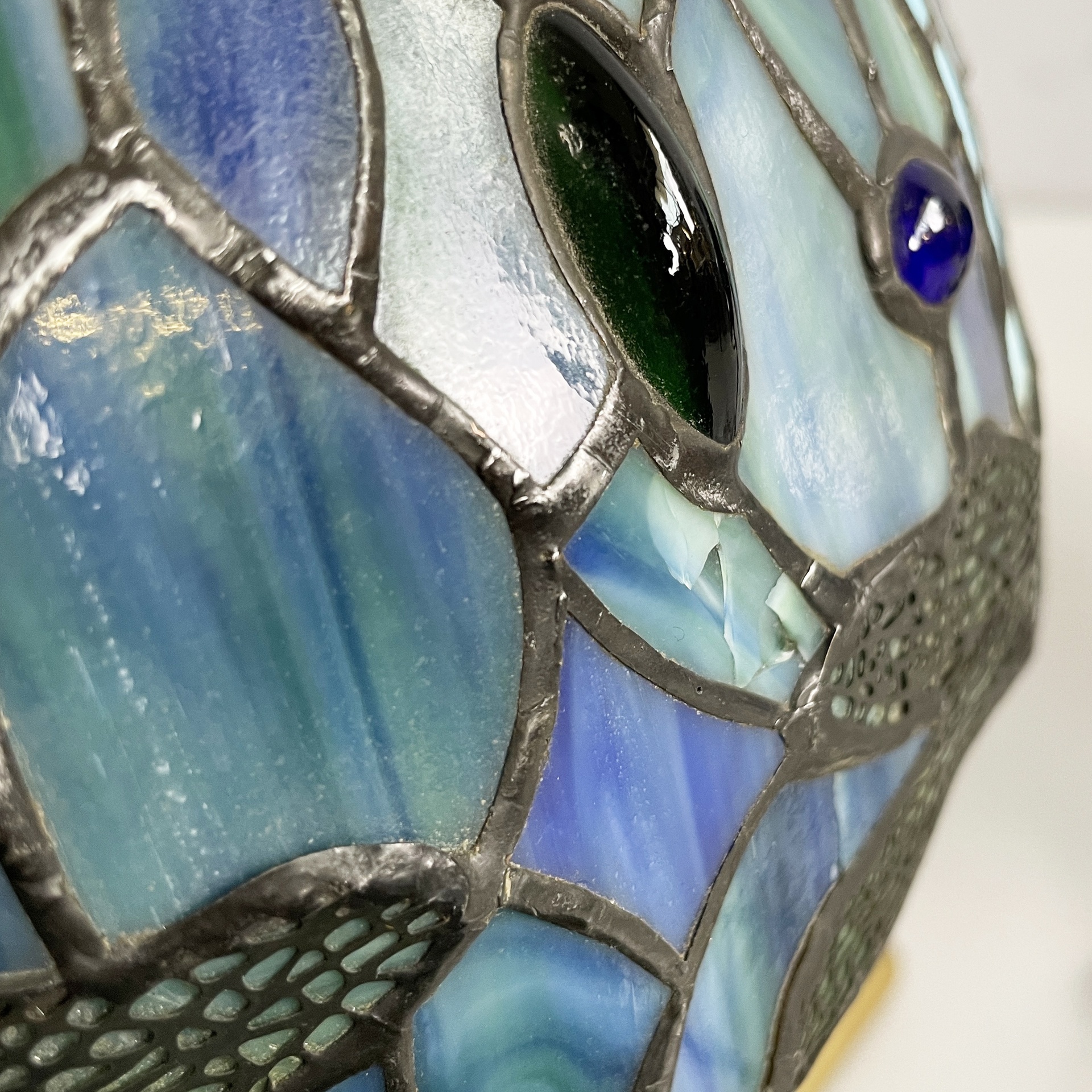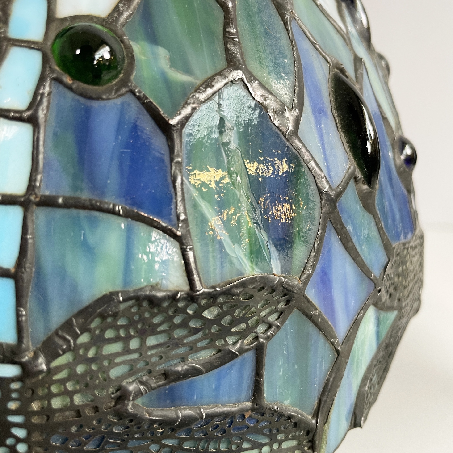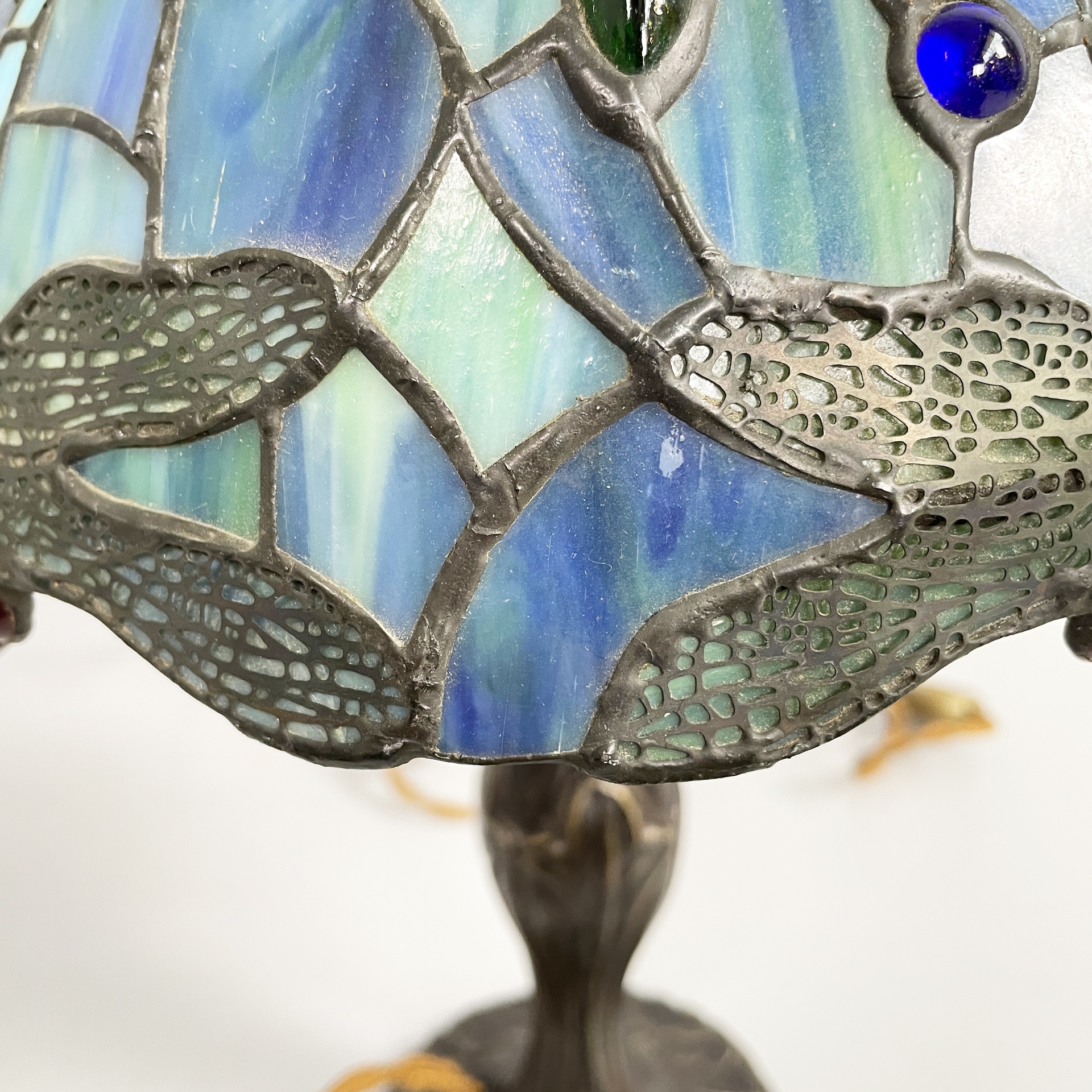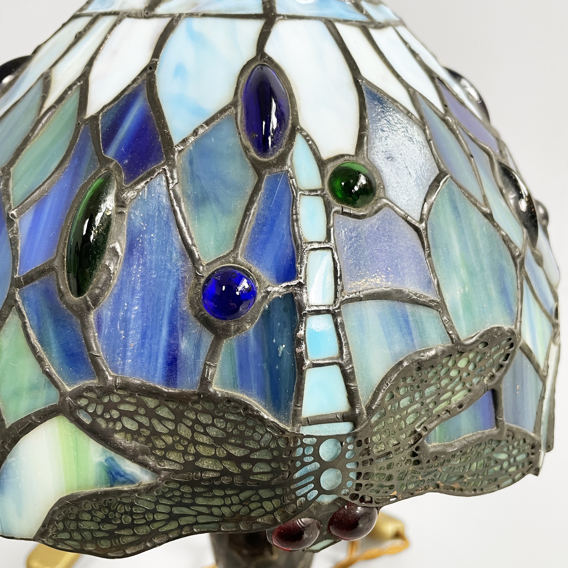 Coppia di lampade da tavolo con paralume in vetro piombato nei colori azzurro verde e blu. Sul paralume sono presenti decori ellittici in rilievo e disegni di libellule sul profilo. Nella parte superiore è presente un elemento in ottone brunito che permette di fissare il diffusore alla struttura la quale è tonda ed è in ottone brunito finemente lavorato. In stile Tiffany e in stile Liberty.