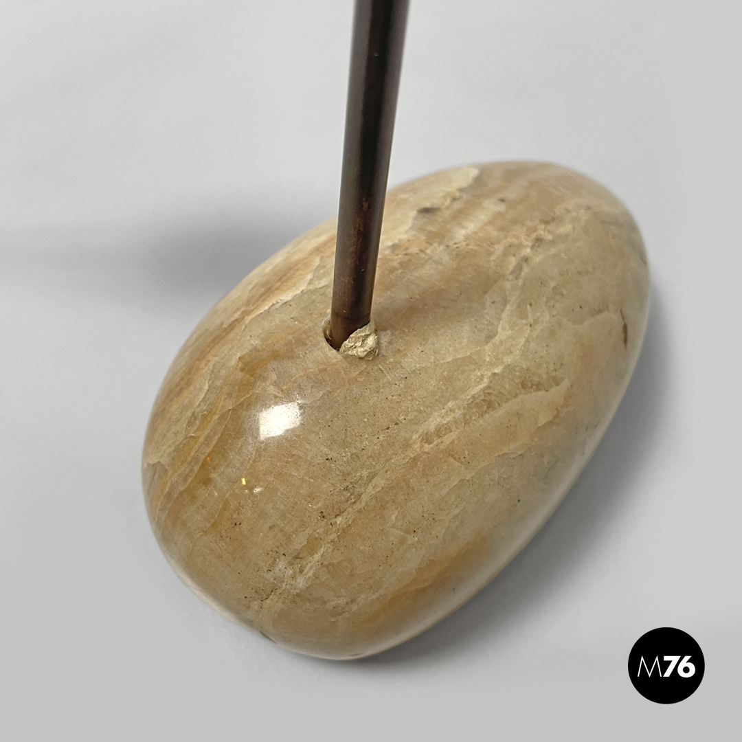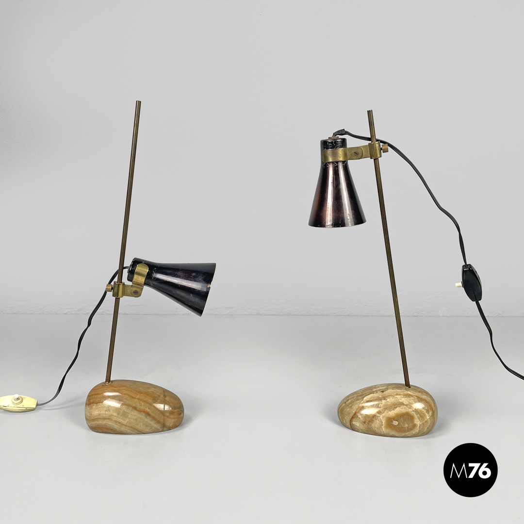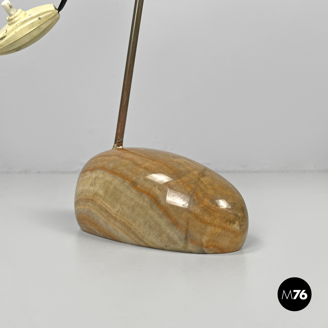 Coppia di lampade da tavolo modello LTA1 Sasso. La base è costituita da un sasso in onice tondeggiante allungato con sfumature e striature sui toni del beige e del marrone. Lo stelo è in tondino di ottone ed il paralume di cui si può modificare l’altezza e la direzione è in ottone brunito con attacco della lampadina E14.