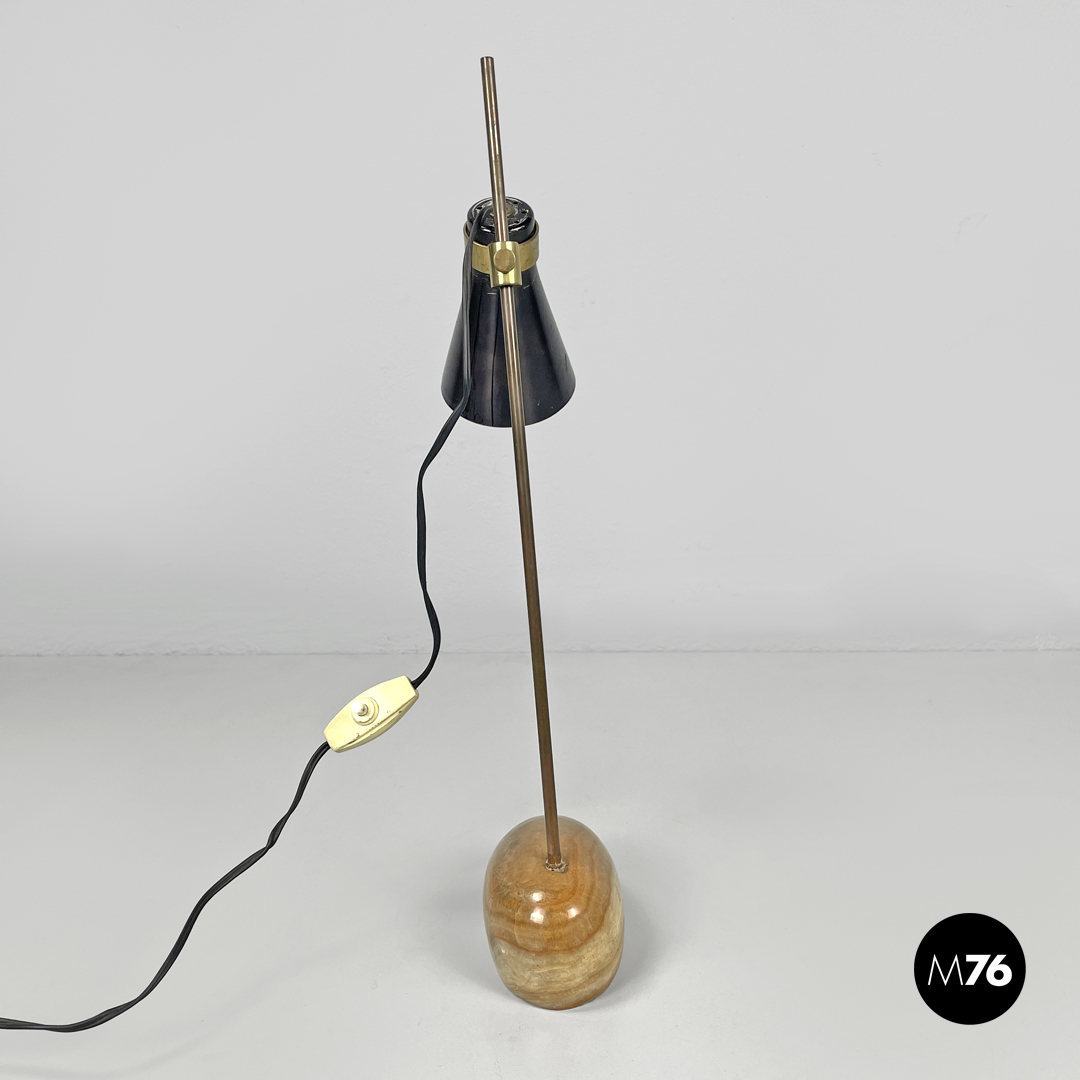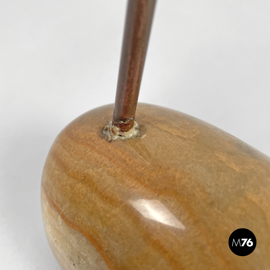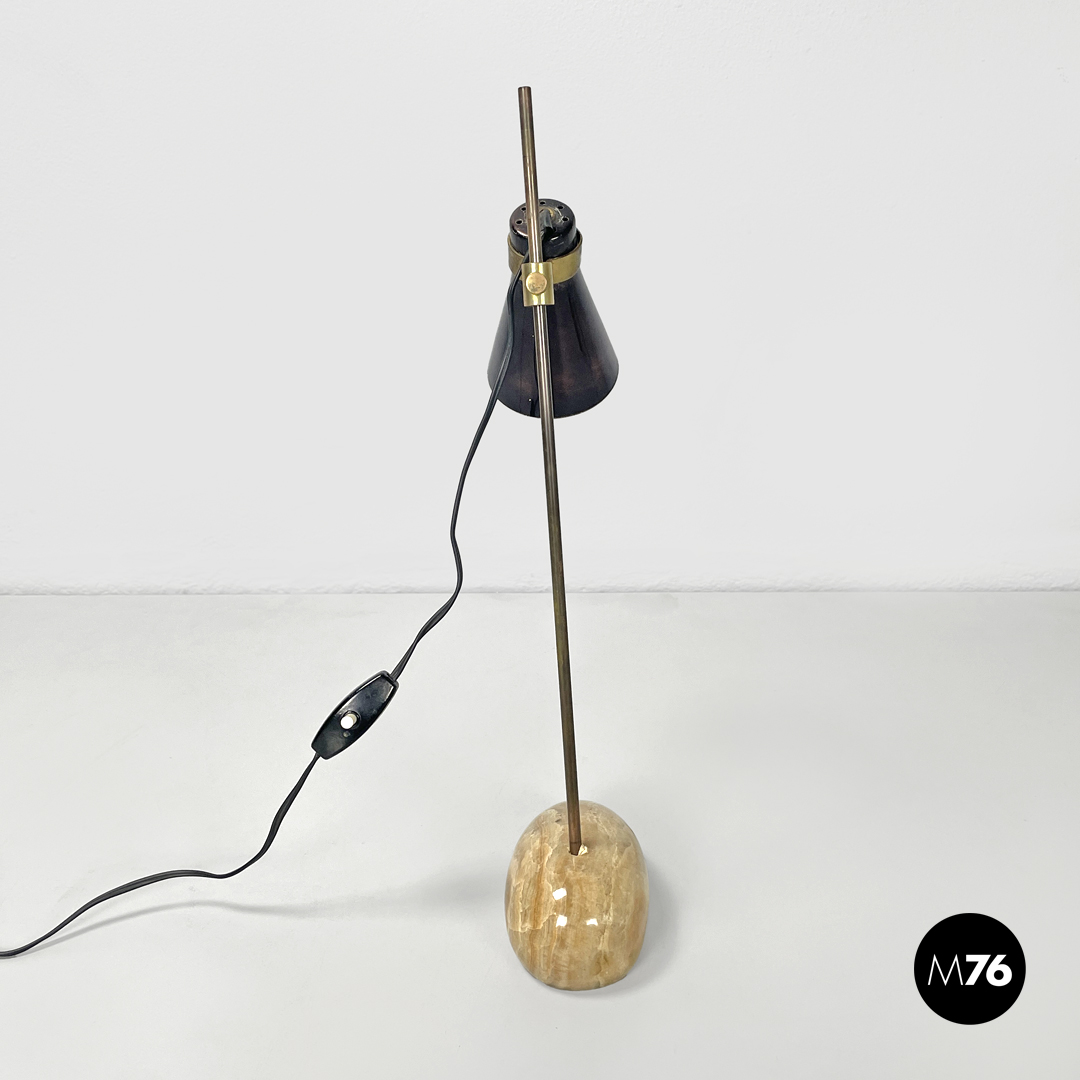 Coppia di lampade da tavolo modello LTA1 Sasso. La base è costituita da un sasso in onice tondeggiante allungato con sfumature e striature sui toni del beige e del marrone. Lo stelo è in tondino di ottone ed il paralume di cui si può modificare l’altezza e la direzione è in ottone brunito con attacco della lampadina E14.