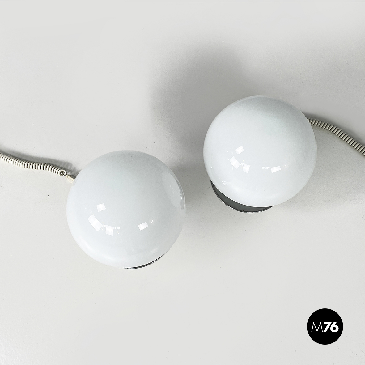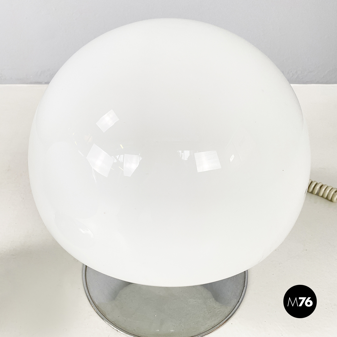 Coppia di lampade da tavolo modello Mushroom con diffusore a forma di fungo in vetro opalino. La base tonda è in acciaio cromato. Queste lampade sono perfette come lampada da comodino o abajur.