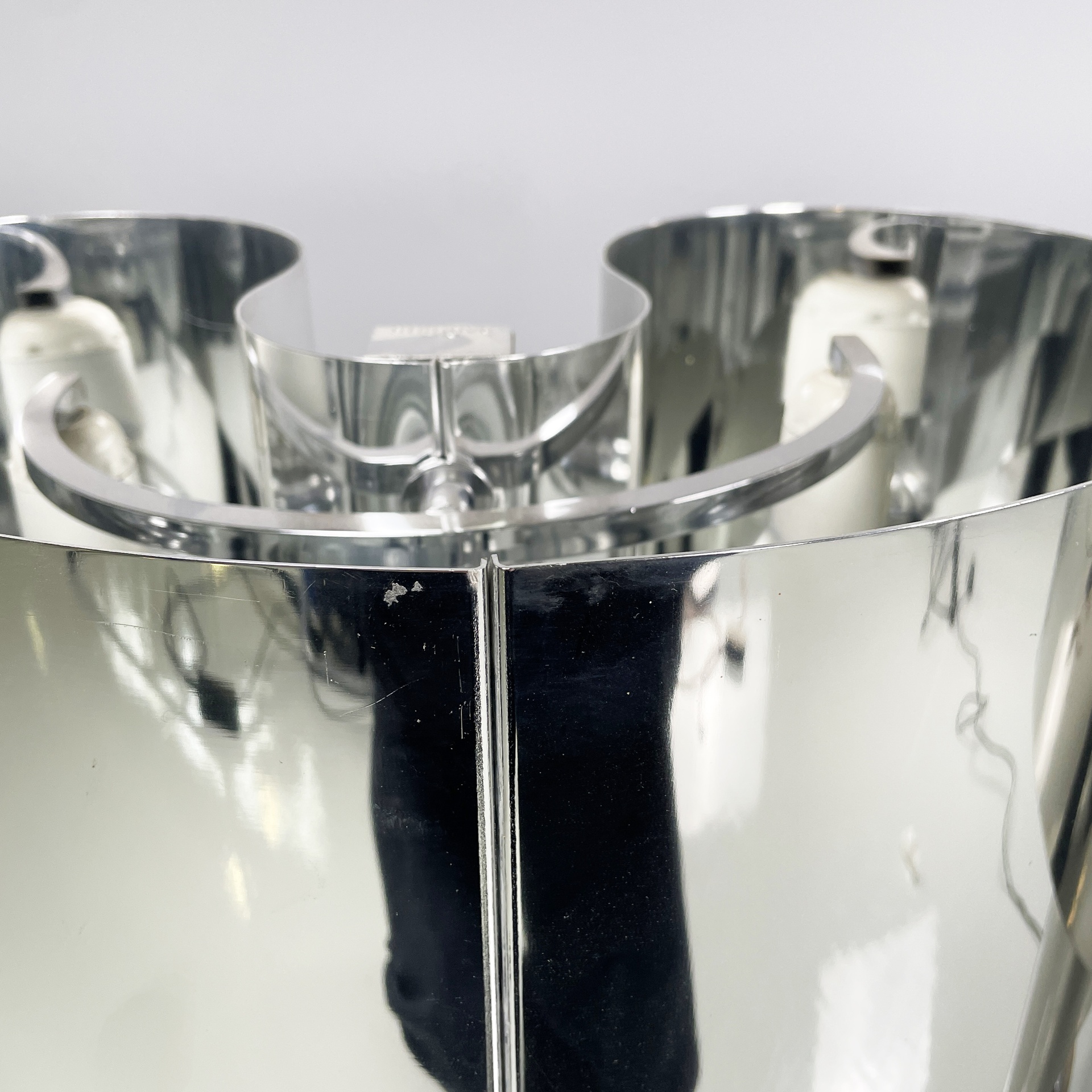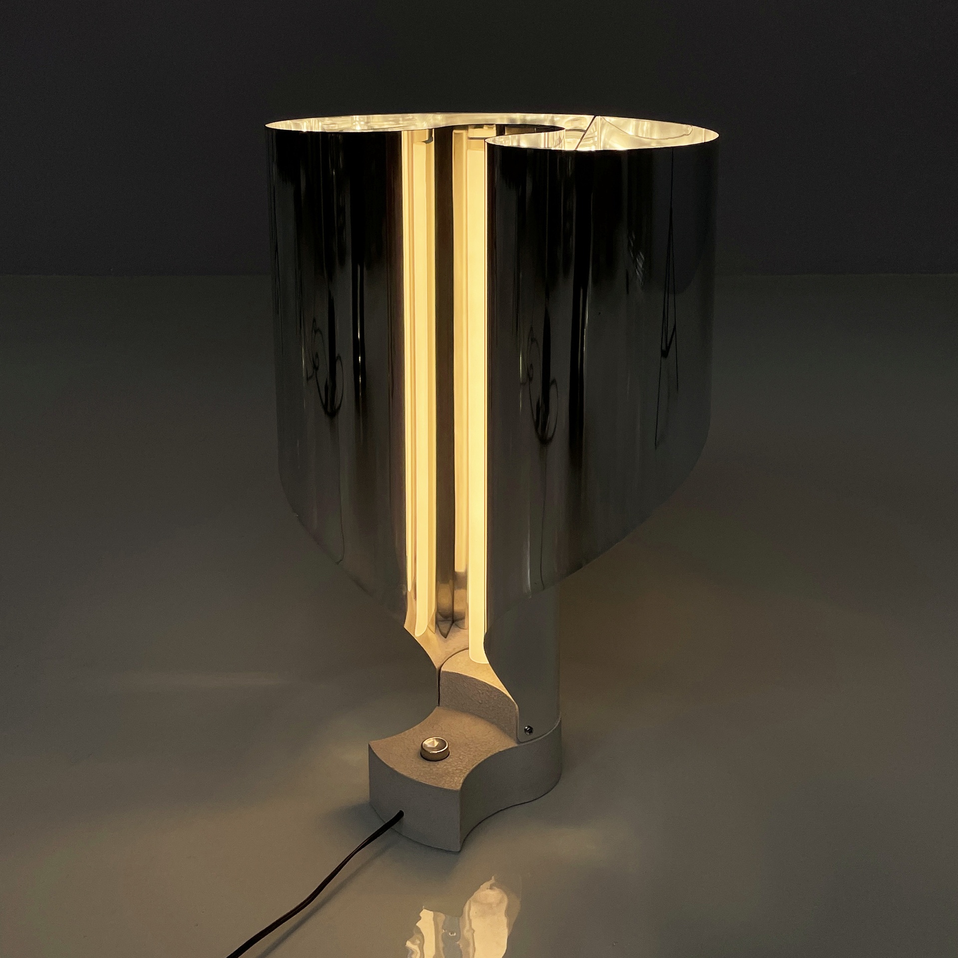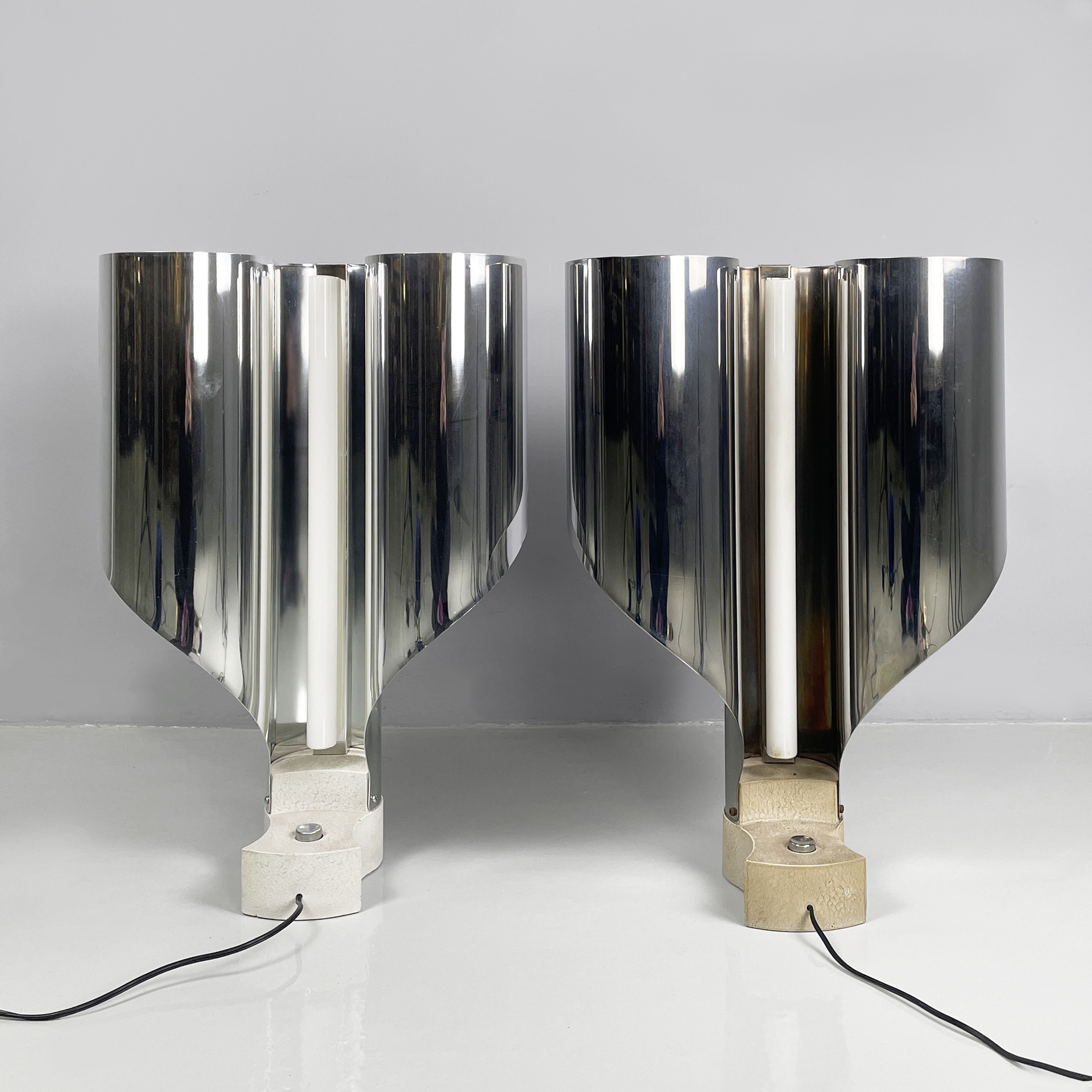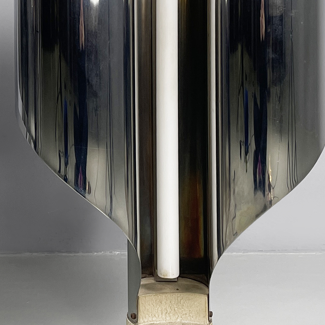 Buone condizioni segni sparsi dati dal tempo sull’alluminio. Una base è più scura. Il neon della lampada con base più scura attualmente non funzionante.