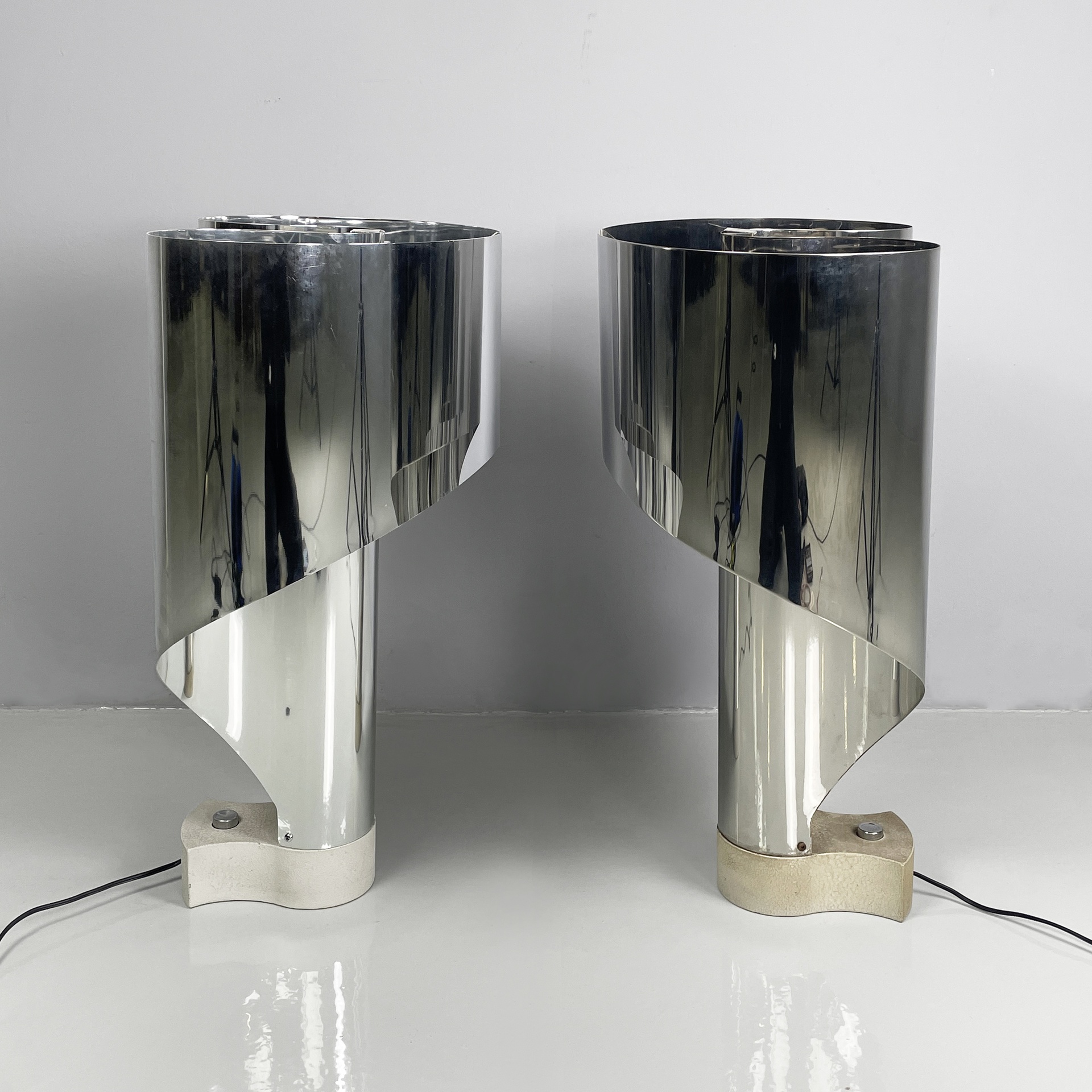 Coppia di lampade da tavolo modello Spinnaker con paralume in lamiera d’alluminio curvata. Presenta tre fonti luminose: due nella parte anteriore con attacchi E27 e il terzo è un lungo neon verticale nella parte posteriore. La base sagomata è in metallo bianco con finitura cracquelè. In patina.