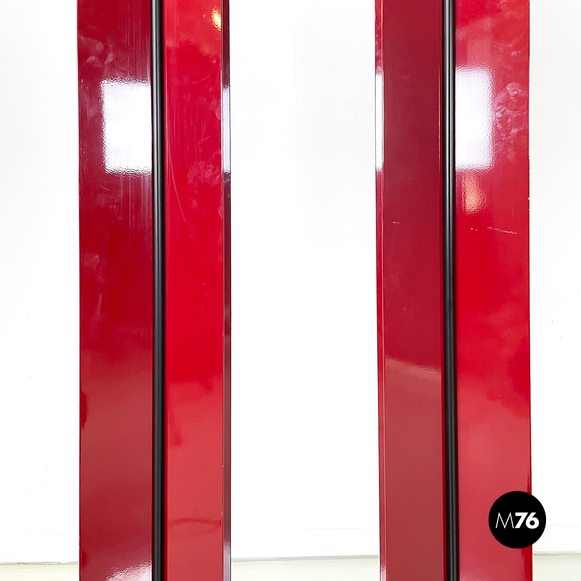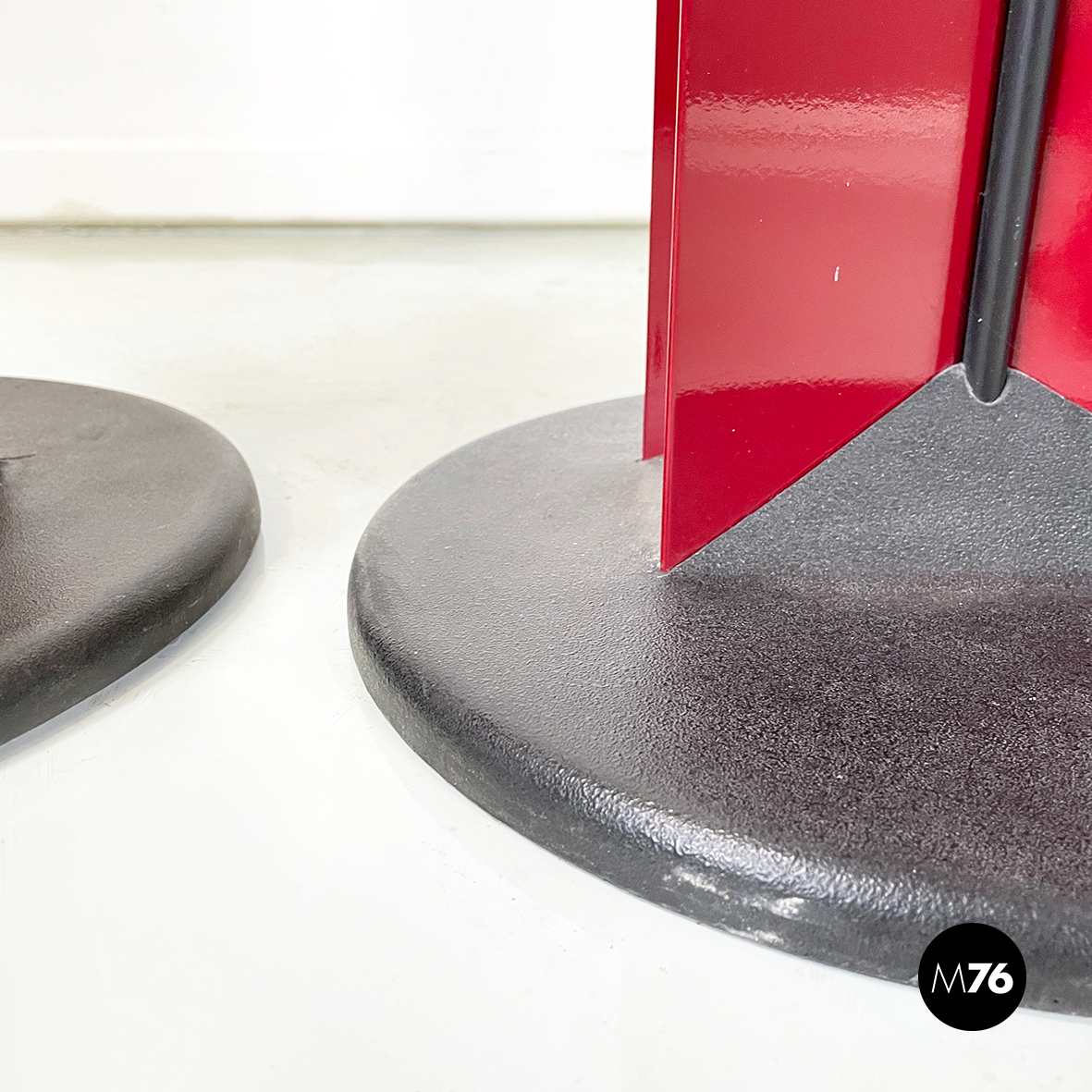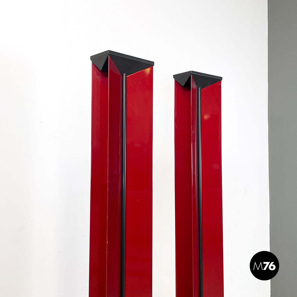 Coppia di lampade da terra con struttura composta da lastre di metallo verniciato rosso lucido poste a X. Al centro dell struttura è presente una striscia di plastica nero. Nella parte alta è presente il diffusore triangolare. La base tonda con copertura in gomma nera.