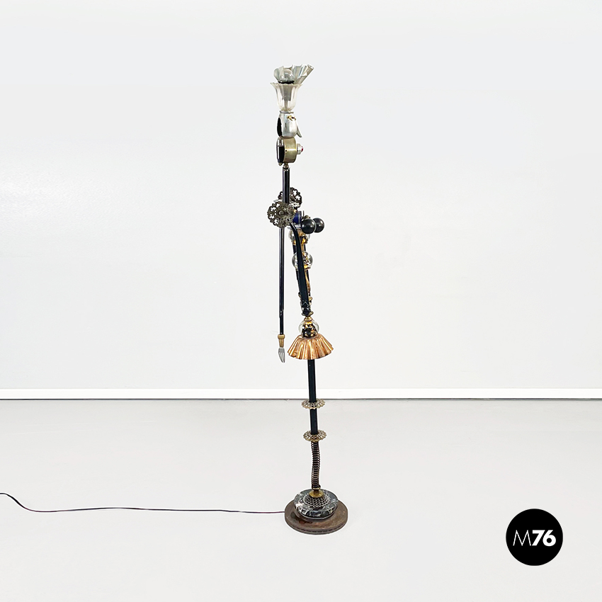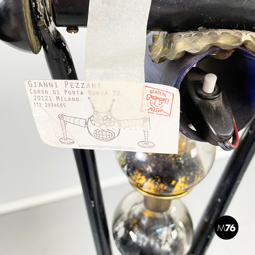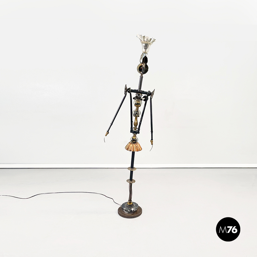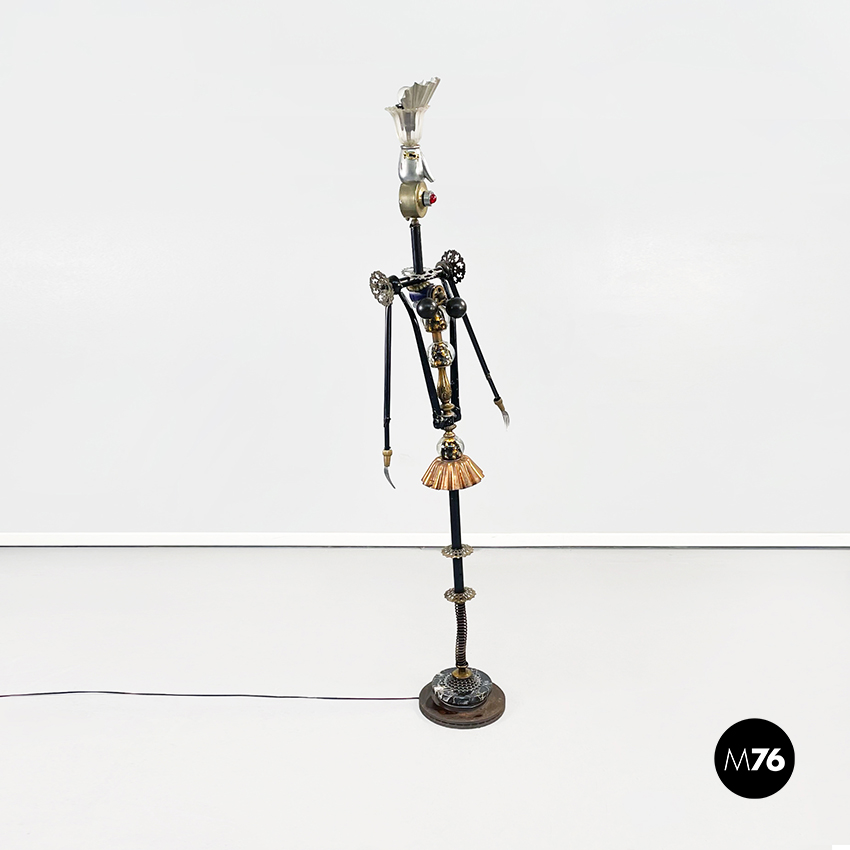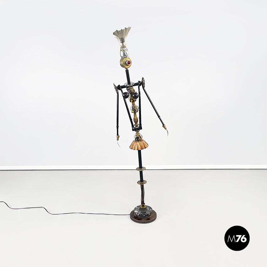 Coppia di sculture e lampade da terra di forma umanoide in metallo ottone marmo scuro e vetro. Queste lampade presentano due luci di cui una rossa entrambe poste all’altezza della testa. Il corpo centrale è composto da una serie di tubolari in metallo verniciato nero ingranaggi dorati e sfere in vetro trasparente nero e giallo. Le braccia mobili terminano con una mano composta da una forchetta. La base tonda è in marmo e metallo.