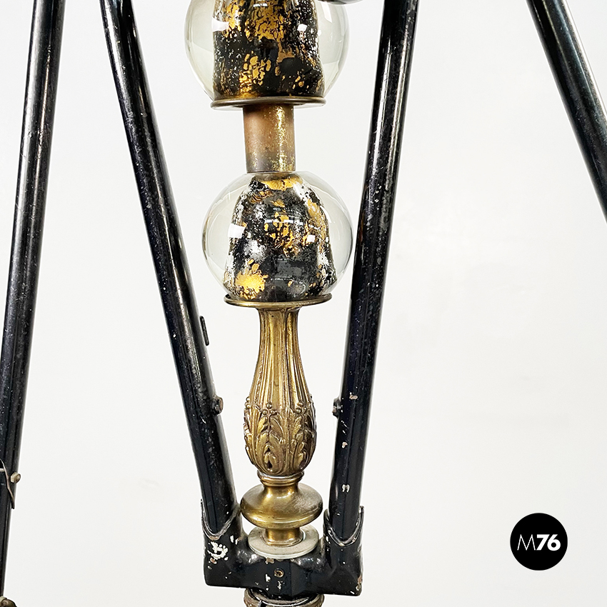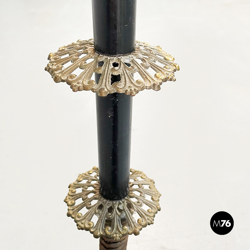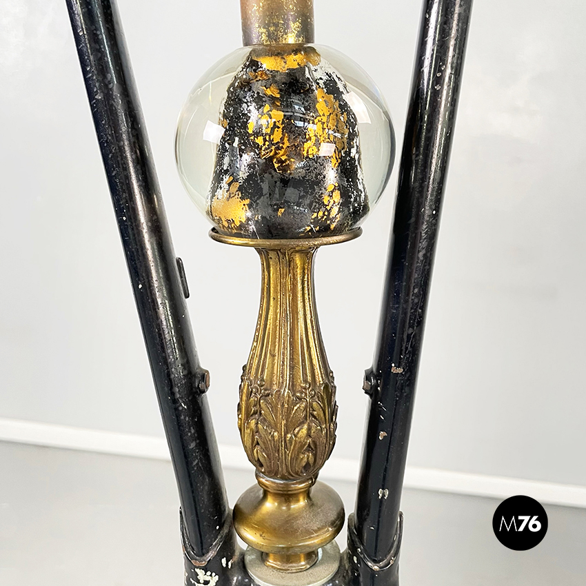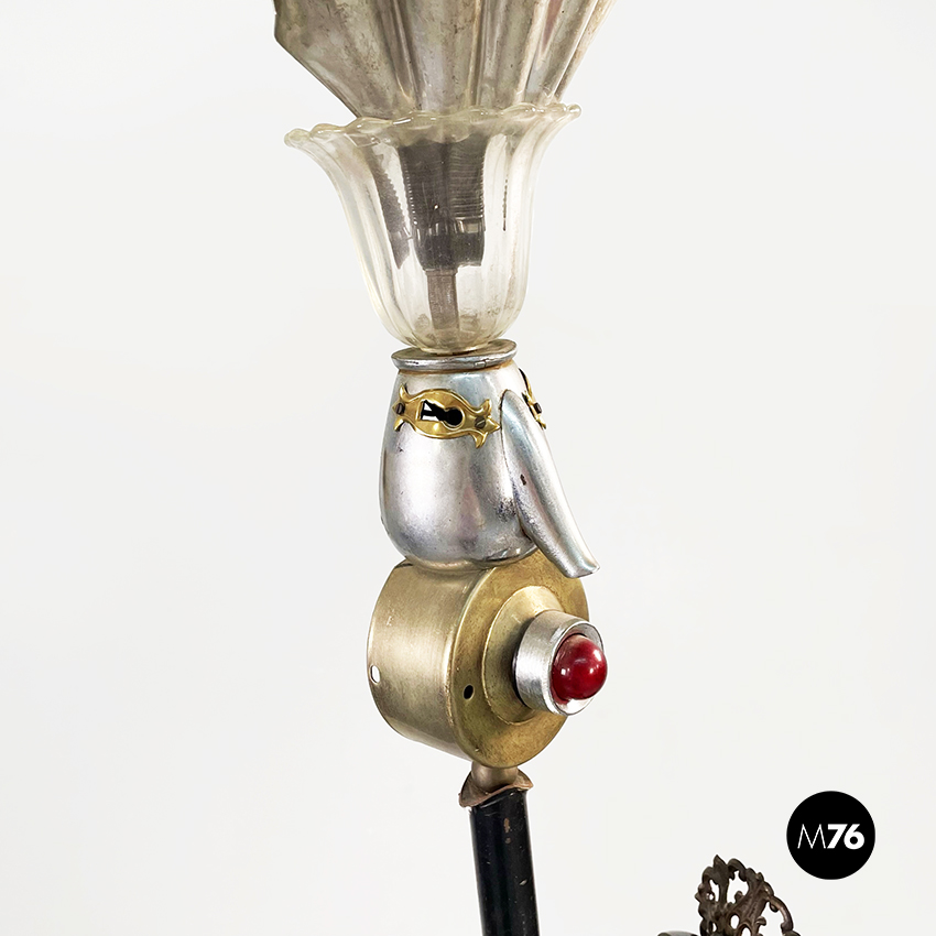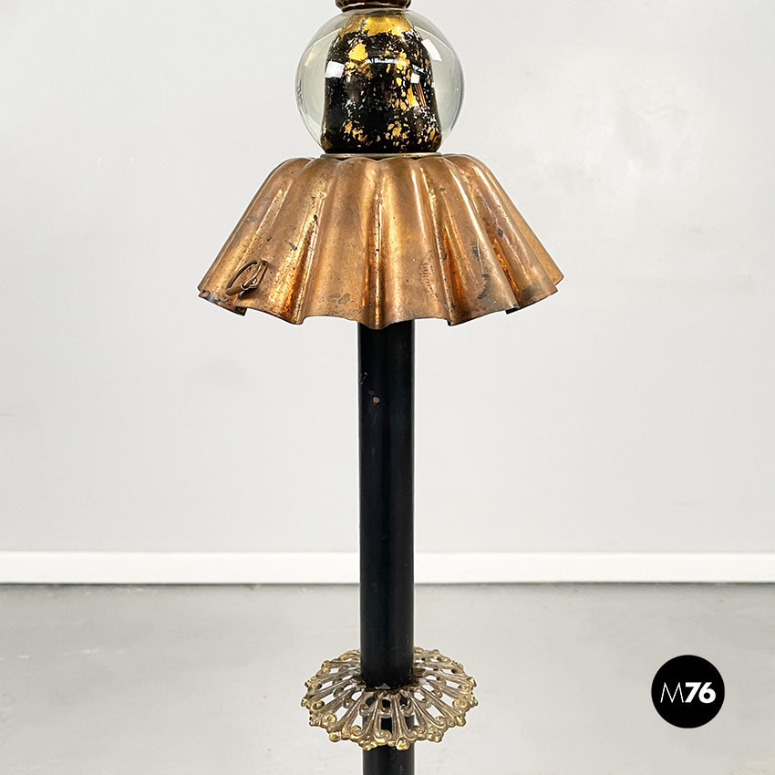 Coppia di sculture e lampade da terra di forma umanoide in metallo ottone marmo scuro e vetro. Queste lampade presentano due luci di cui una rossa entrambe poste all’altezza della testa. Il corpo centrale è composto da una serie di tubolari in metallo verniciato nero ingranaggi dorati e sfere in vetro trasparente nero e giallo. Le braccia mobili terminano con una mano composta da una forchetta. La base tonda è in marmo e metallo.