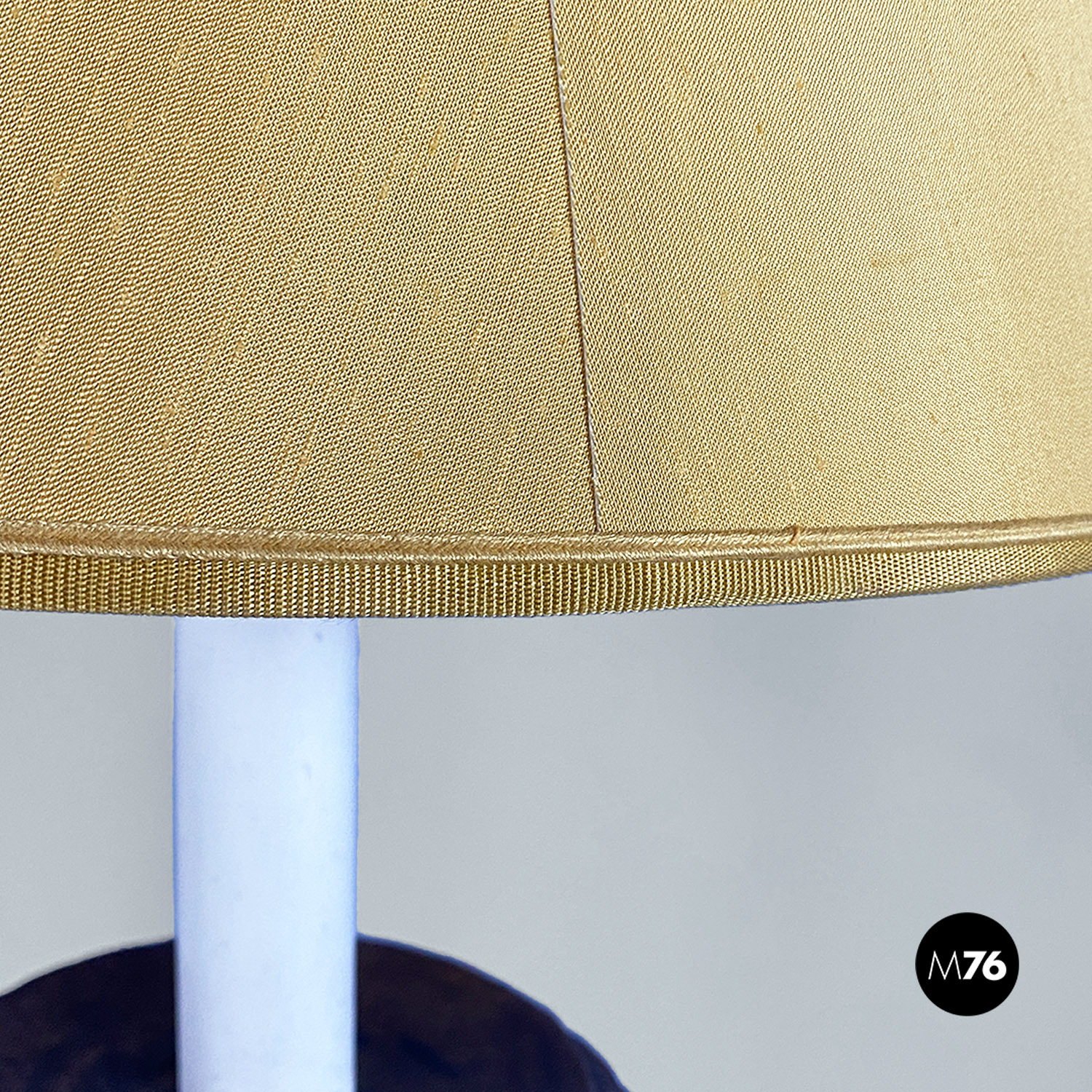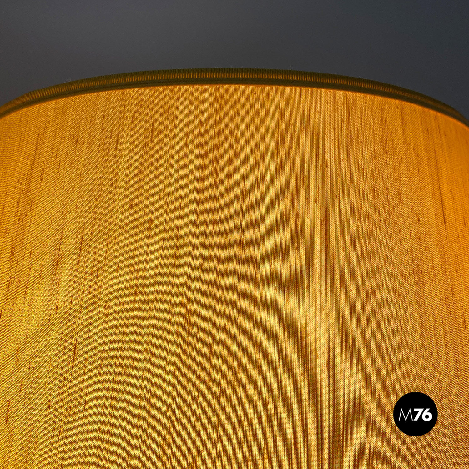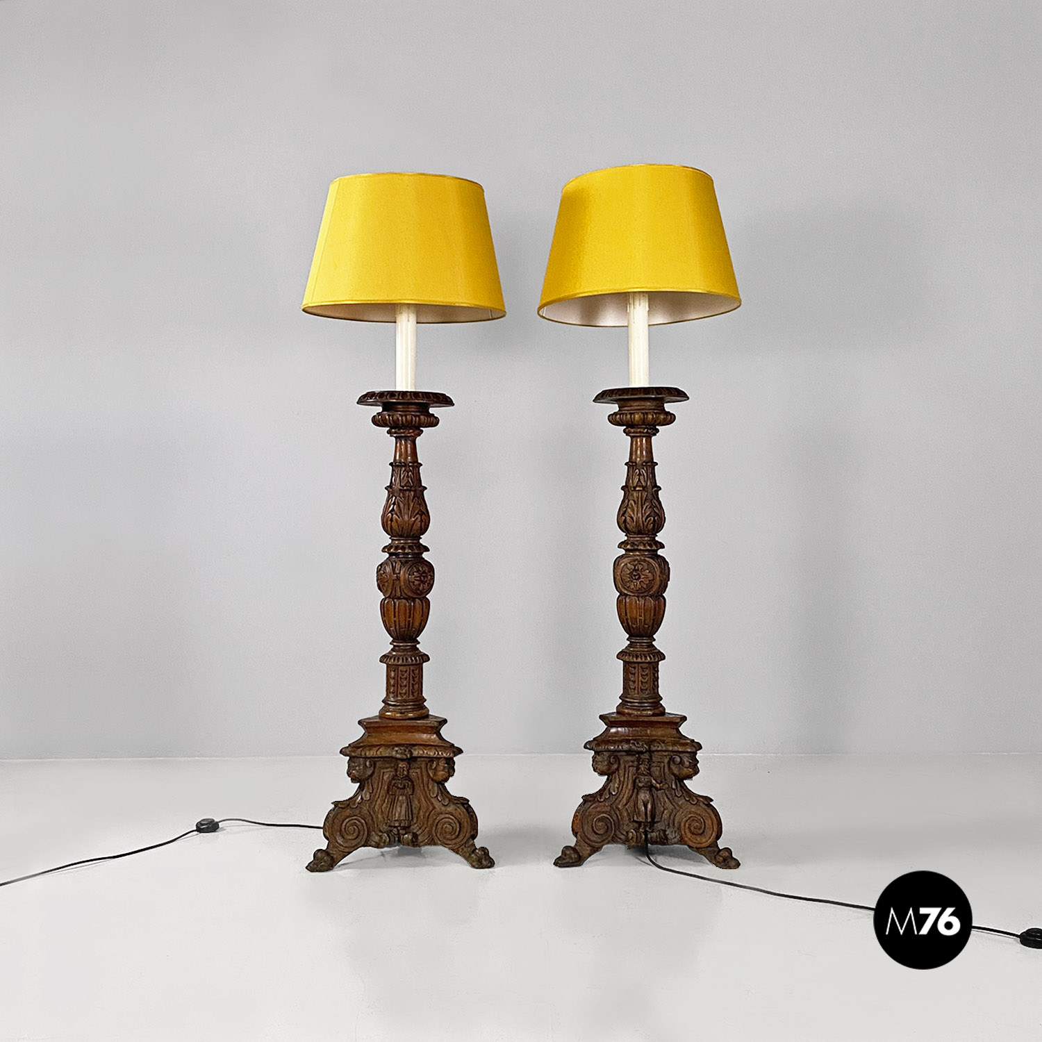 Coppia di lampade da terra o torciere con struttura in legno scuro in patina finemente intagliato e paralume in tessuto giallo di produzione moderna.
