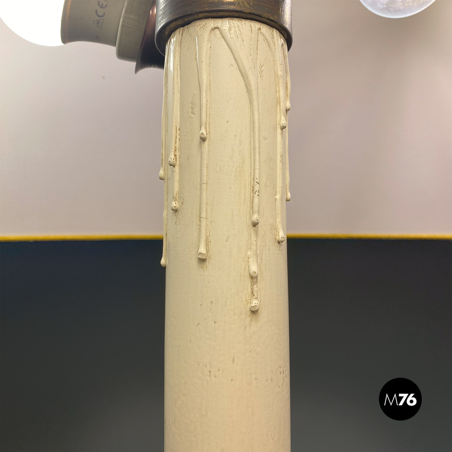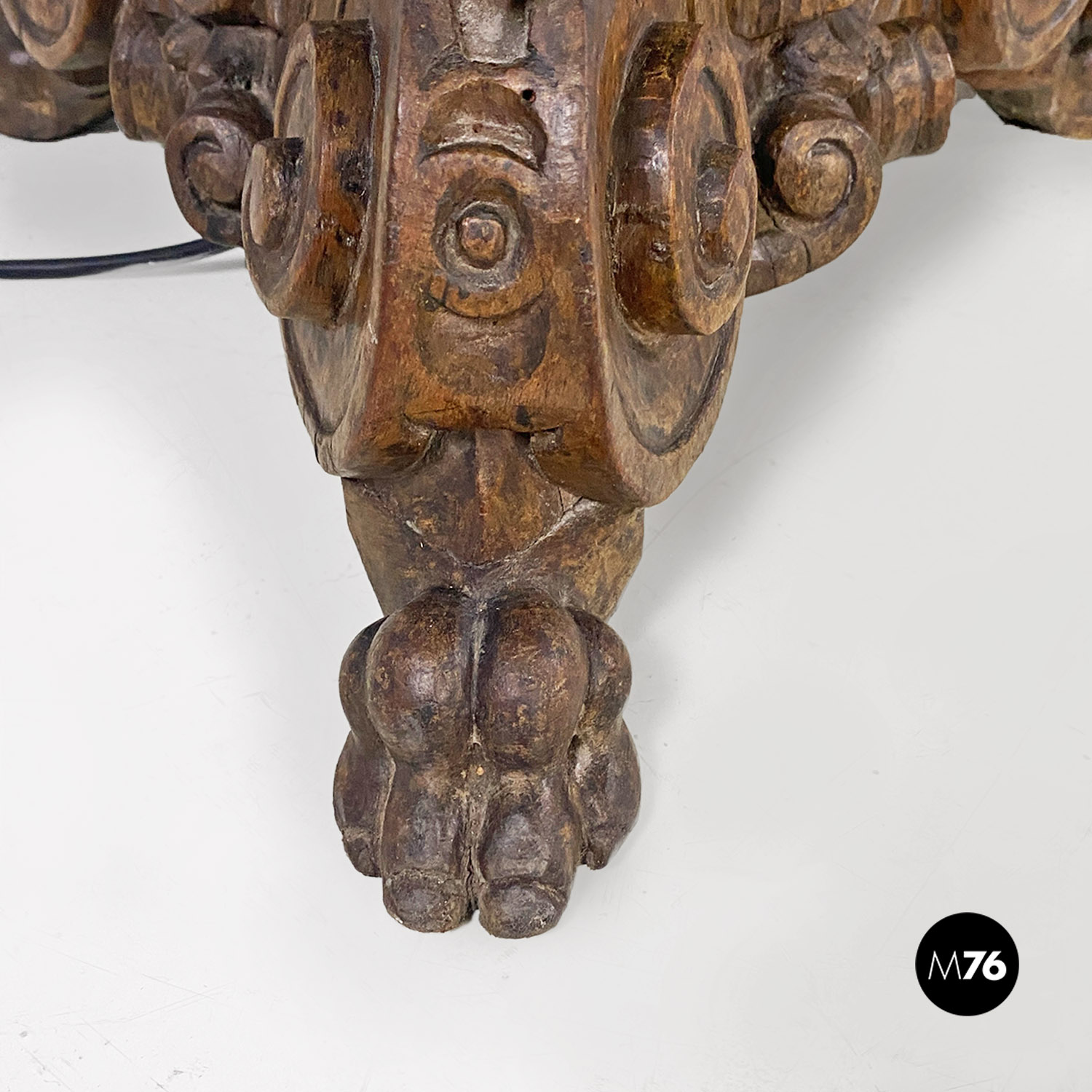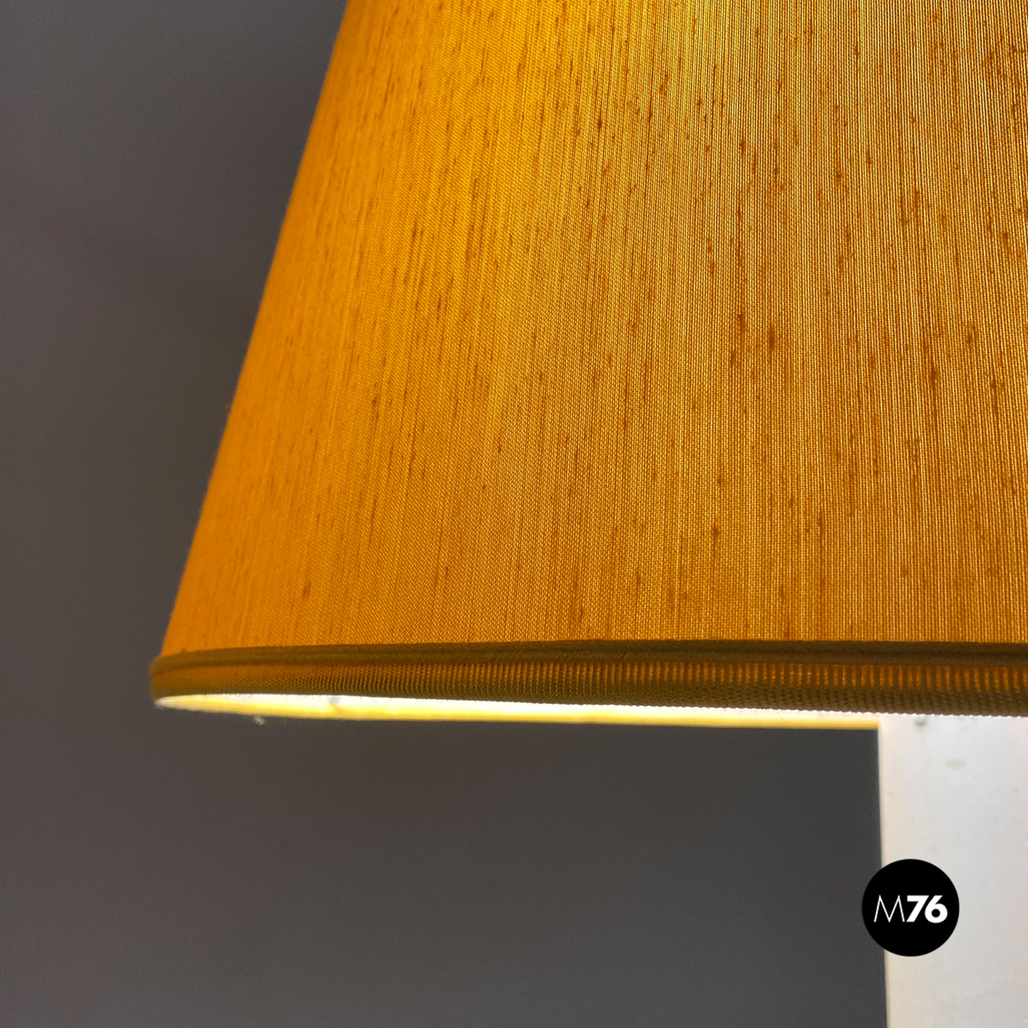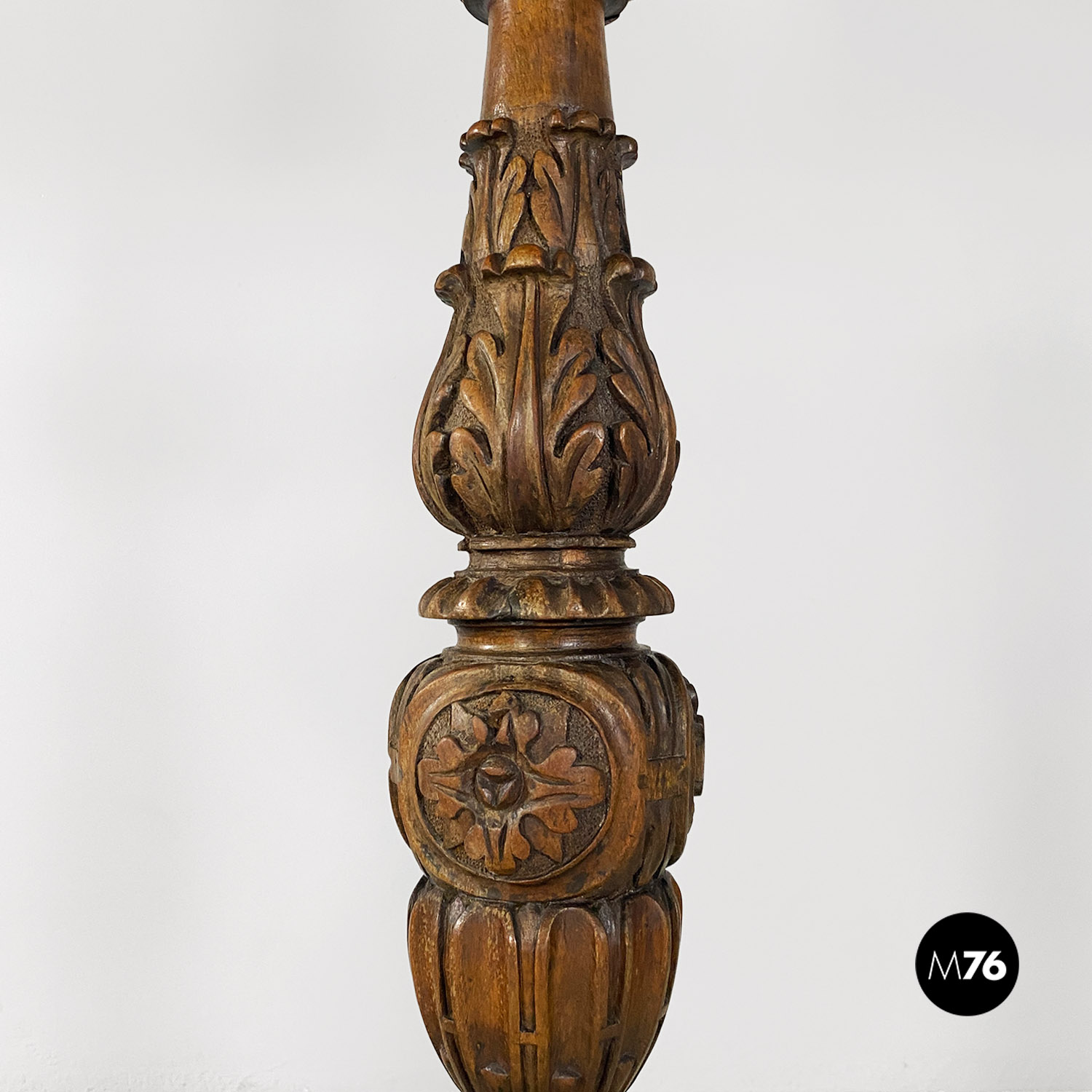 Coppia di lampade da terra o torciere con struttura in legno scuro in patina finemente intagliato e paralume in tessuto giallo di produzione moderna.