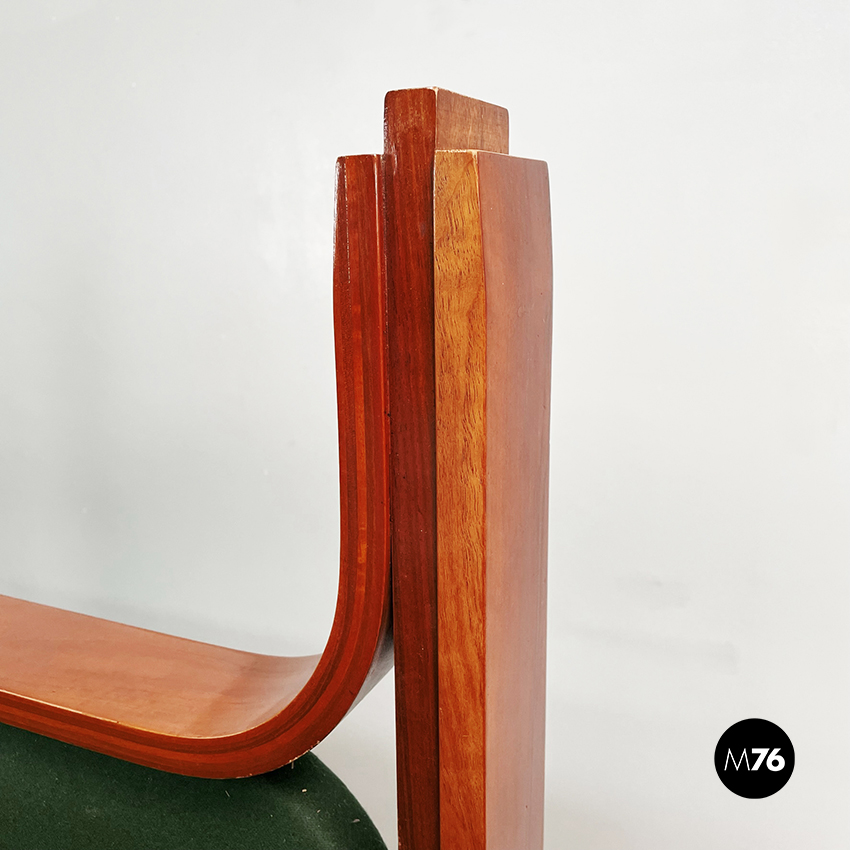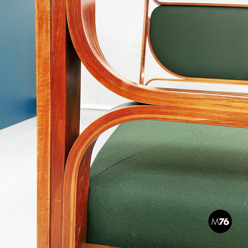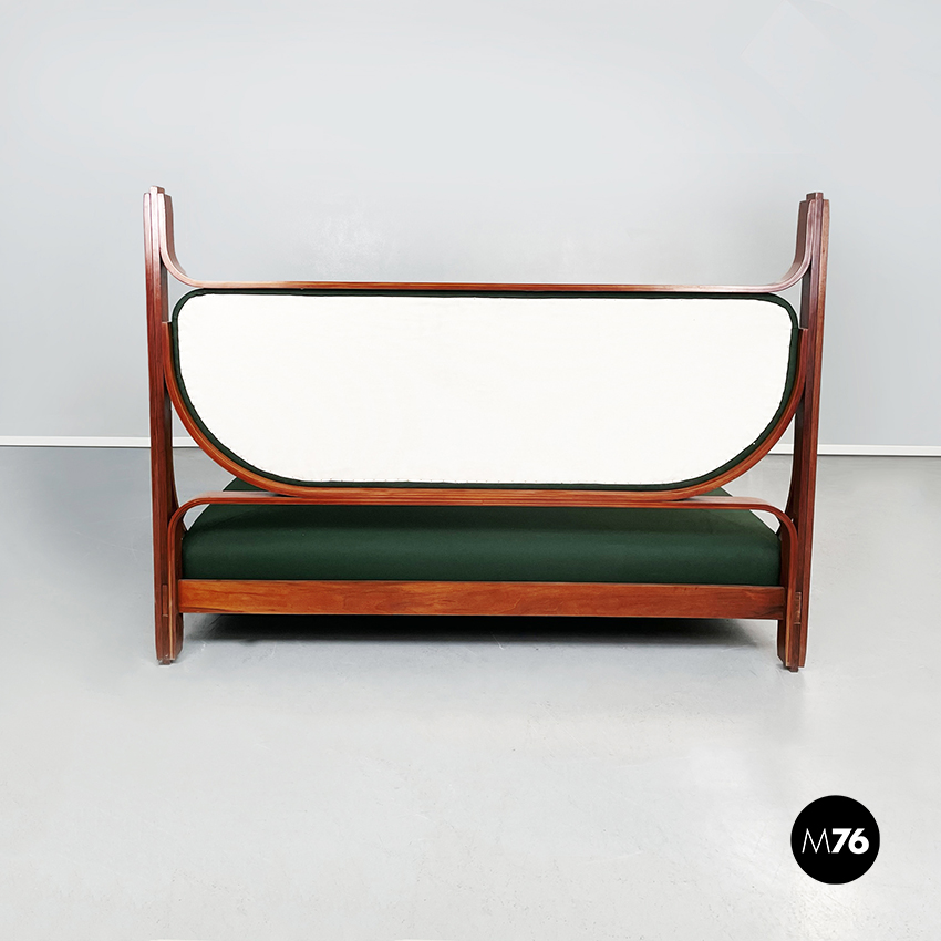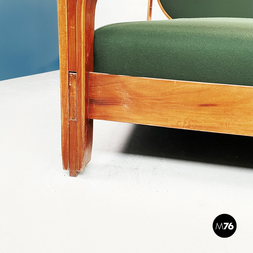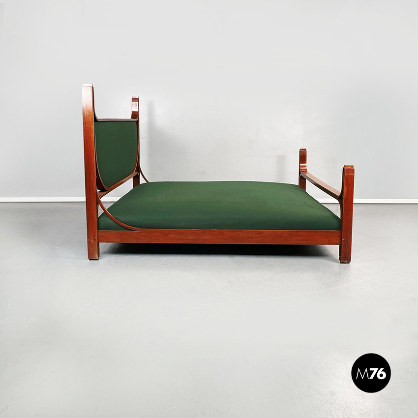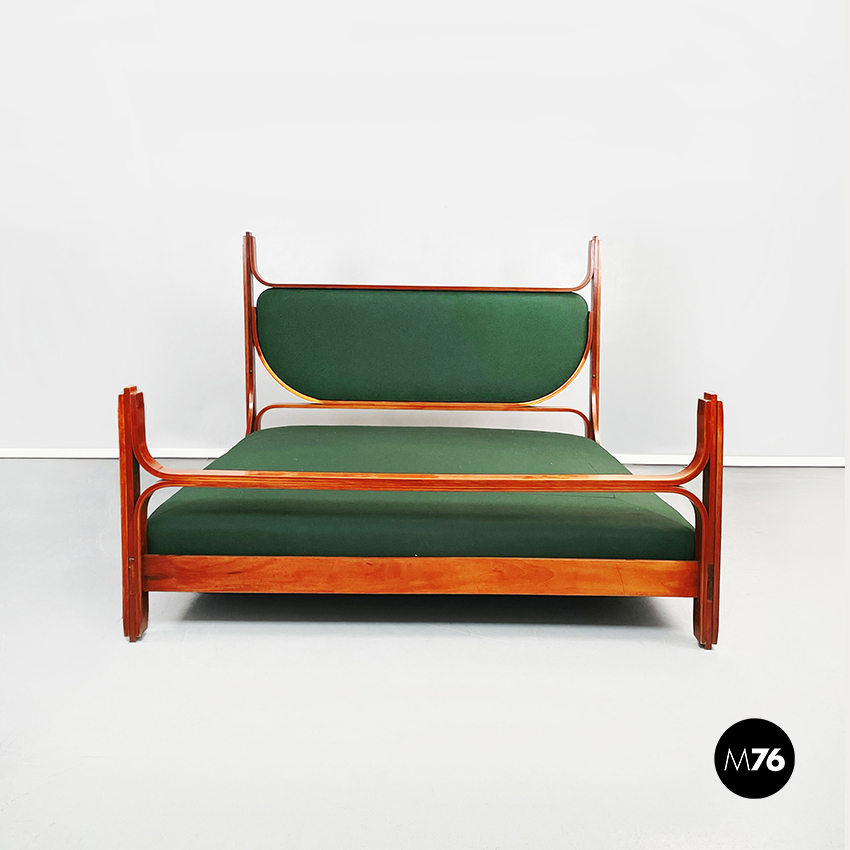 Letto matrimoniale mod. L12 con materasso rettangolare imbottito e rivestito in tessuto verde bosco. La struttura è in legno massello curvato. La testata è rifinita con un’imbottitura rivestiva in tessuto verde bosco.