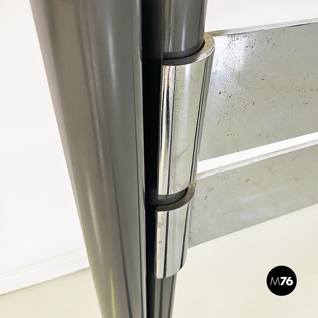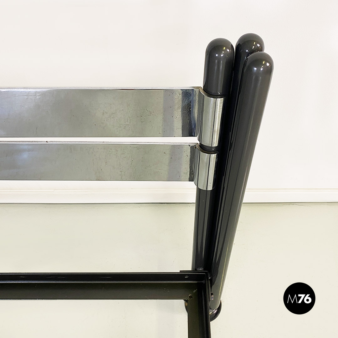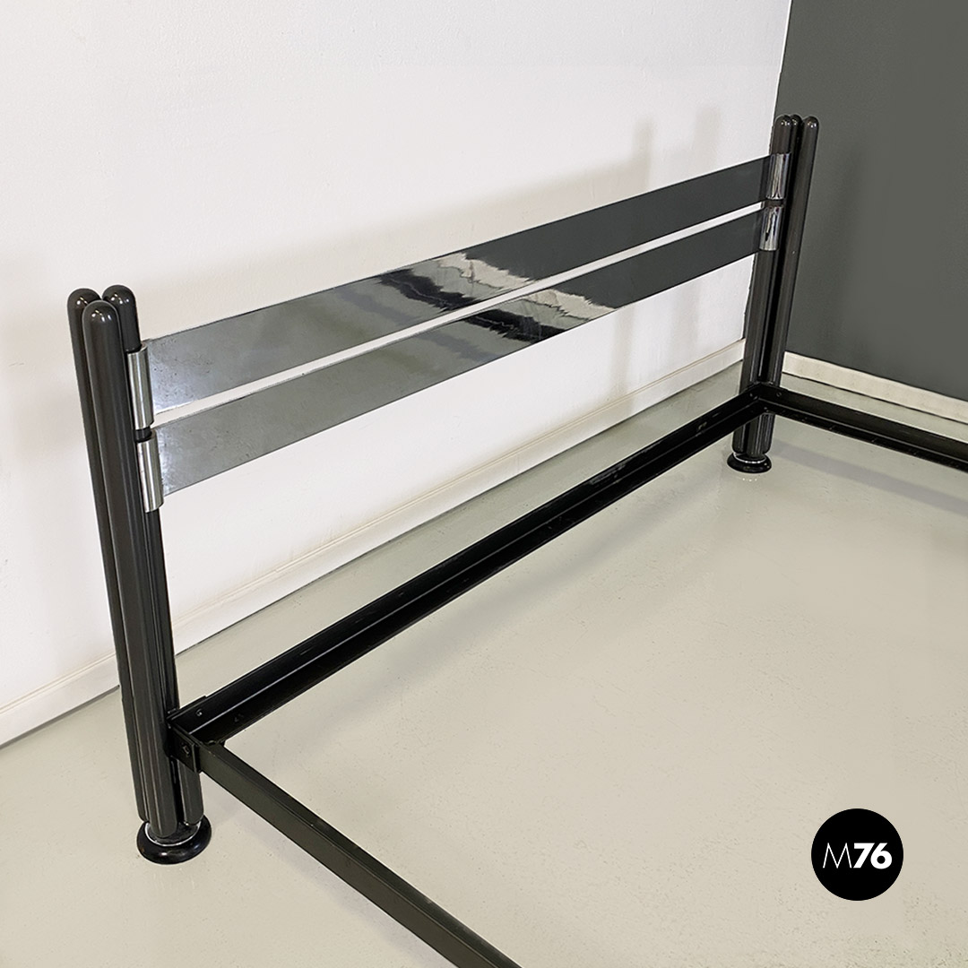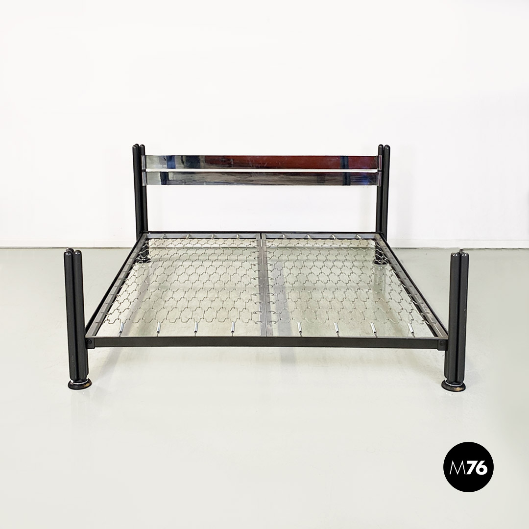 Letto matrimoniale modello Tris con struttura in metallo grigio con testata composta da una doppia fascia in acciaio cromato e zampe composte da tre parti a sezione tonda con puntale in legno. Disponibile su richiesta la rete a doghe in legno chiaro.