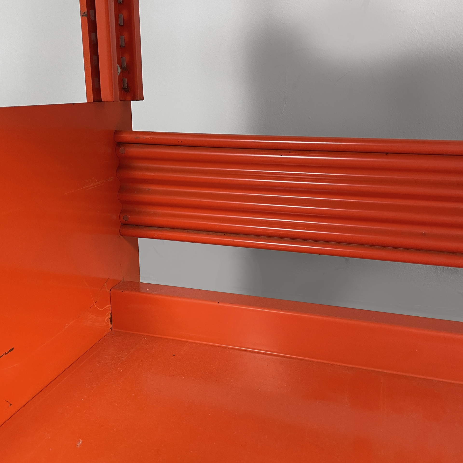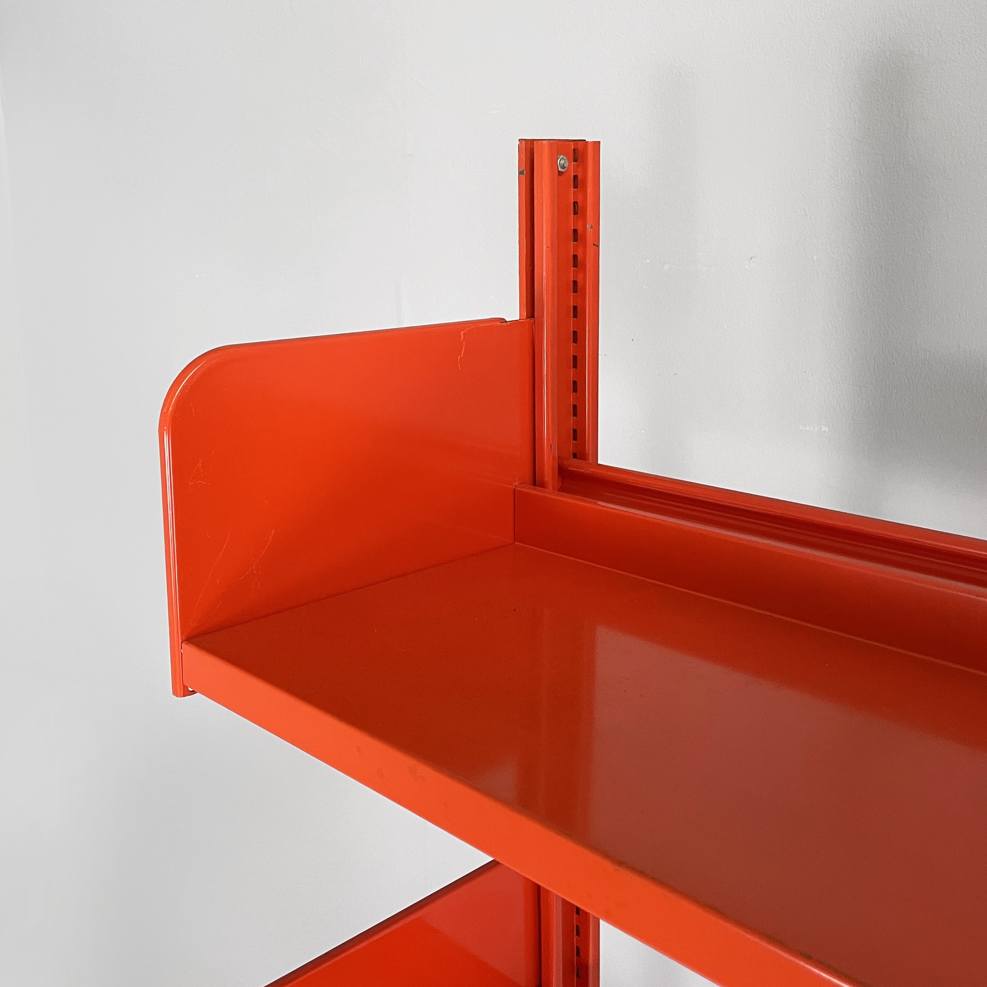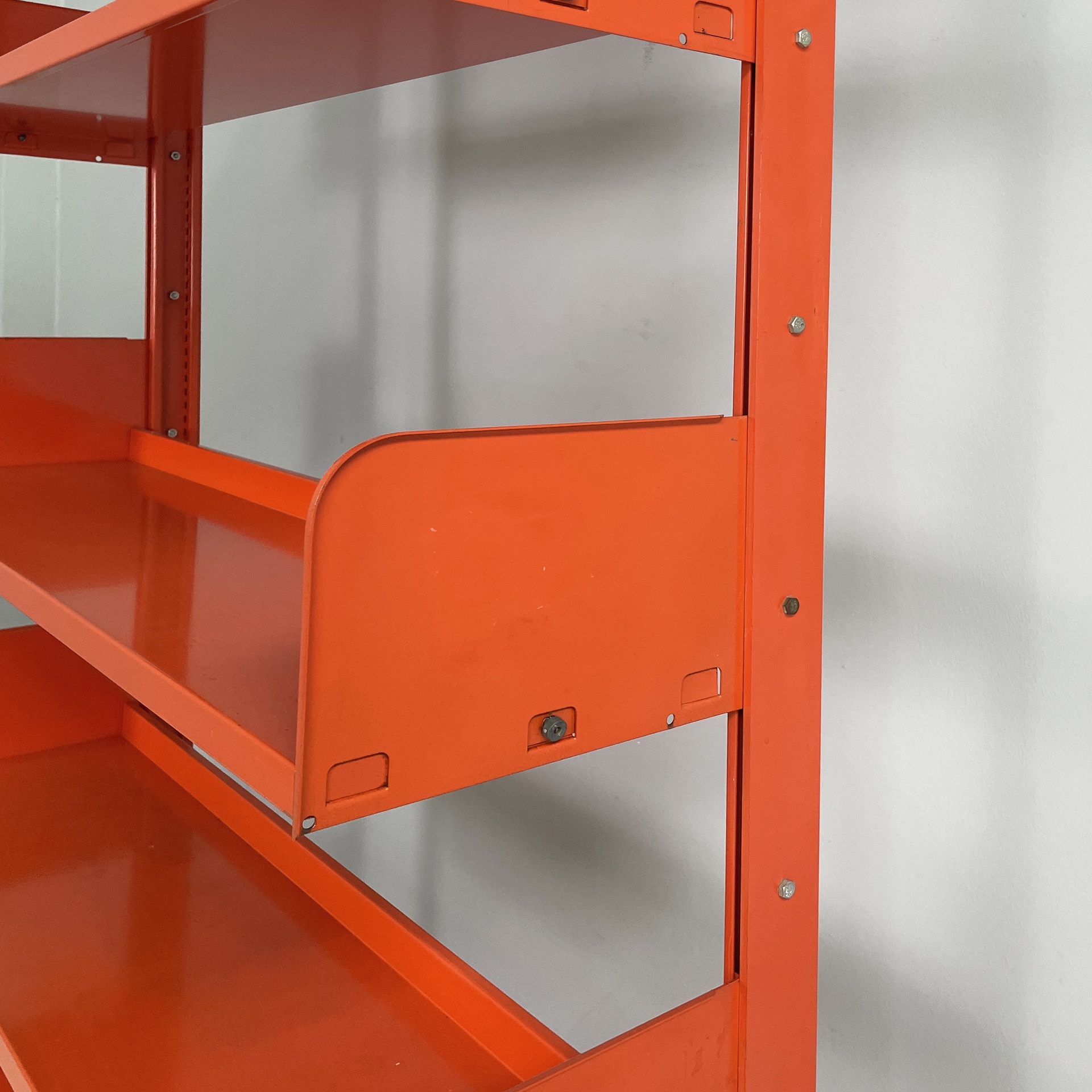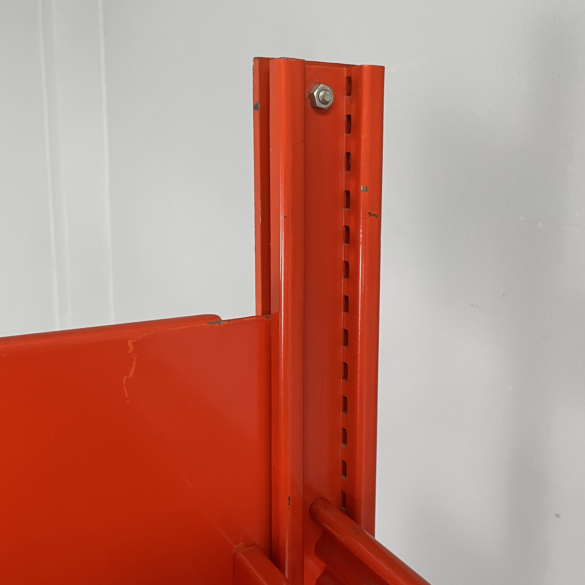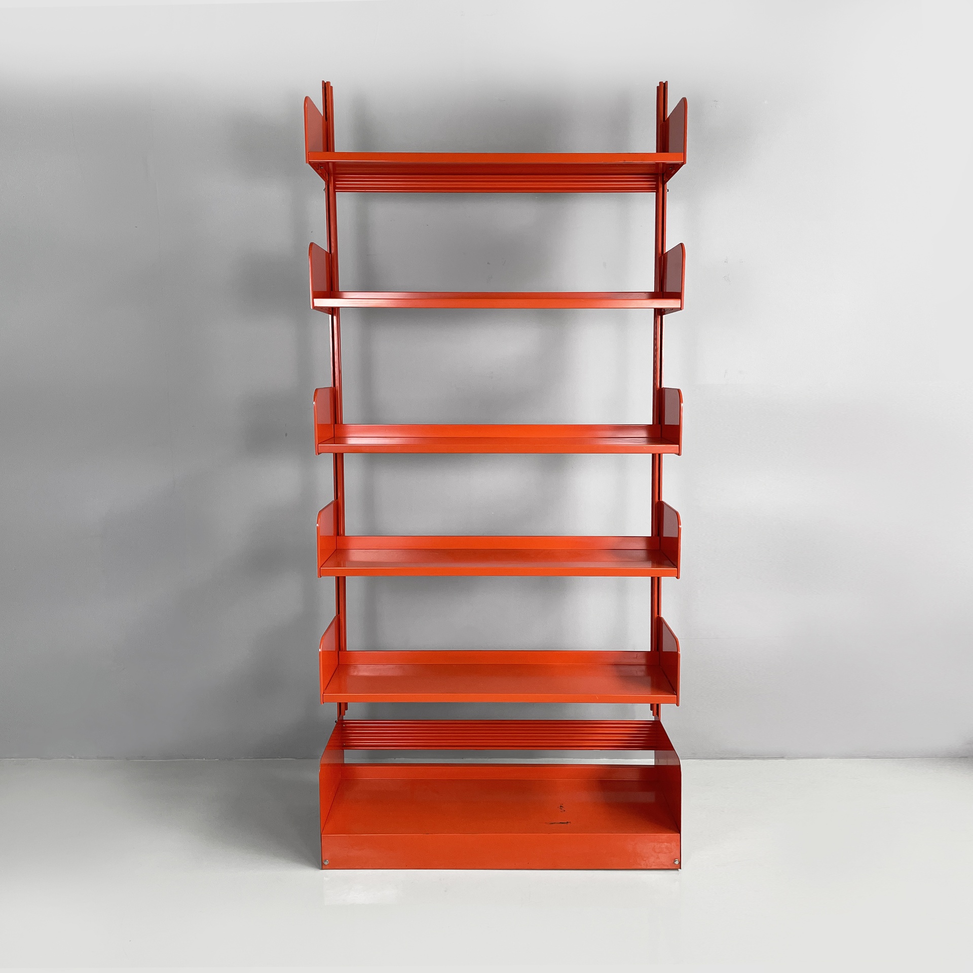 Libreria modello Congresso interamente in metallo verniciato arancione-rosso. Mensole rettangolari e reggi mensola fissati ad incastro manualmente, senza bisogno di altre componenti, alla struttura.