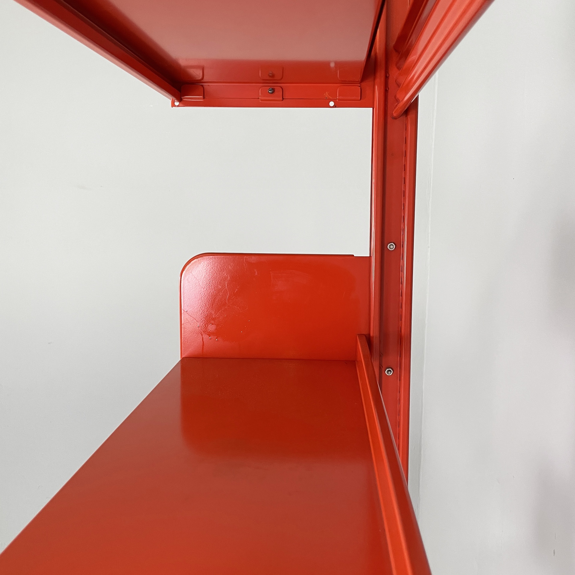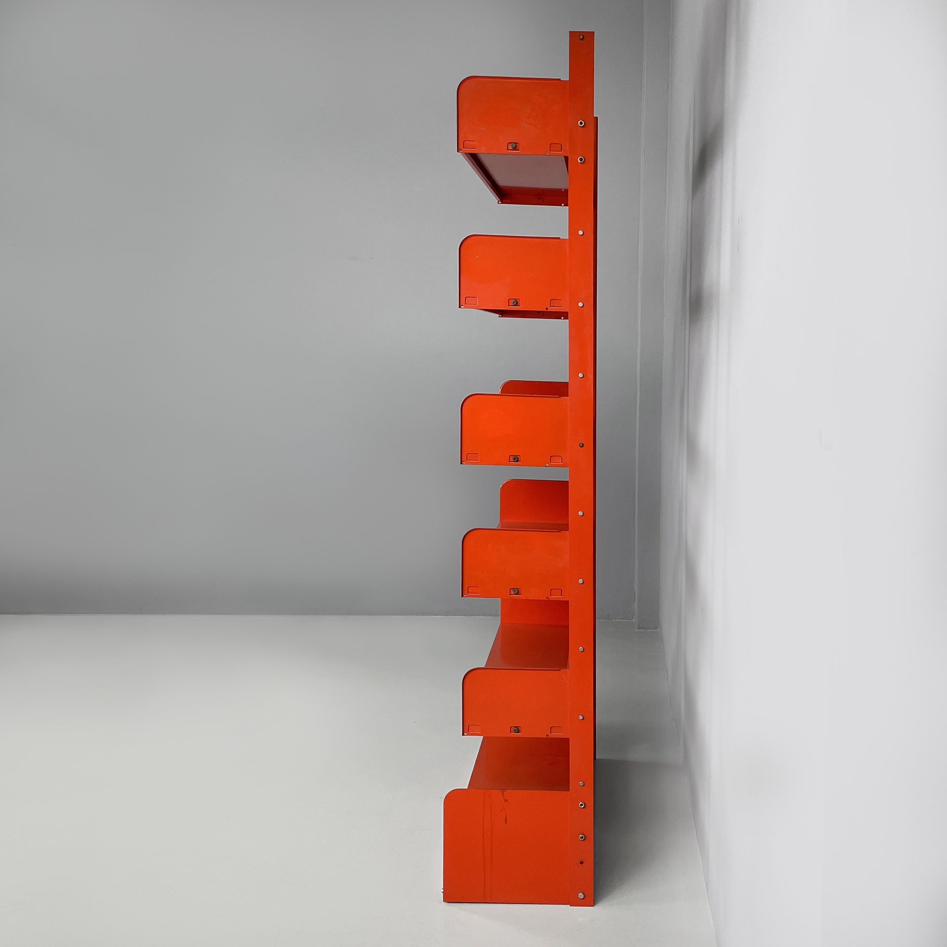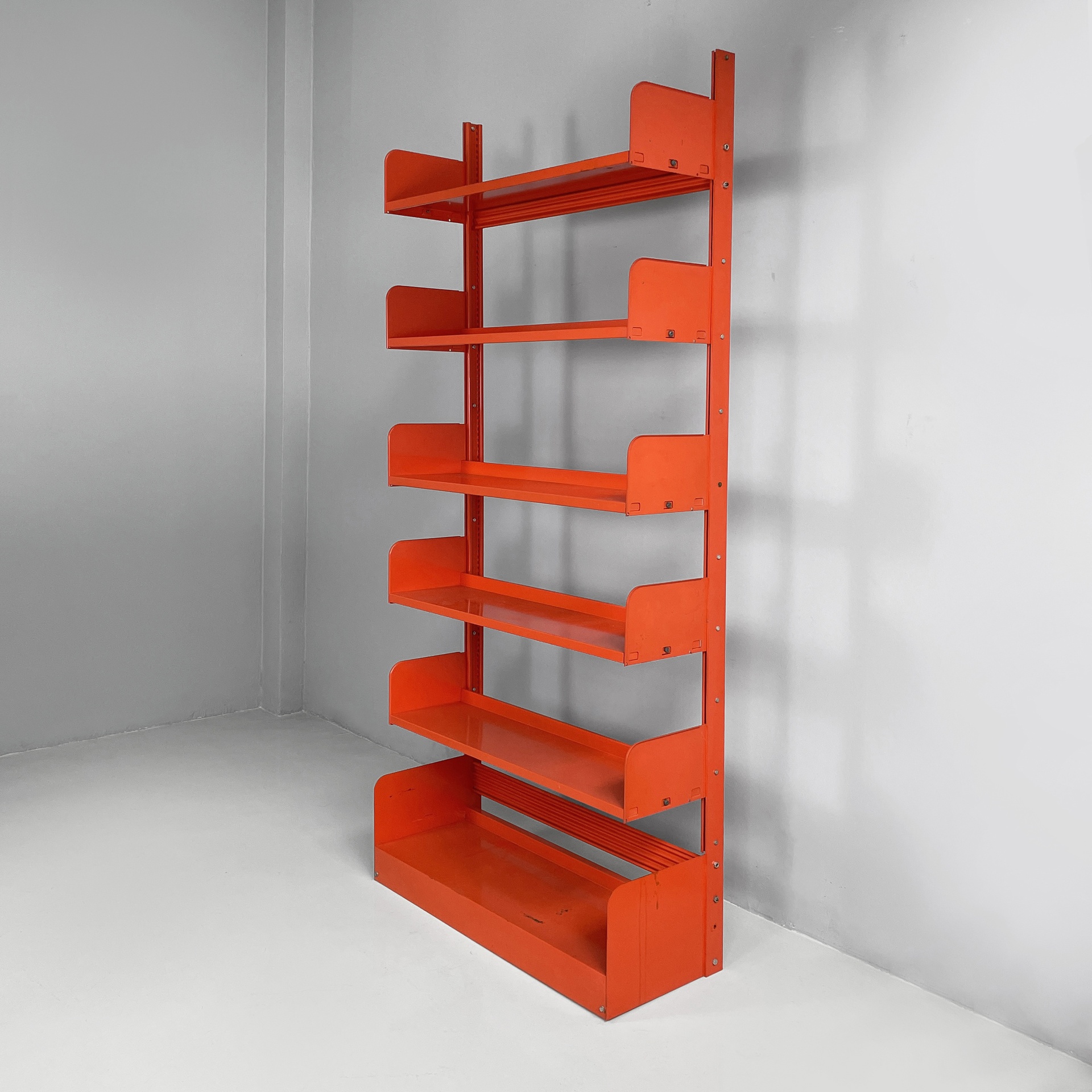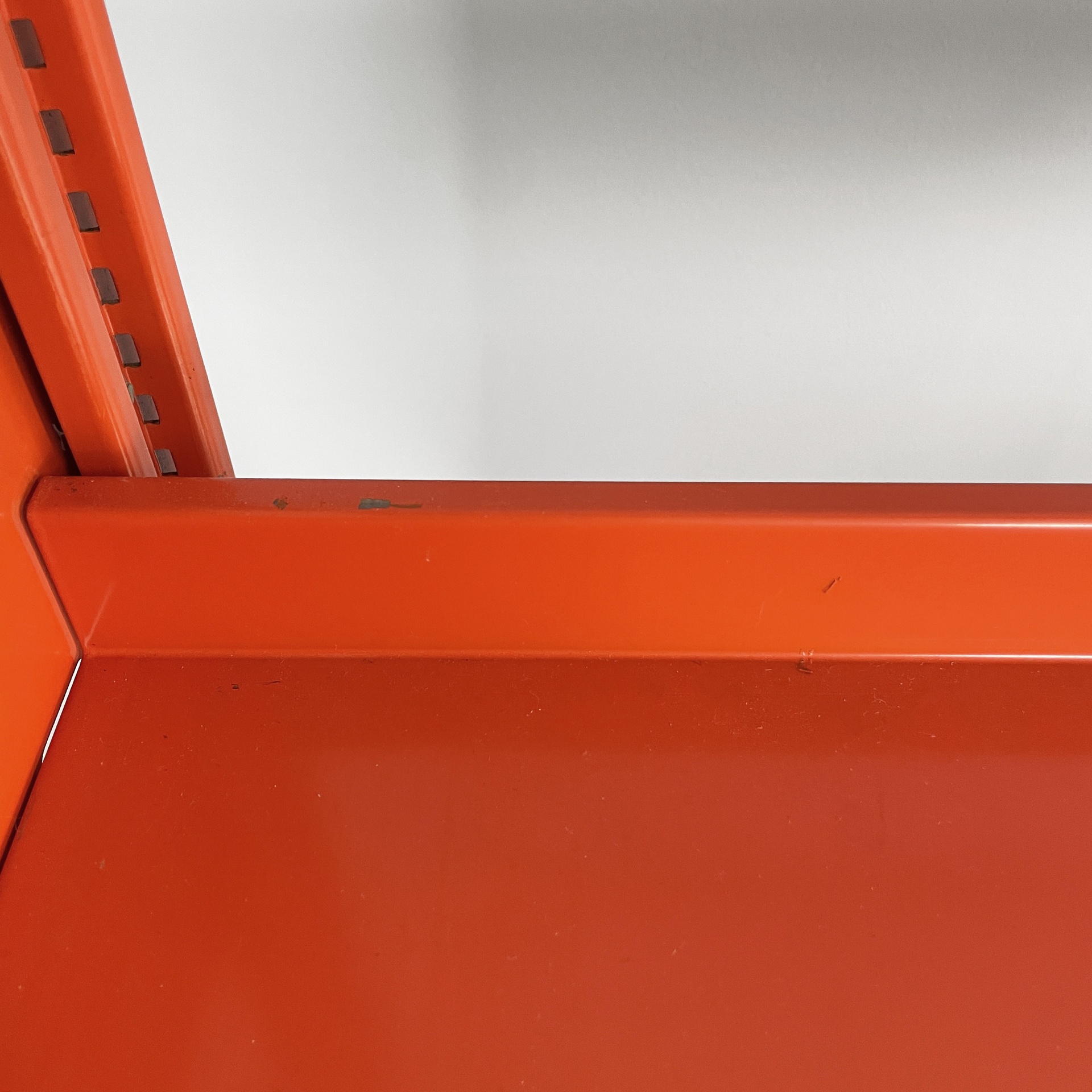 Libreria modello Congresso interamente in metallo verniciato arancione-rosso. Mensole rettangolari e reggi mensola fissati ad incastro manualmente, senza bisogno di altre componenti, alla struttura.