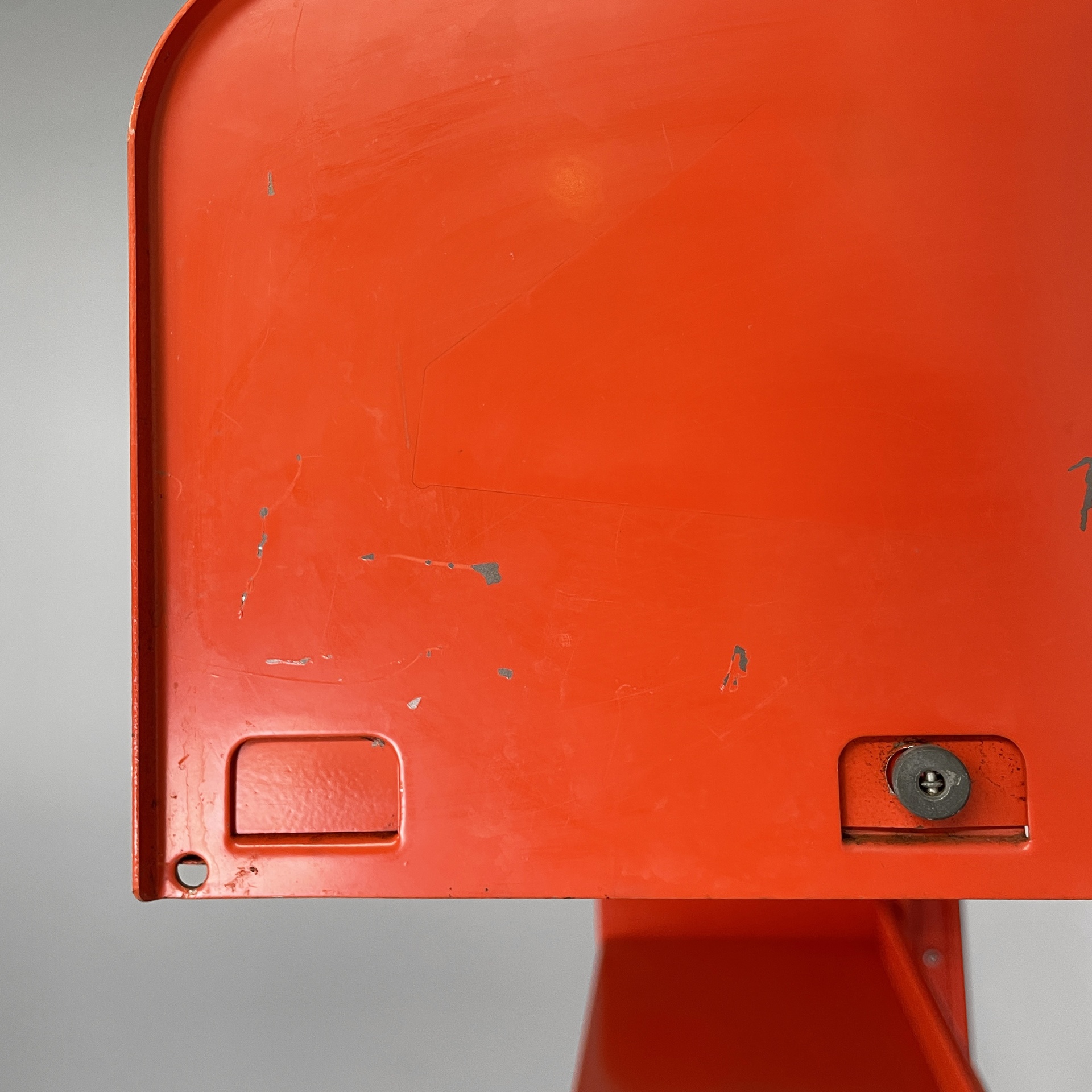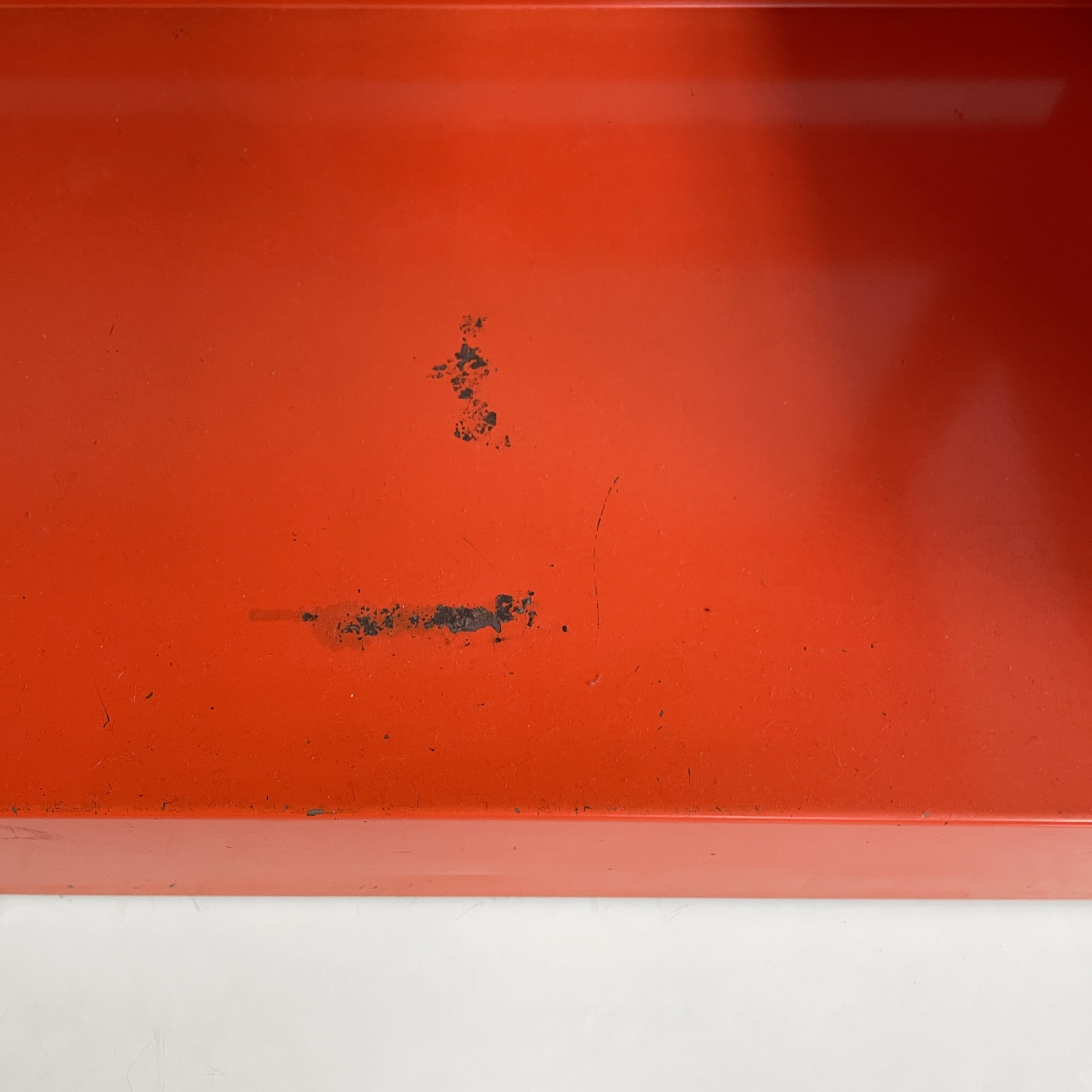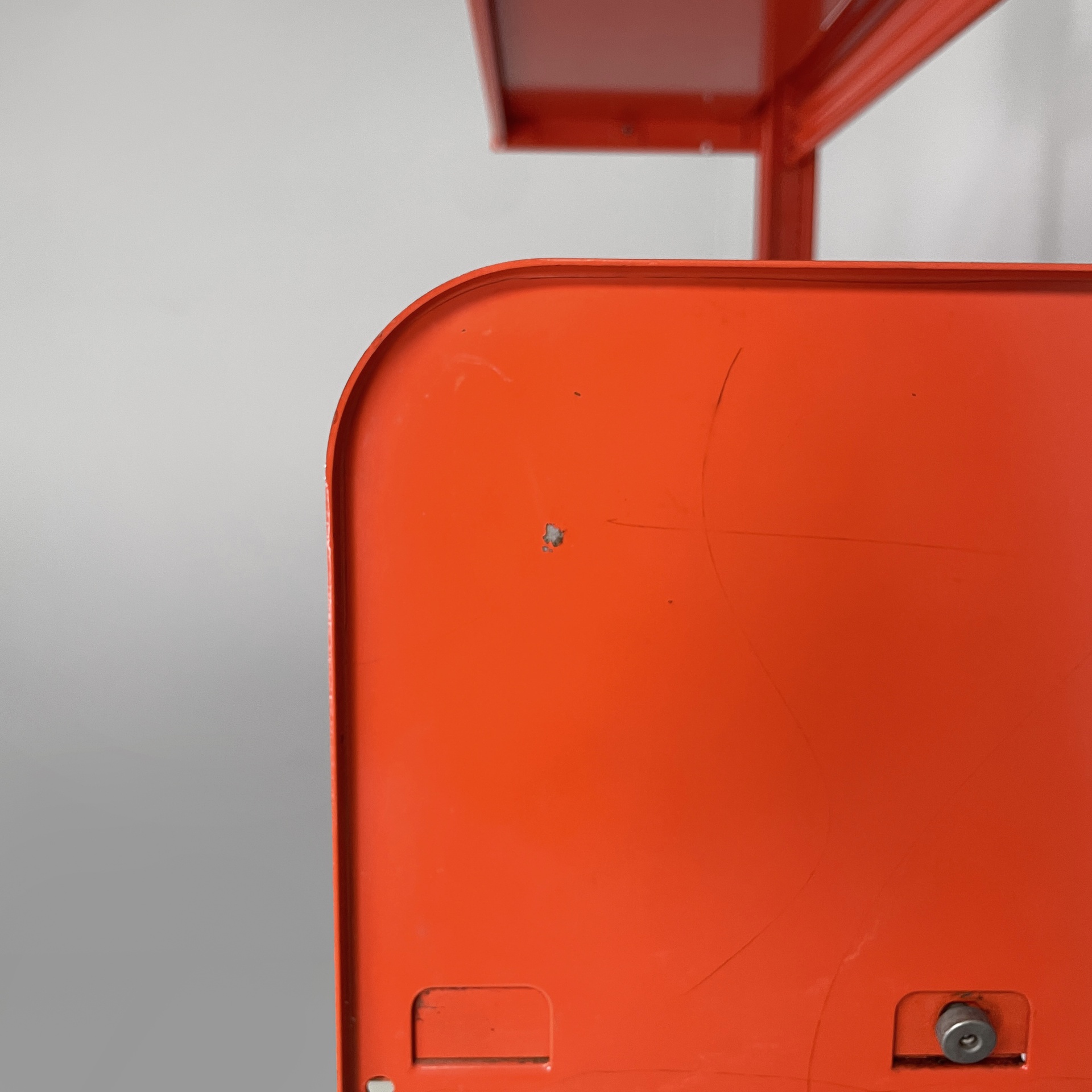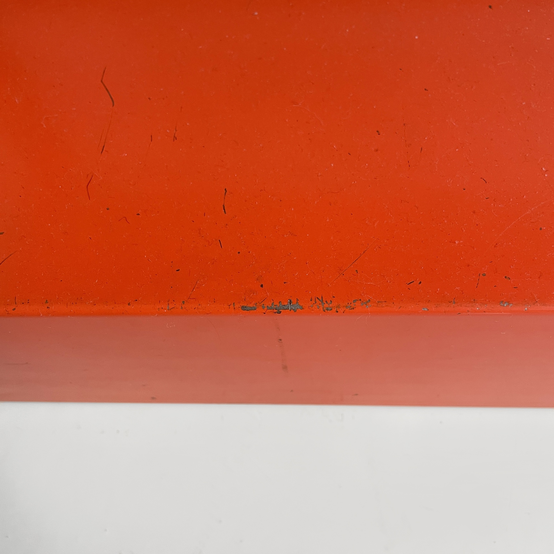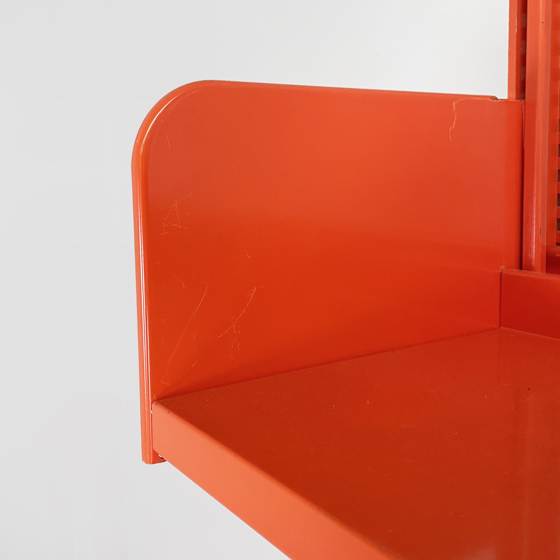 Libreria modello Congresso interamente in metallo verniciato arancione-rosso. Mensole rettangolari e reggi mensola fissati ad incastro manualmente, senza bisogno di altre componenti, alla struttura.