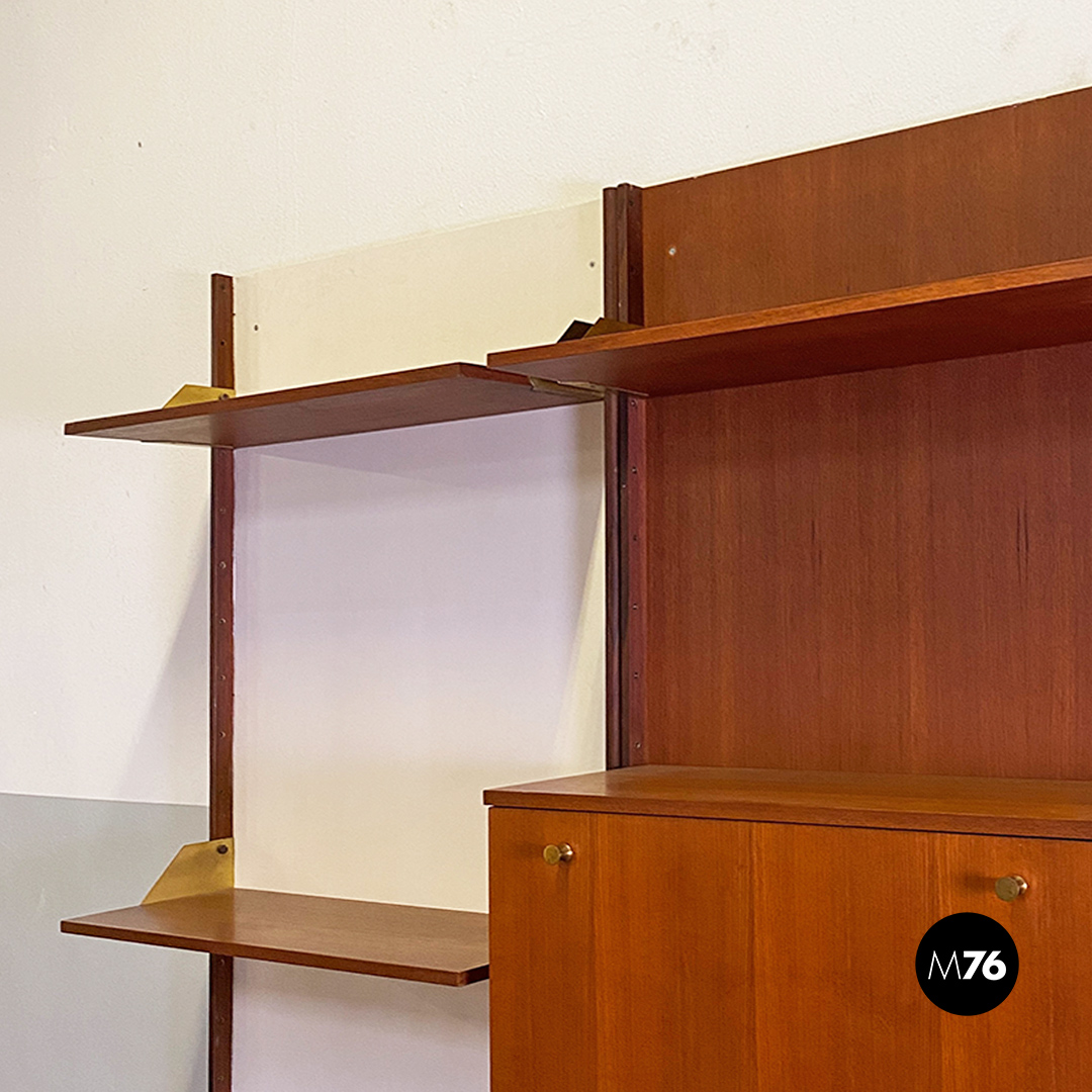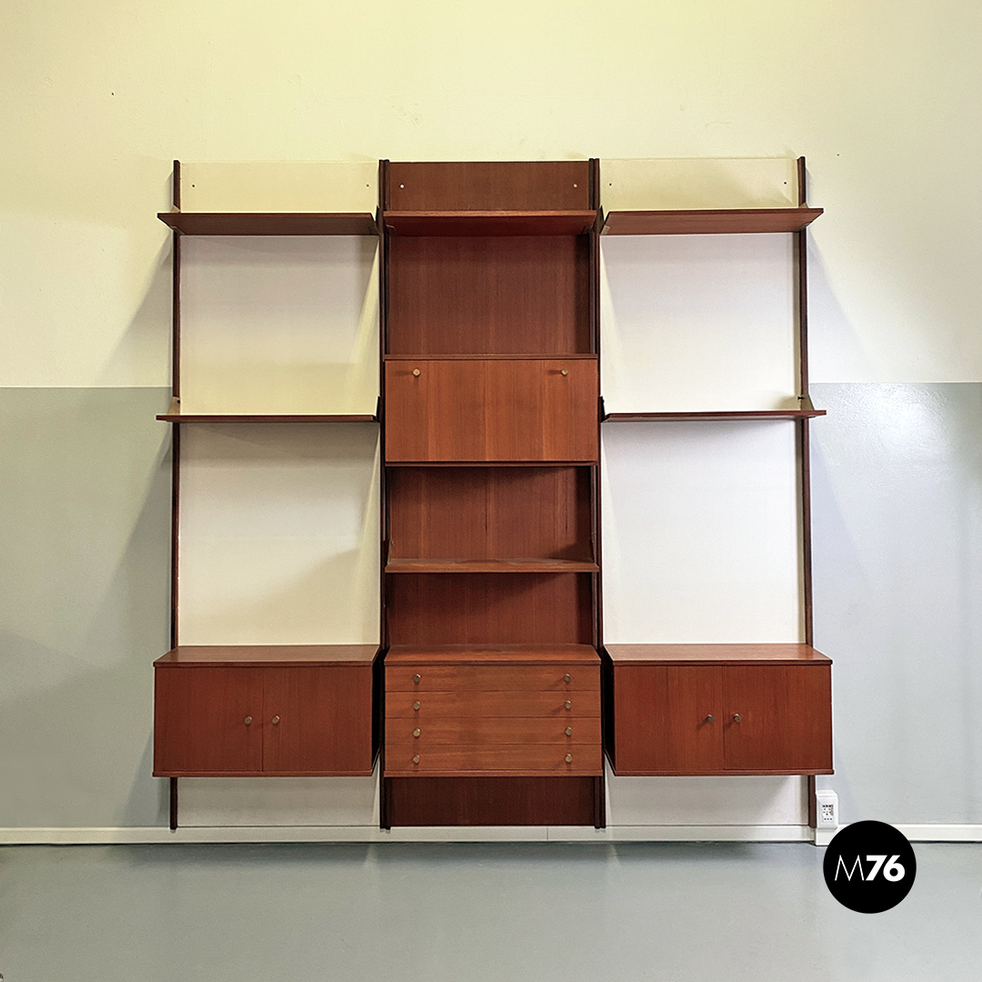 Libreria da parete componibile completamente in teak. Composta da tre pannelli a muro di cui due verniciati in bianco con montanti che fanno da profilo ai pannelli mensole e cabinet posizionabili liberamente e fissati alle pareti tramite delle bussole in ottone presenti all’interno dei montanti. Reggimensola e maniglie sempre in ottone in patina. Provvista di due cabinet con ante a battente uno con cassetti ed uno con anta a ribalta.