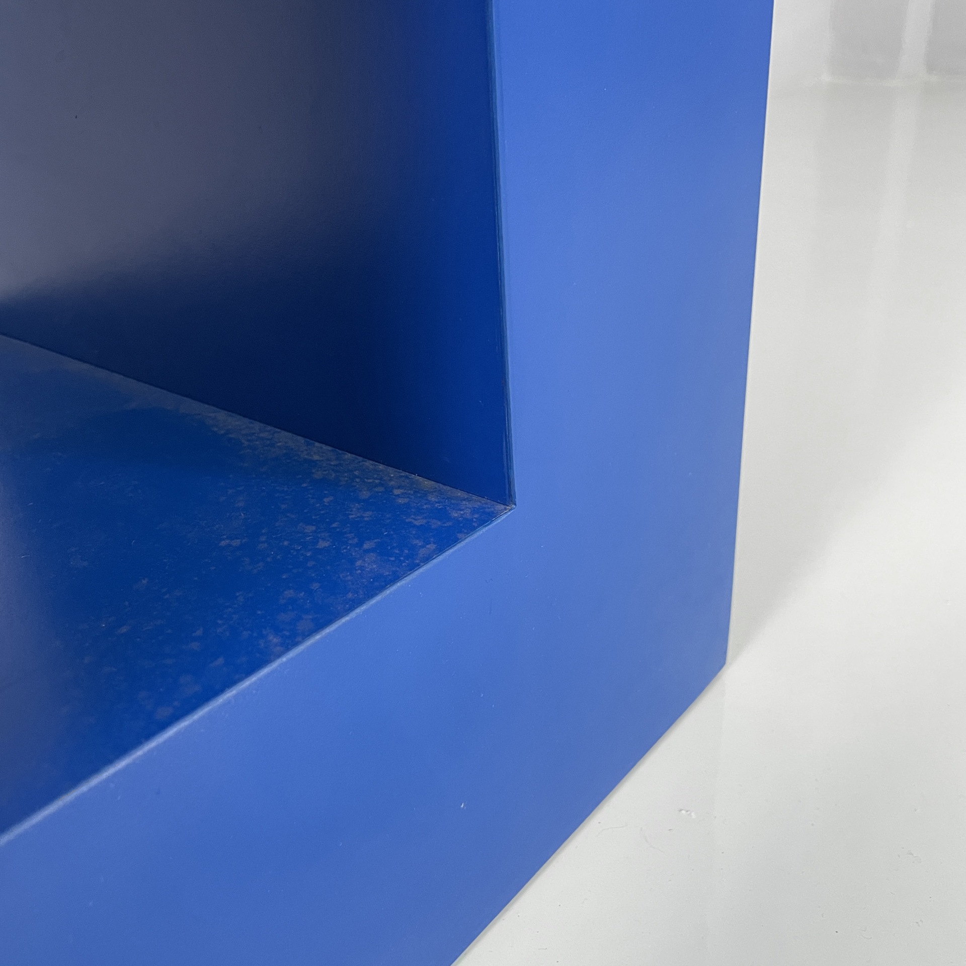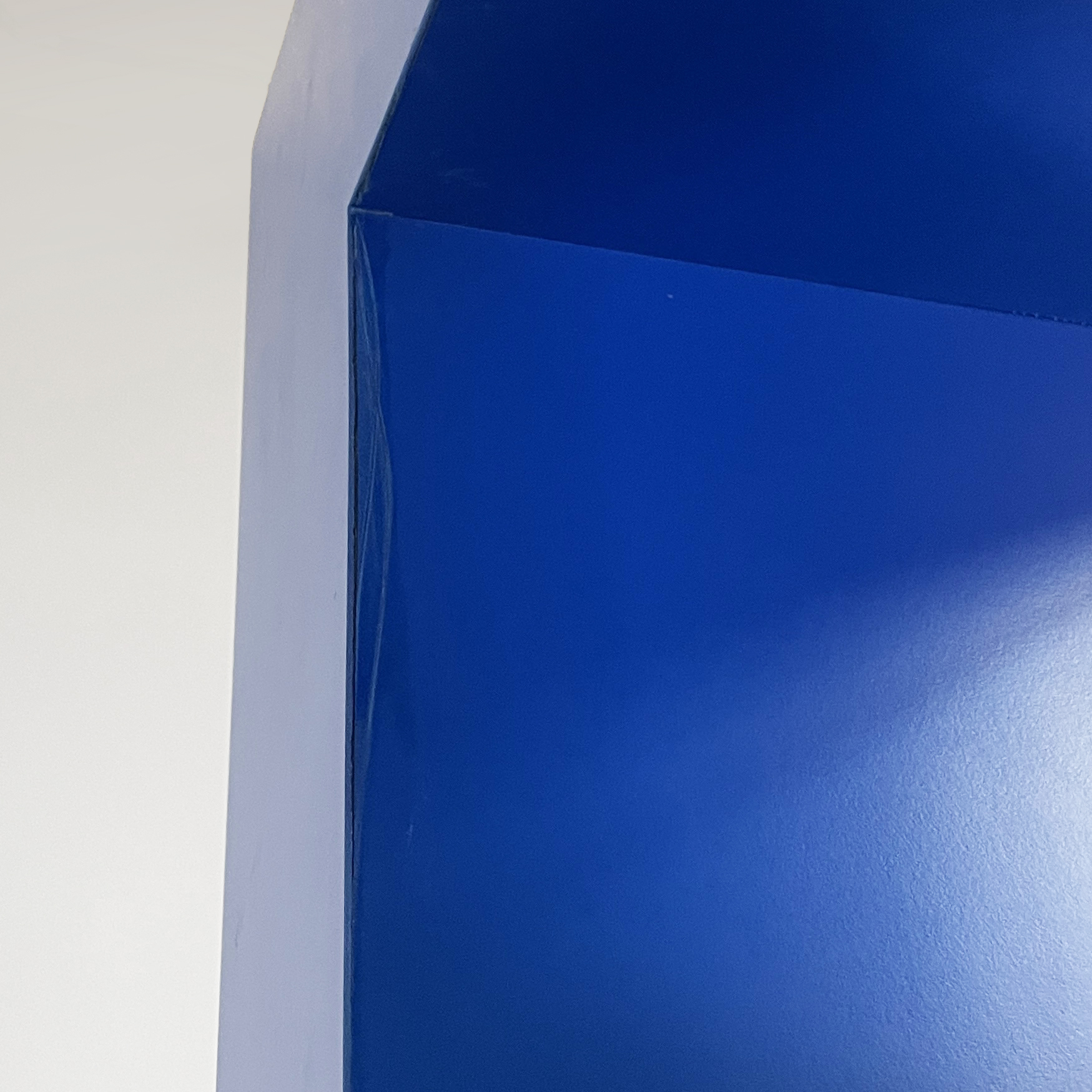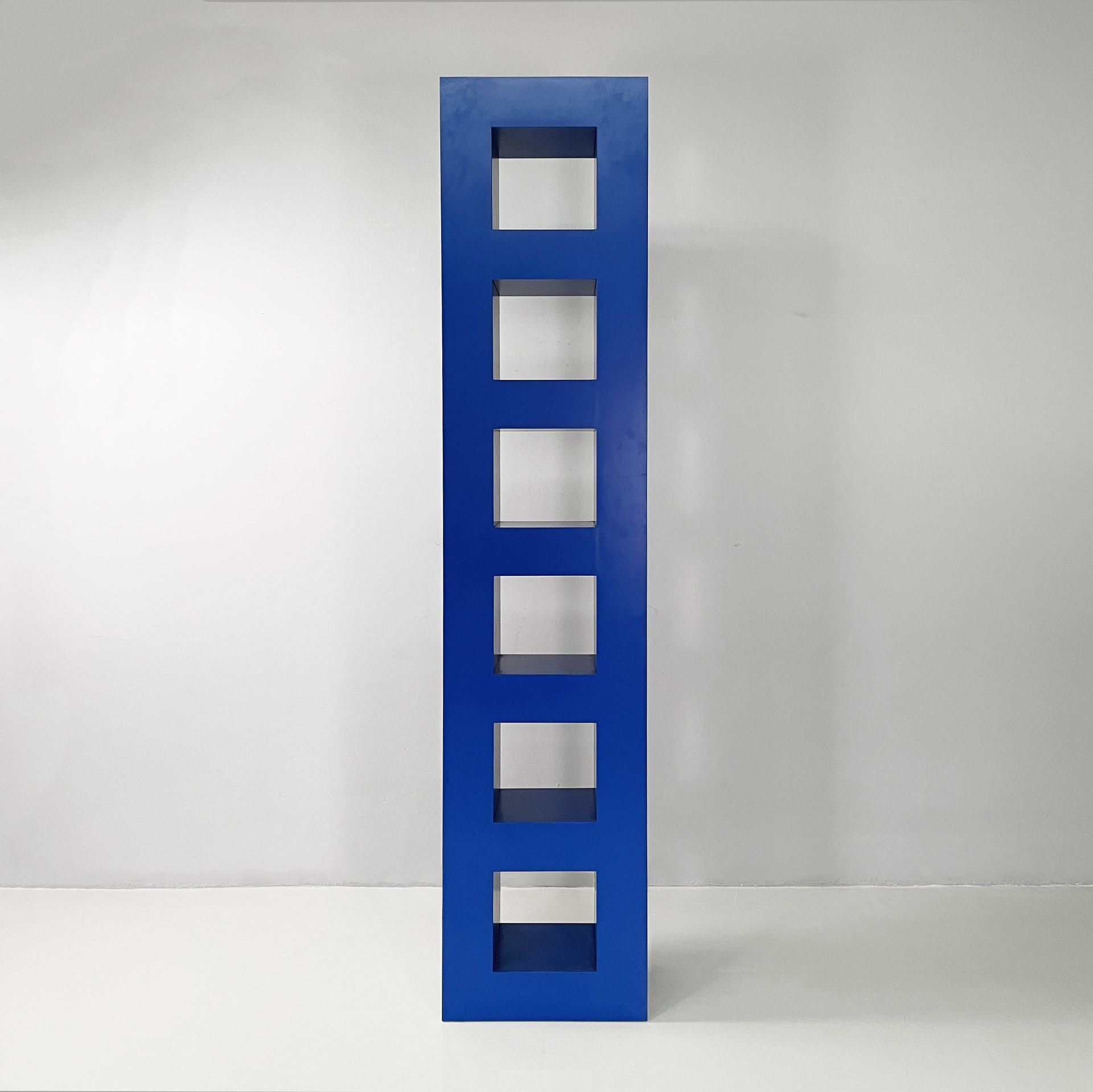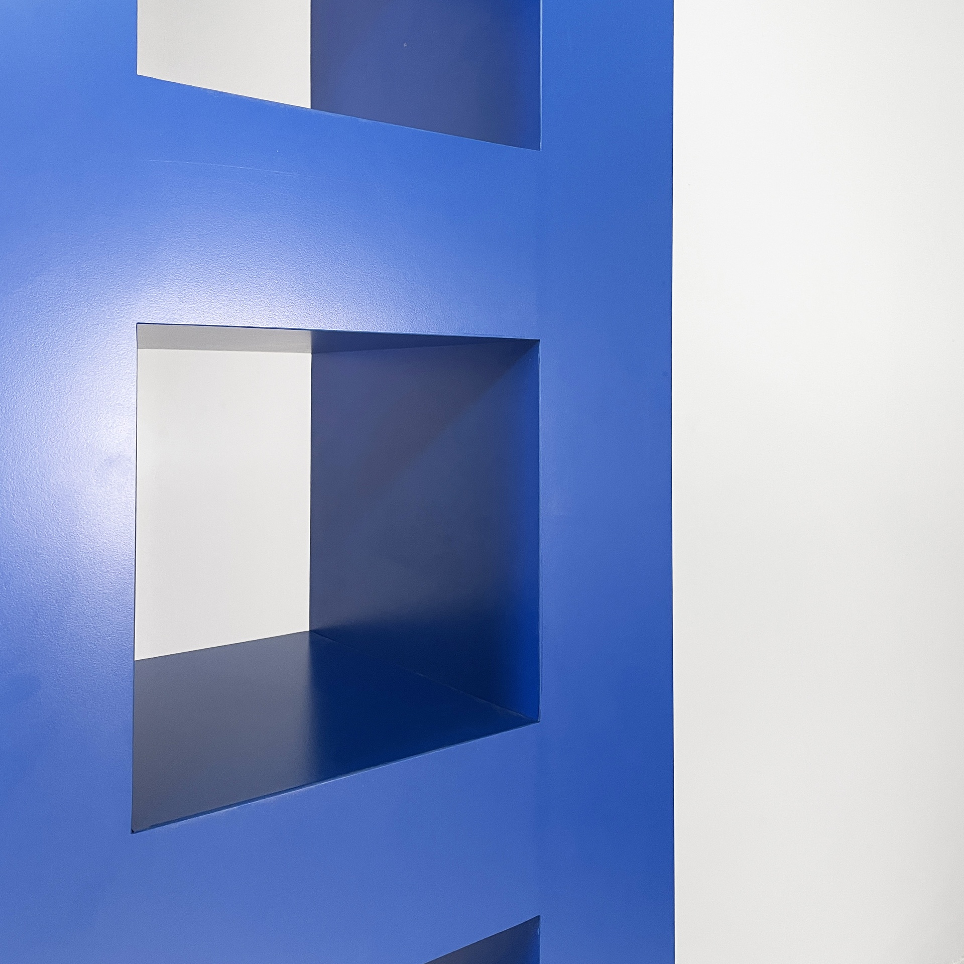 Libreria a base rettangolare interamente in legno rivestito in laminato blu. È composta da una singola colonna con sei vani squadrati.