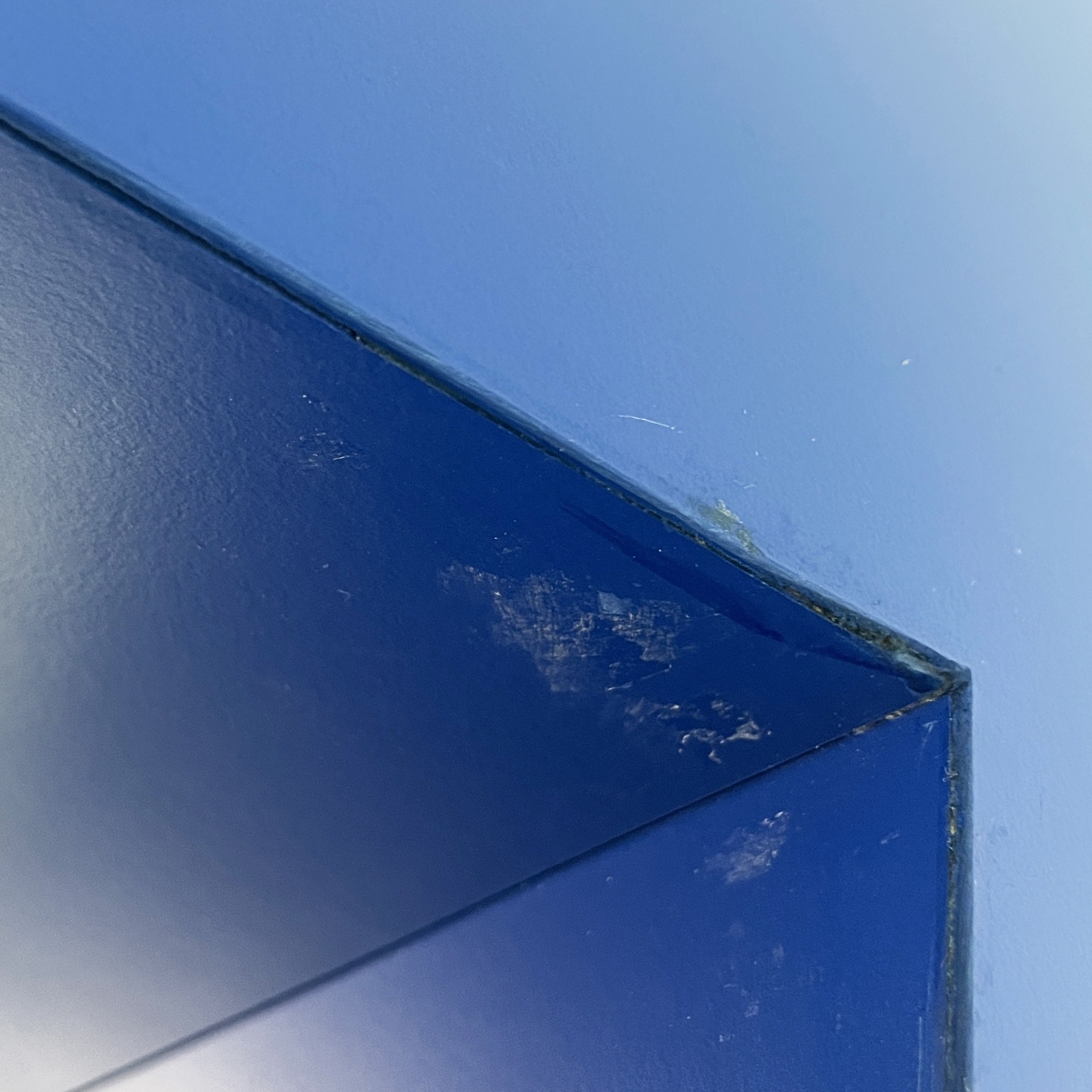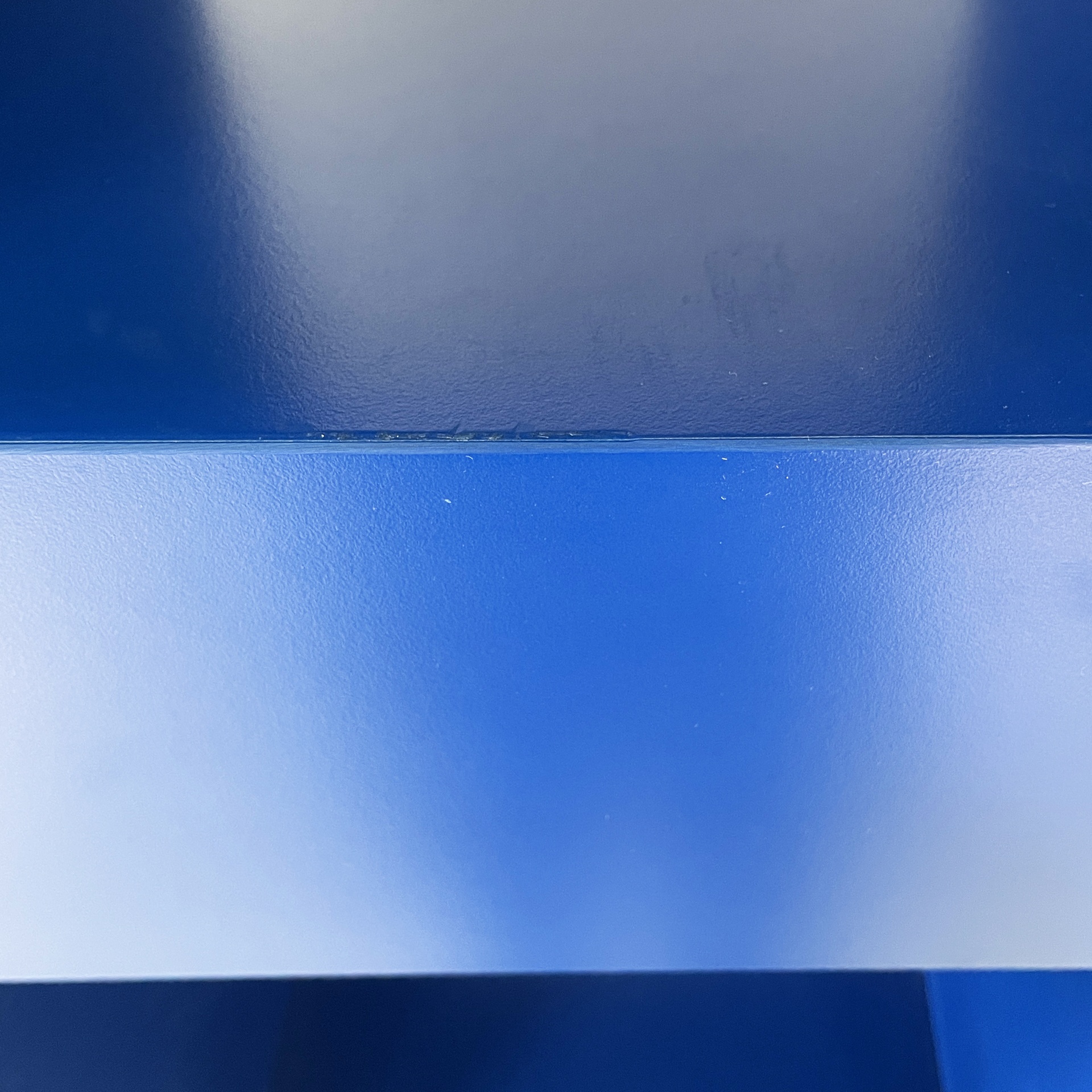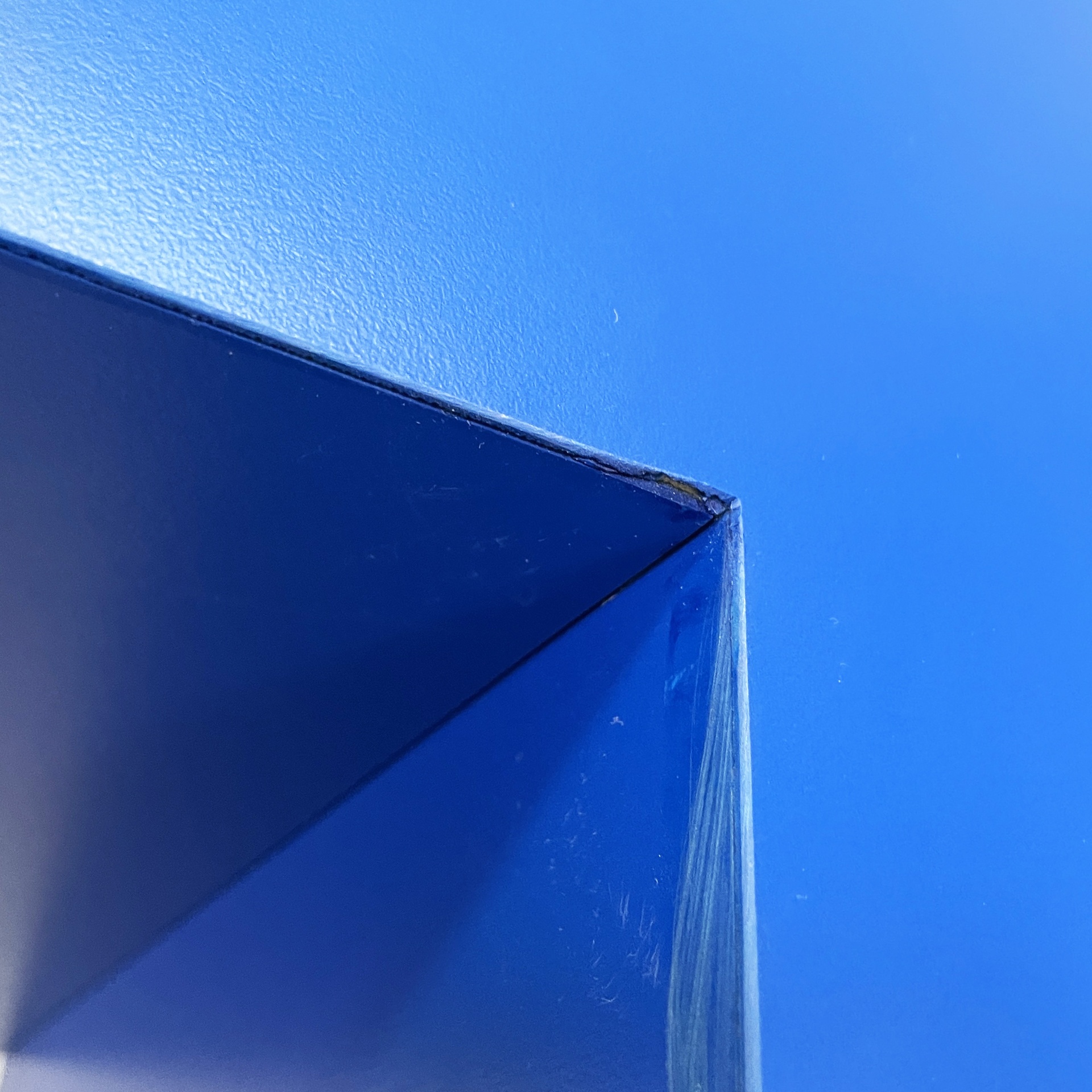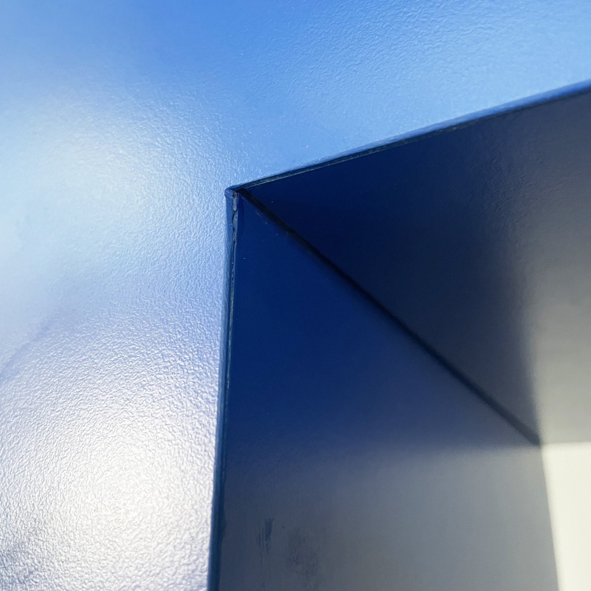 Libreria a base rettangolare interamente in legno rivestito in laminato blu. È composta da una singola colonna con sei vani squadrati.