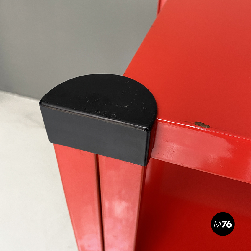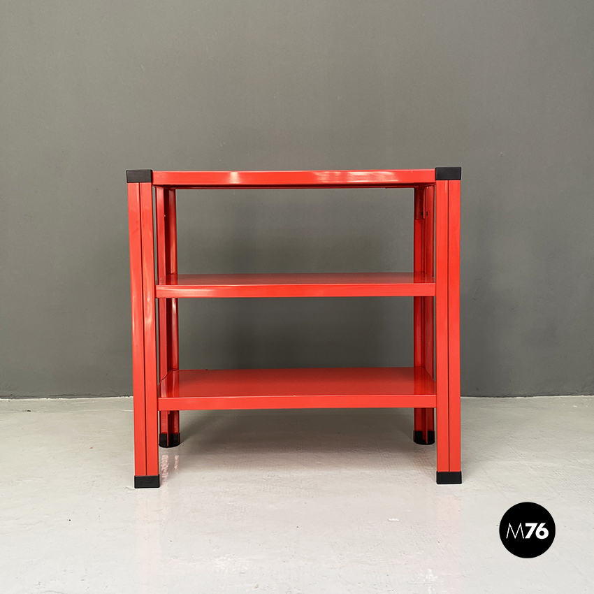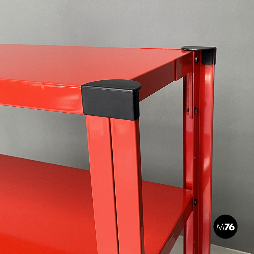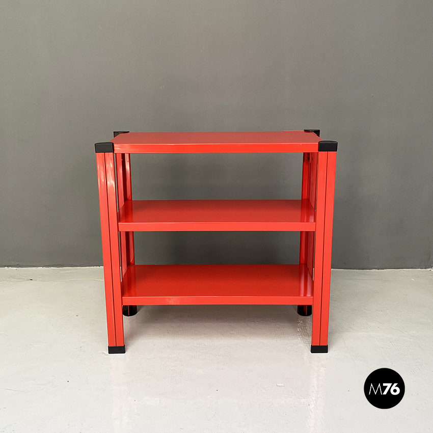 Libreria a tre ripiani in metallo verniciata in rosso con dettagli in plastica nera.