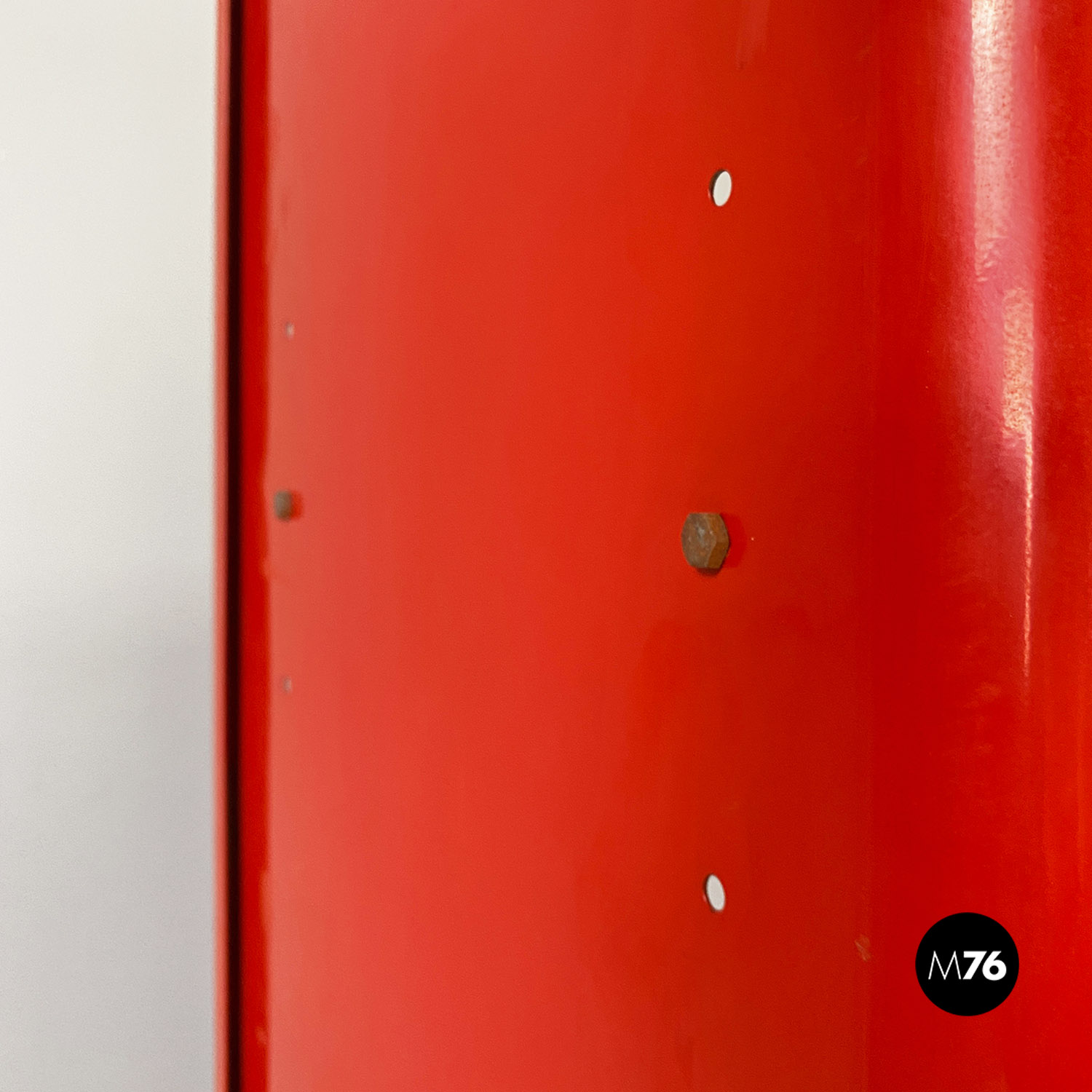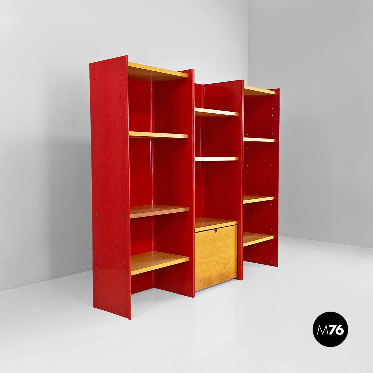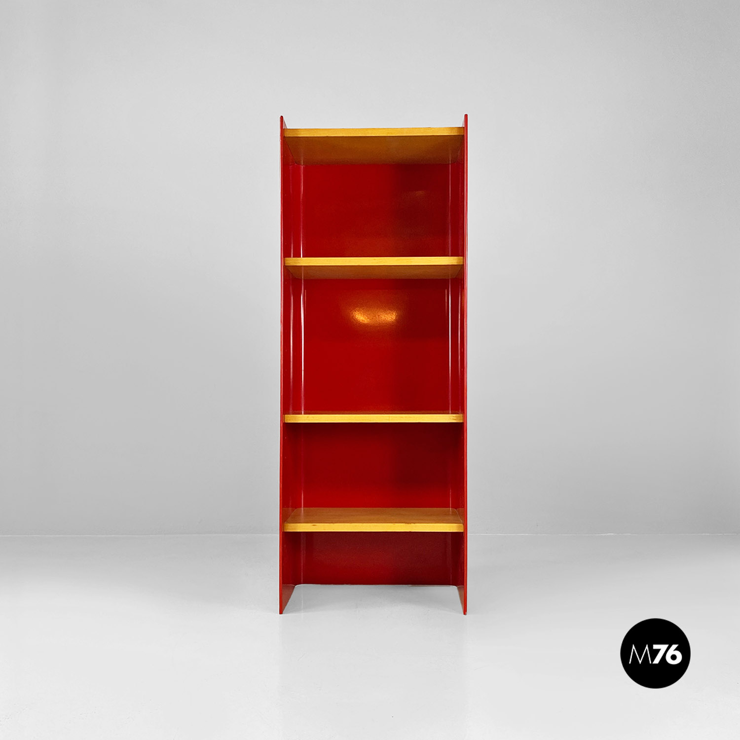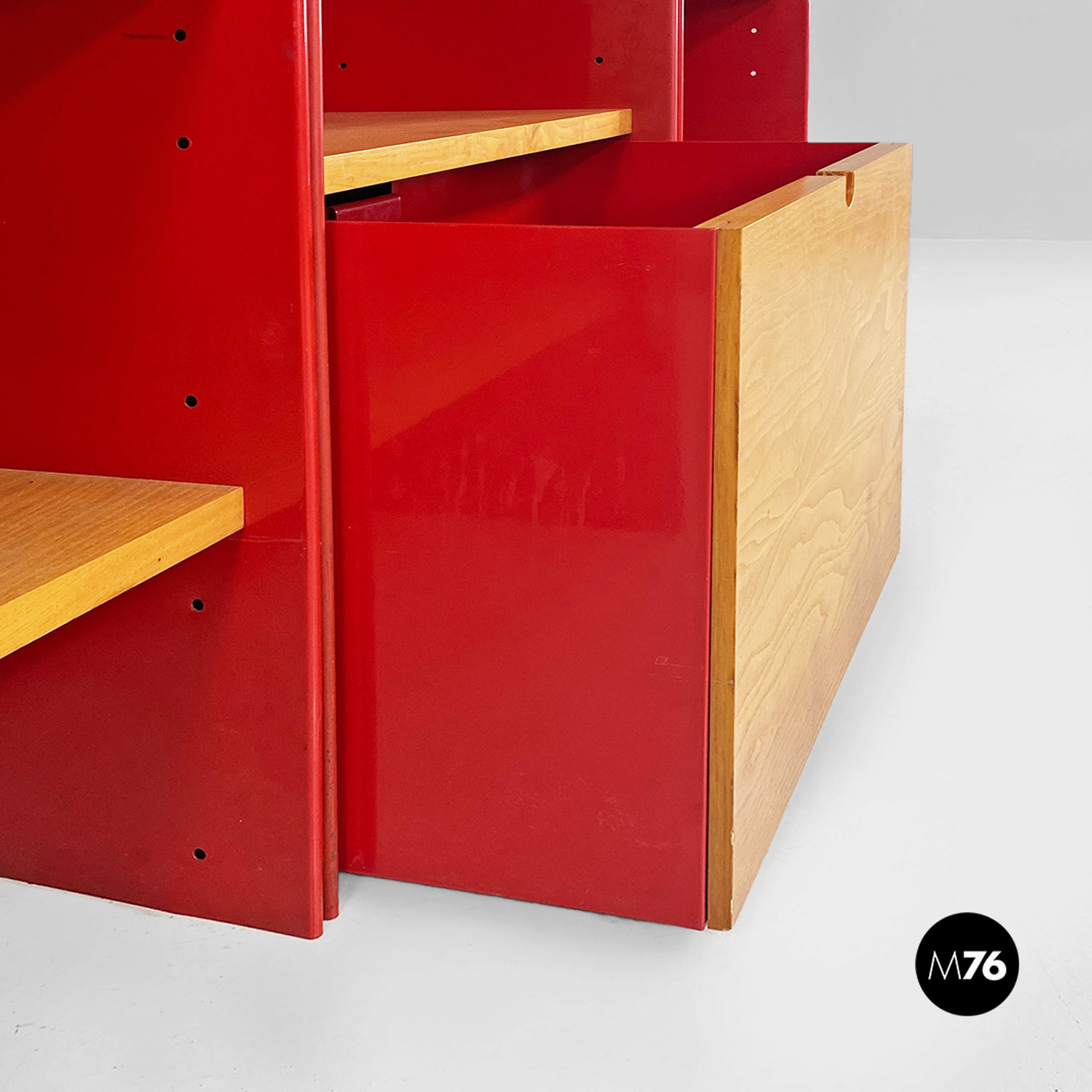 Libreria autoportante con struttura in metallo curvato e smaltato rosso lucido con mensole in massello e cassetto centrale estraibile su ruote