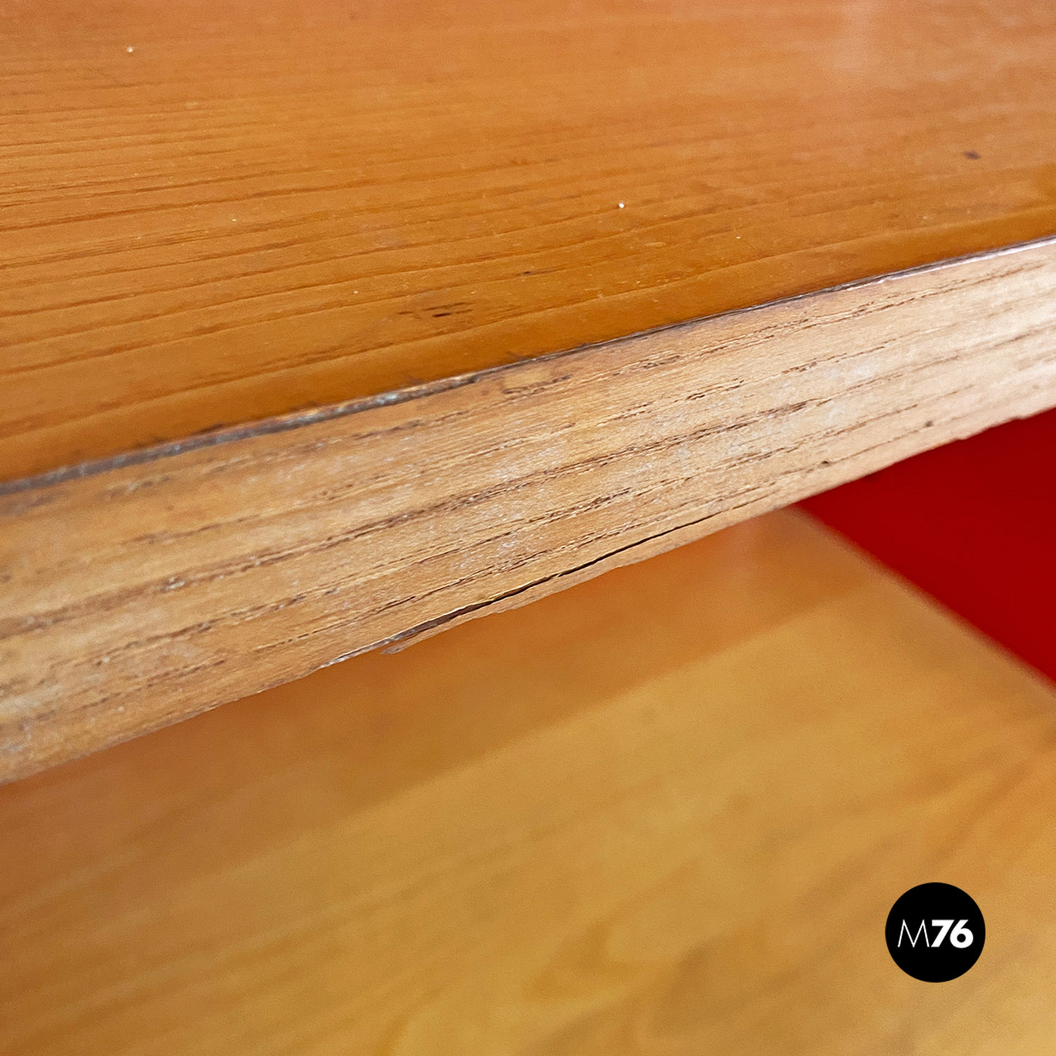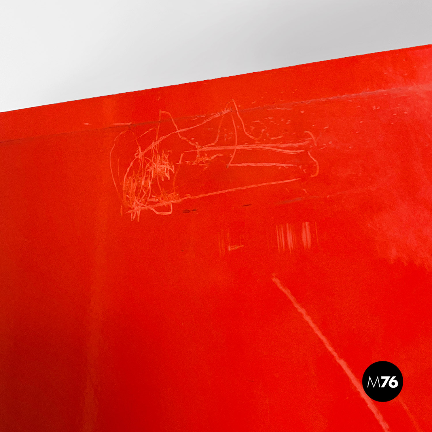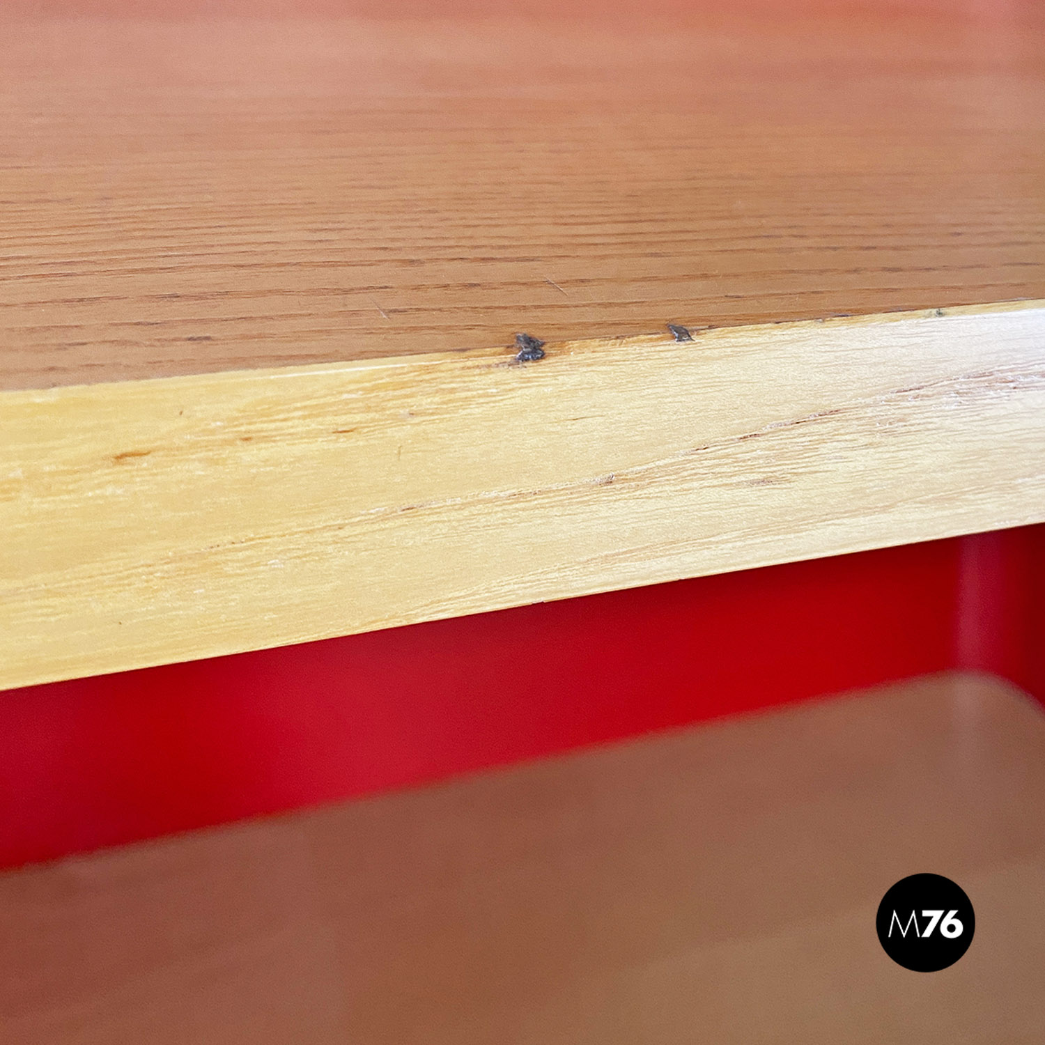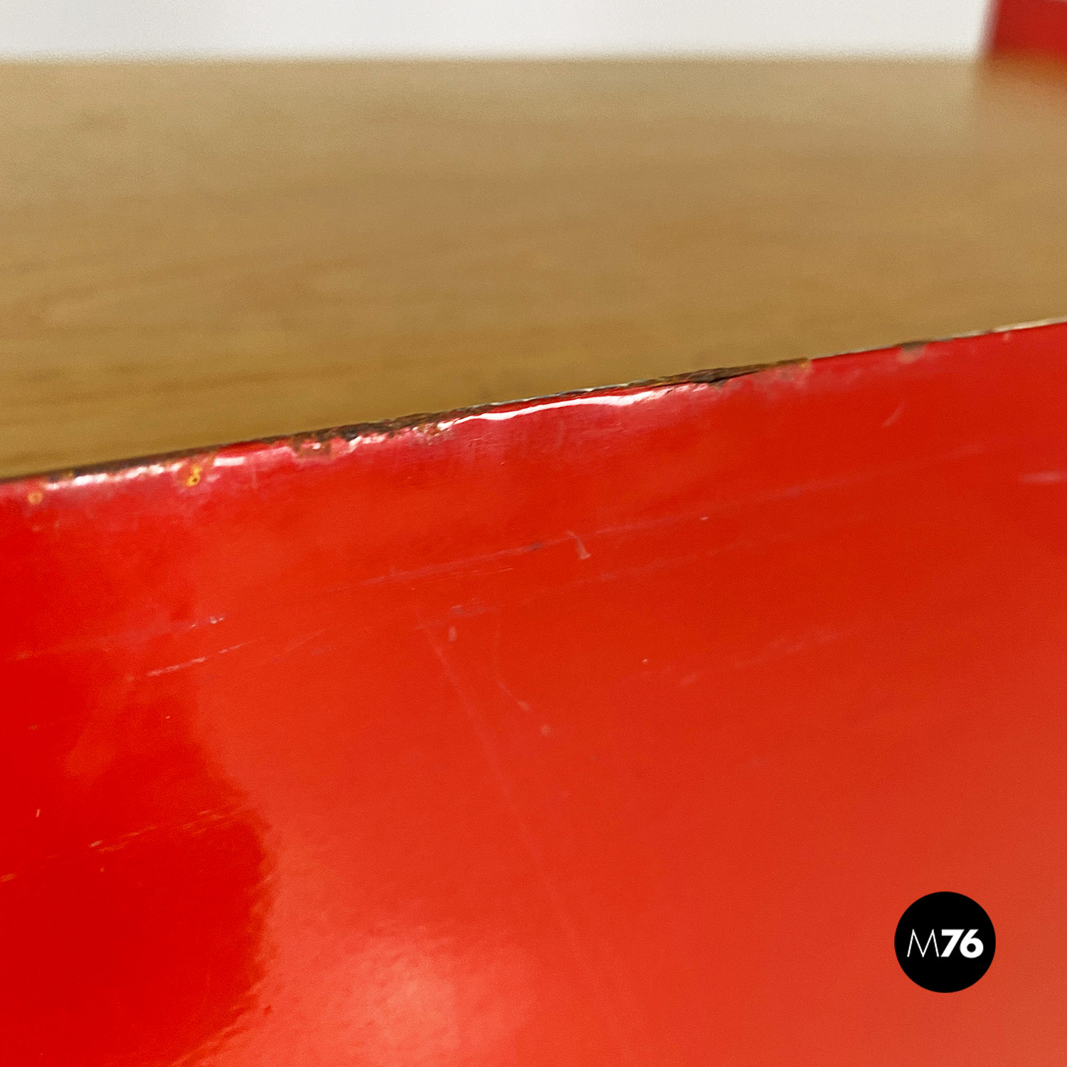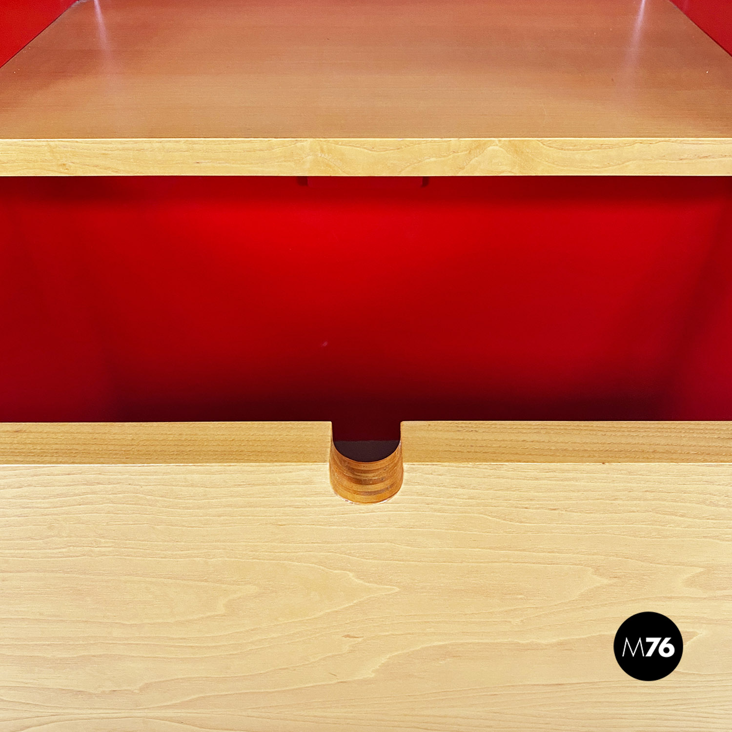 Libreria autoportante con struttura in metallo curvato e smaltato rosso lucido con mensole in massello e cassetto centrale estraibile su ruote