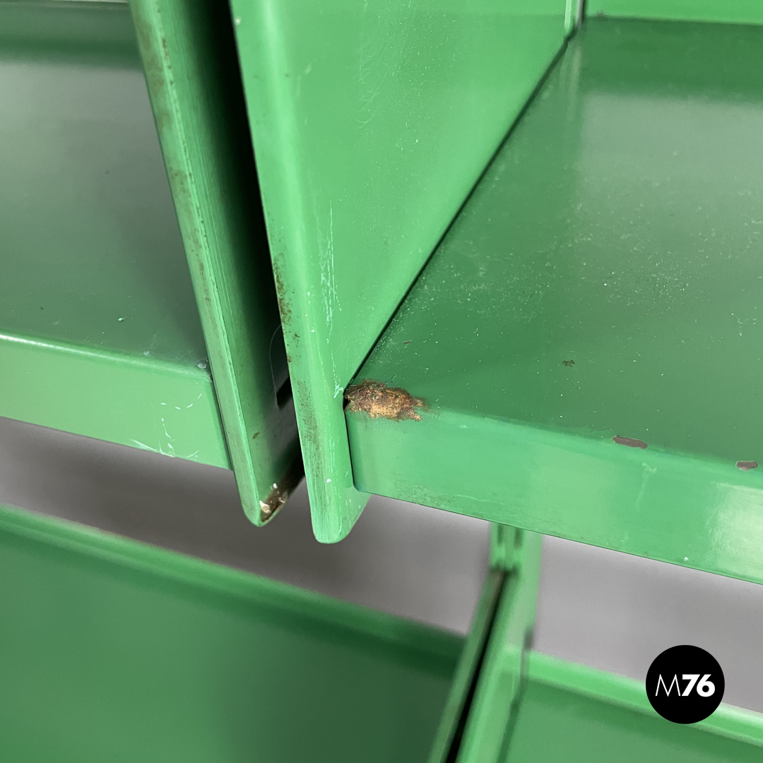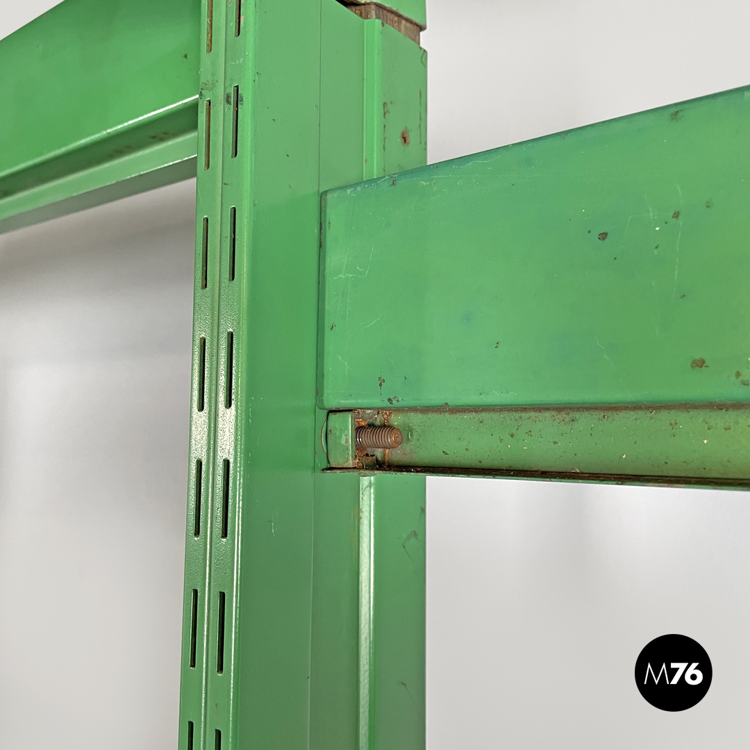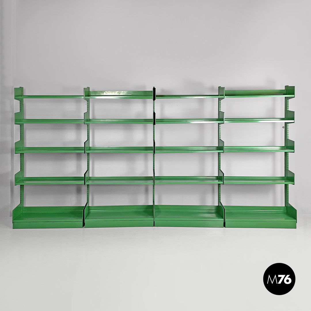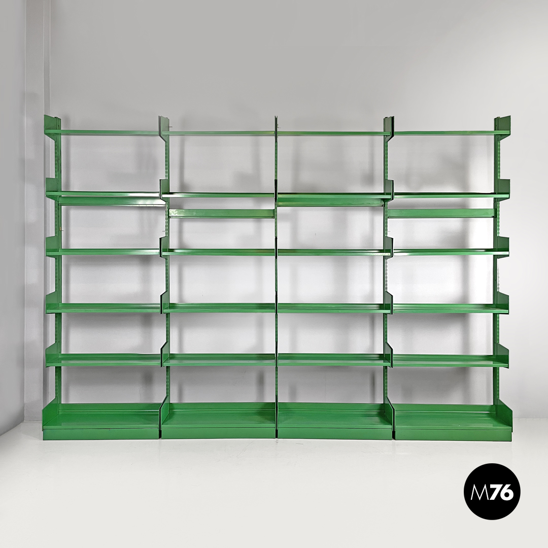 Libreria interamente in metallo verde a quattro campate. I reggi mensola e le mensole possono essere disposti a piacimento incastrandoli nei binari dei cinque montanti. La libreria ha la possibilità di essere alzata tramite cinque prolunghe in questo caso è consigliabile fissarla alla parete mediante i tasselli presenti. Le mensole con la misura standard della struttura sono sedici mentre con le allunghe venti.