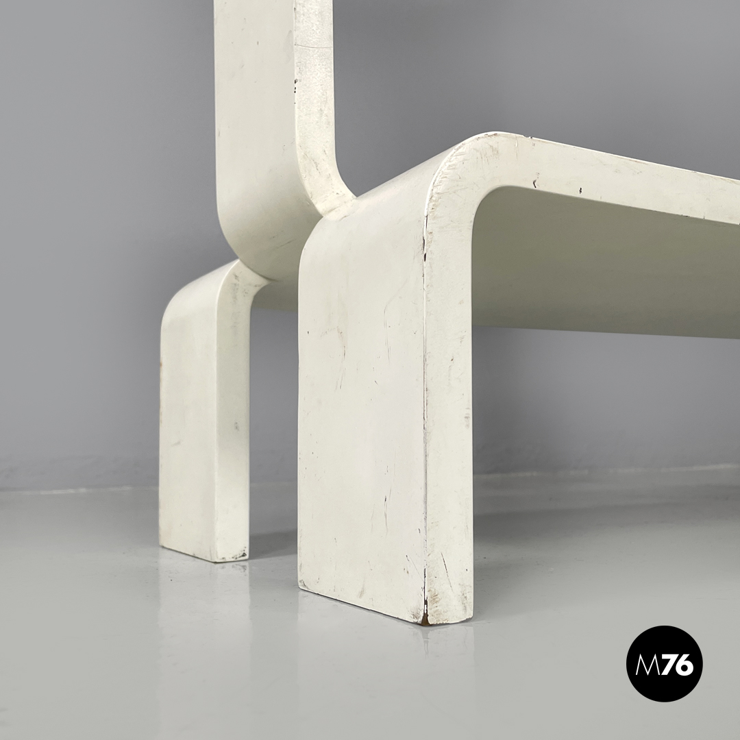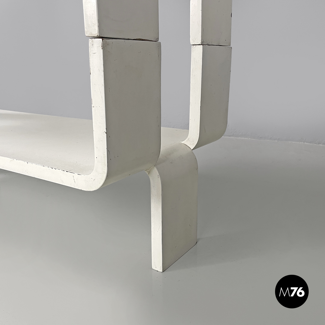 Libreria modulare in legno laccato bianco e nero con finitura opaca. I moduli che compongono sia la struttura che le mensole hanno forme curve e tondeggianti e si incastrano i lati. L’appoggio a terra è dato da tre piedini rettangolari allungati due da una parte e uno dall’altra.