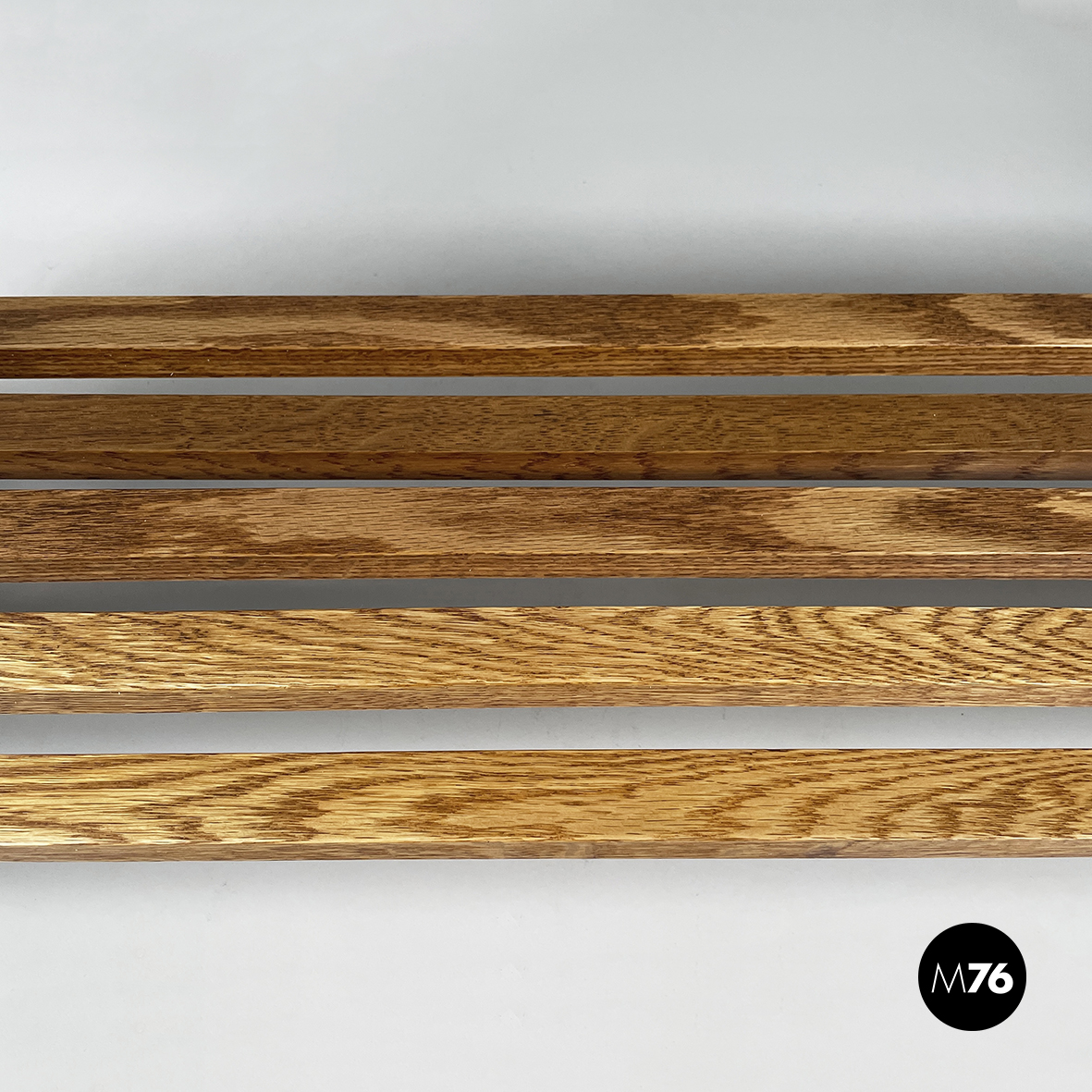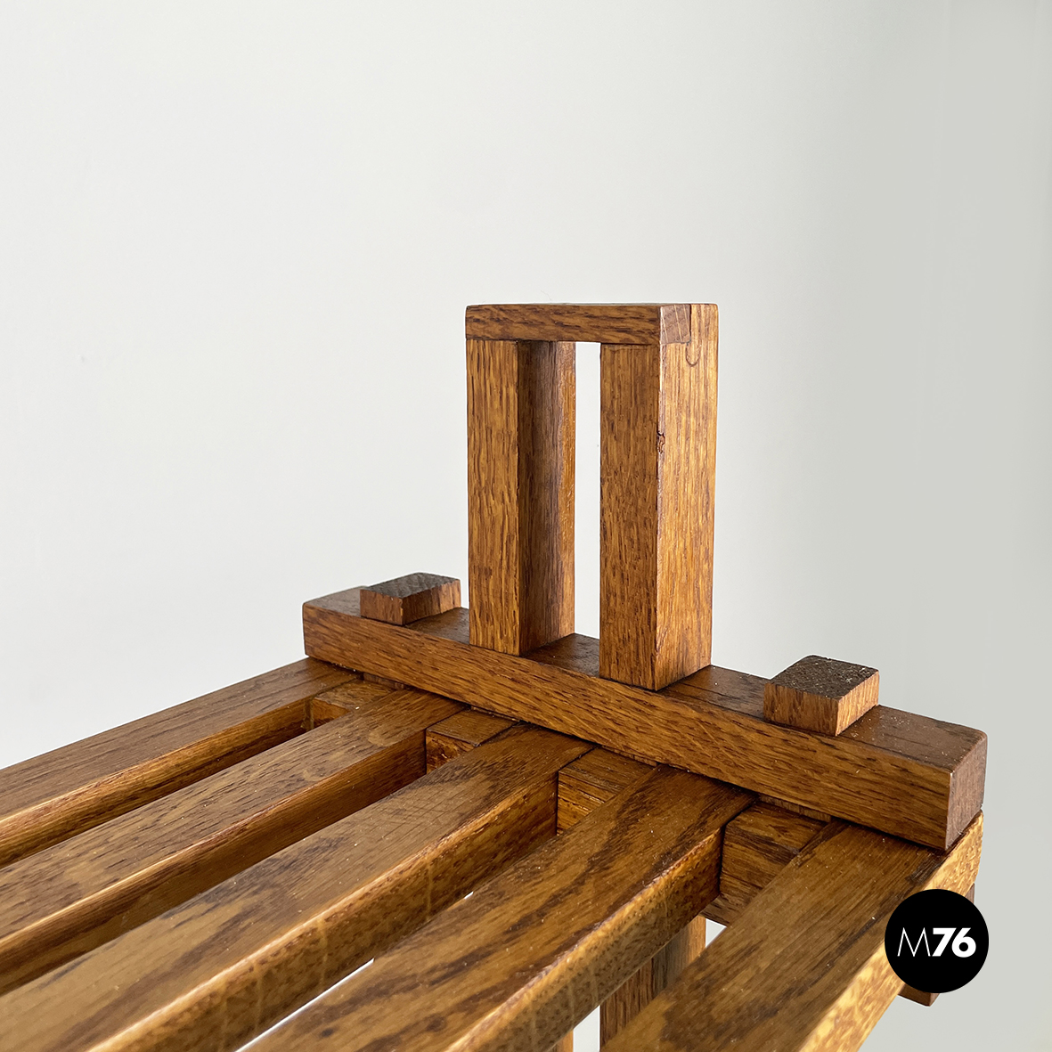 Libreria da terra mod. Panchina interamente in legno. I quattro ripiani sono composti da listelli orizzontali a sezione quadrata in legno i quali si incastrano con i listelli verticali della struttura. Sulla mensola superiore sono presenti due listelli i quali fungono da fermalibri. Piedini a sezione quadrata.