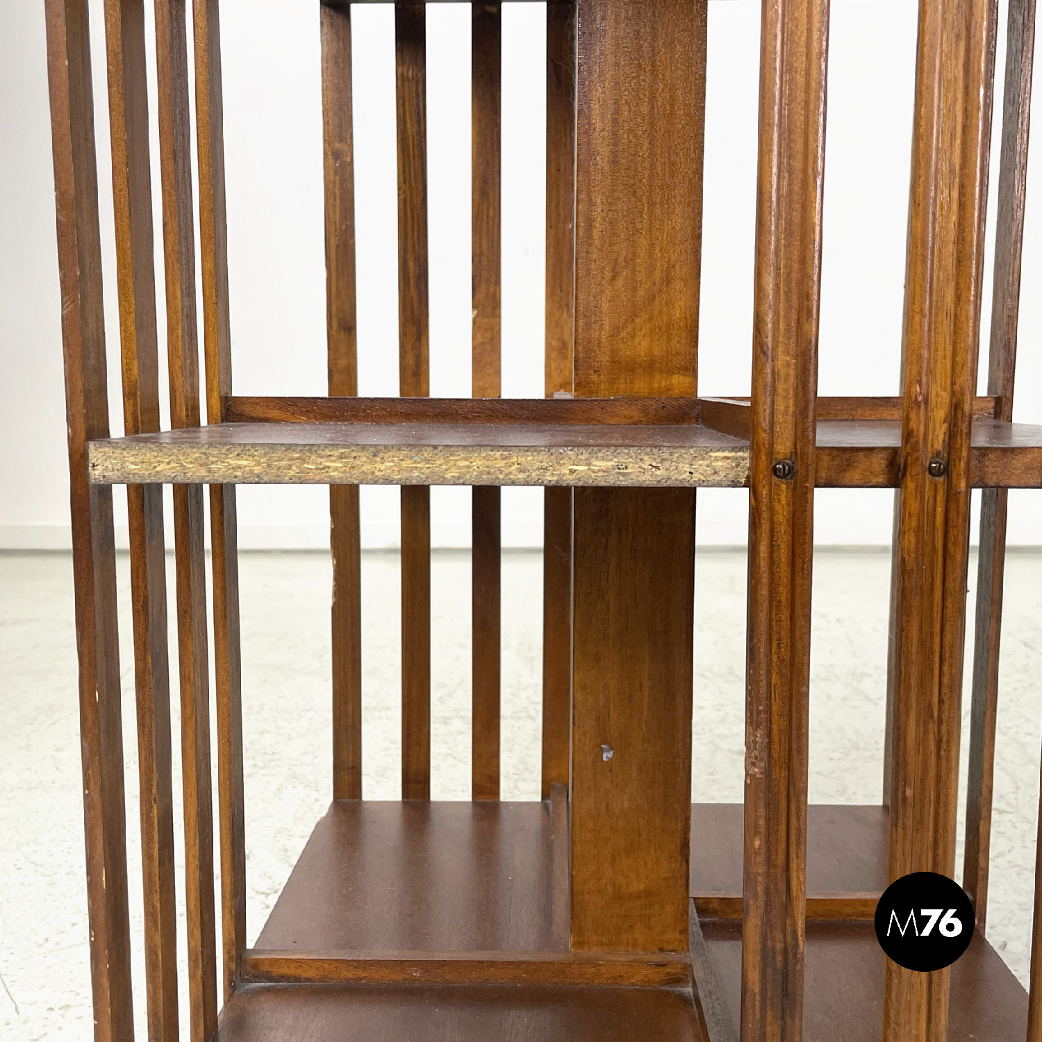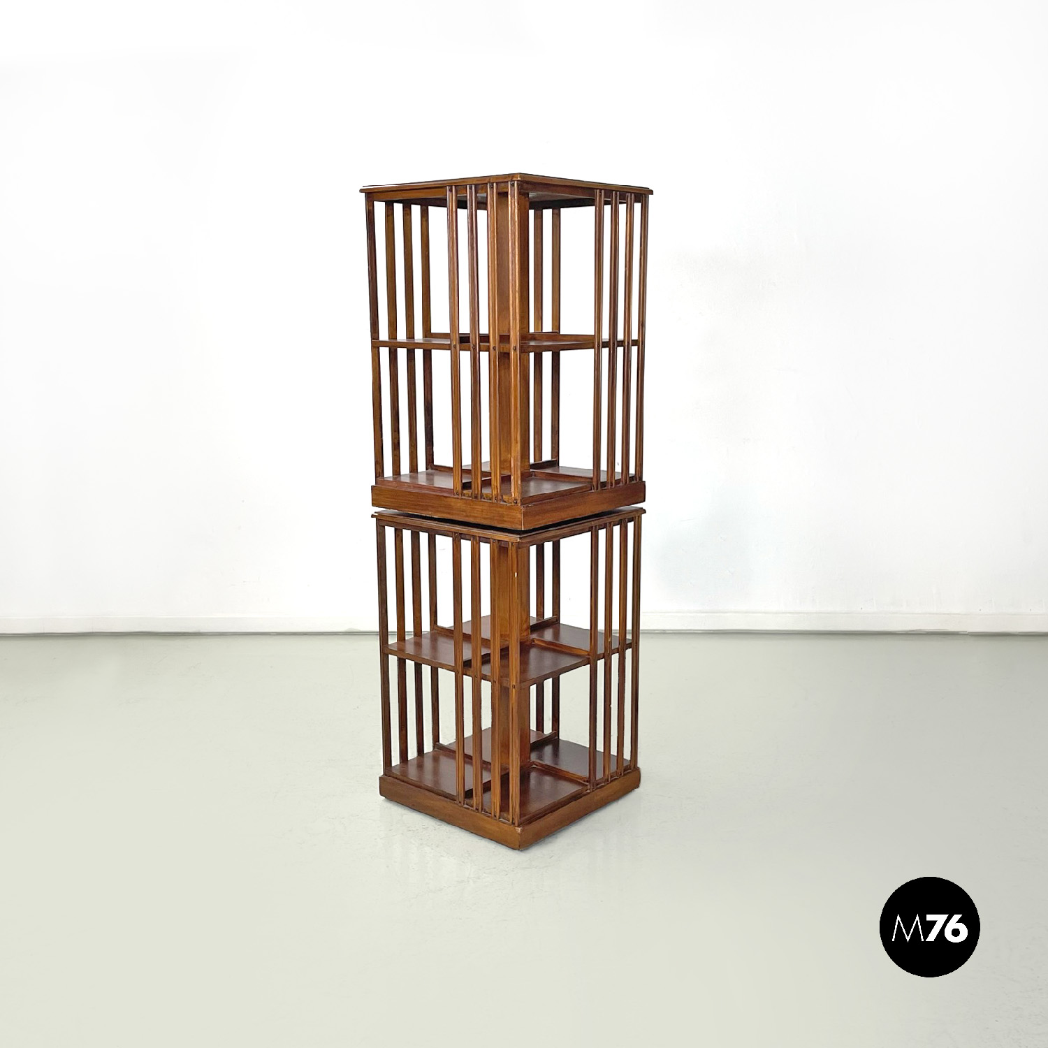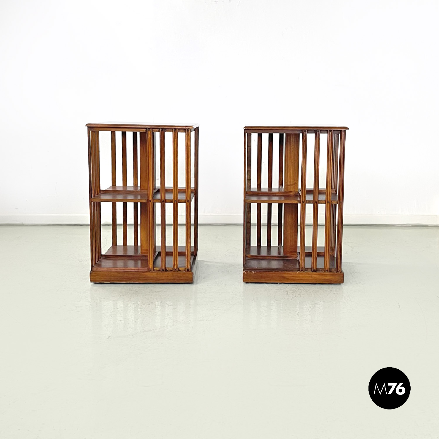 Coppia di librerie girevoli a base quadrata interamente in legno. La struttura presenta un perno centrale i due ripiani sono uniti da una serie di listelli di legno verticali paralleli. Sui ripiani si trovano quattro listelli che fanno da divisori. Sul piano superiore è presente una decorazione floreale. Utilizzabili anche come comodini o tavoli da caffè possono essere impilati.