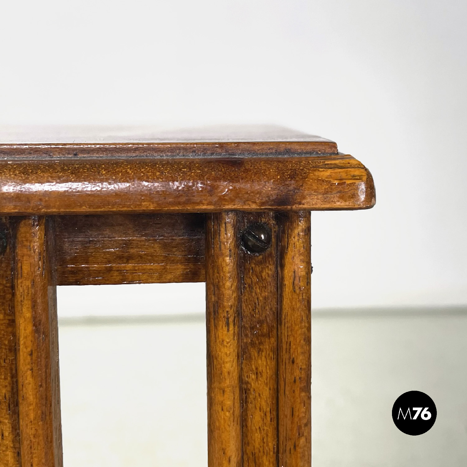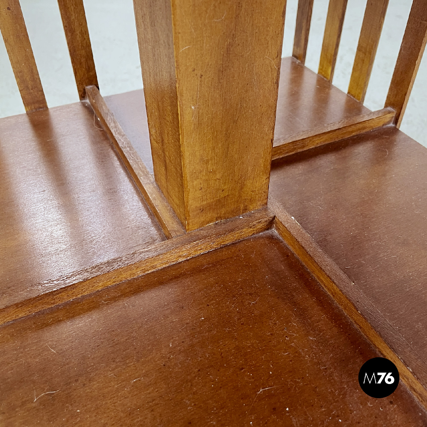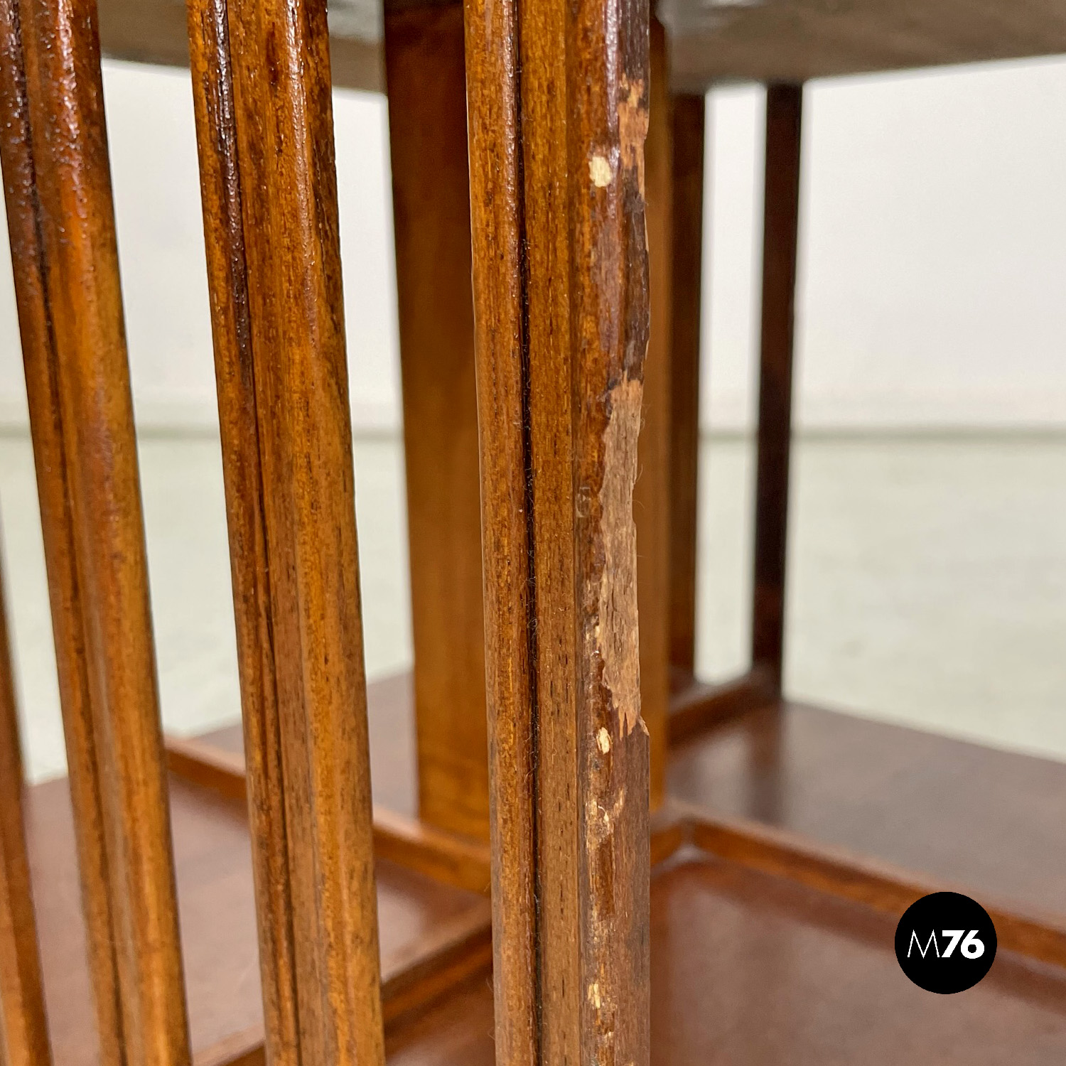 Coppia di librerie girevoli a base quadrata interamente in legno. La struttura presenta un perno centrale i due ripiani sono uniti da una serie di listelli di legno verticali paralleli. Sui ripiani si trovano quattro listelli che fanno da divisori. Sul piano superiore è presente una decorazione floreale. Utilizzabili anche come comodini o tavoli da caffè possono essere impilati.